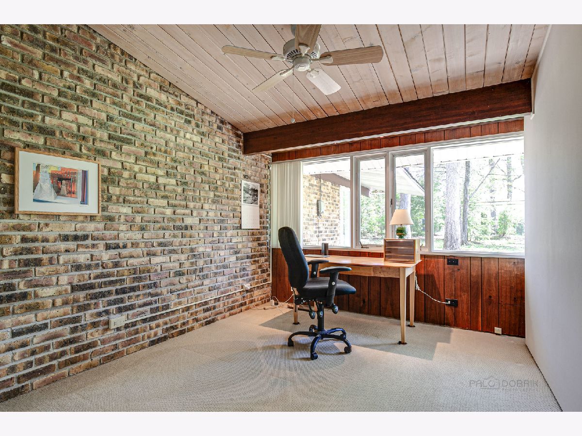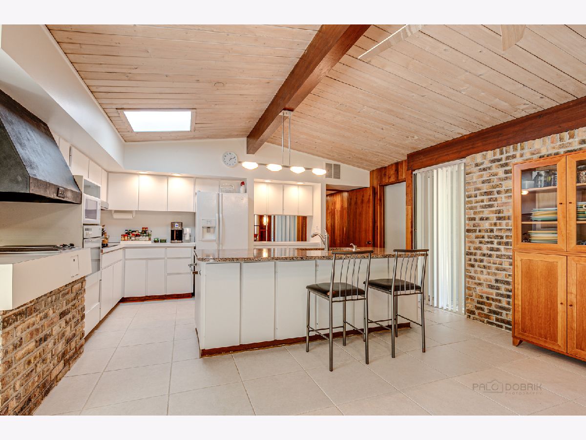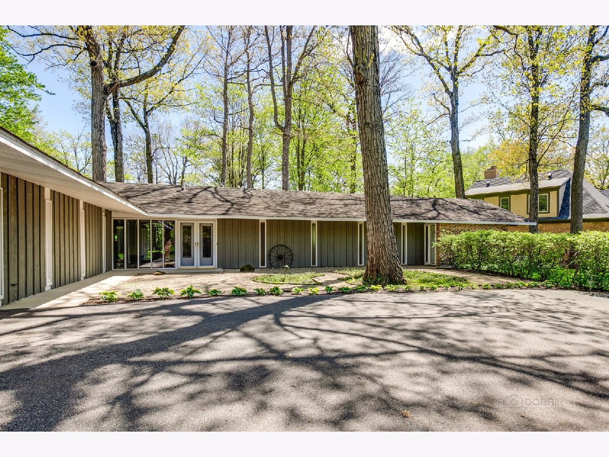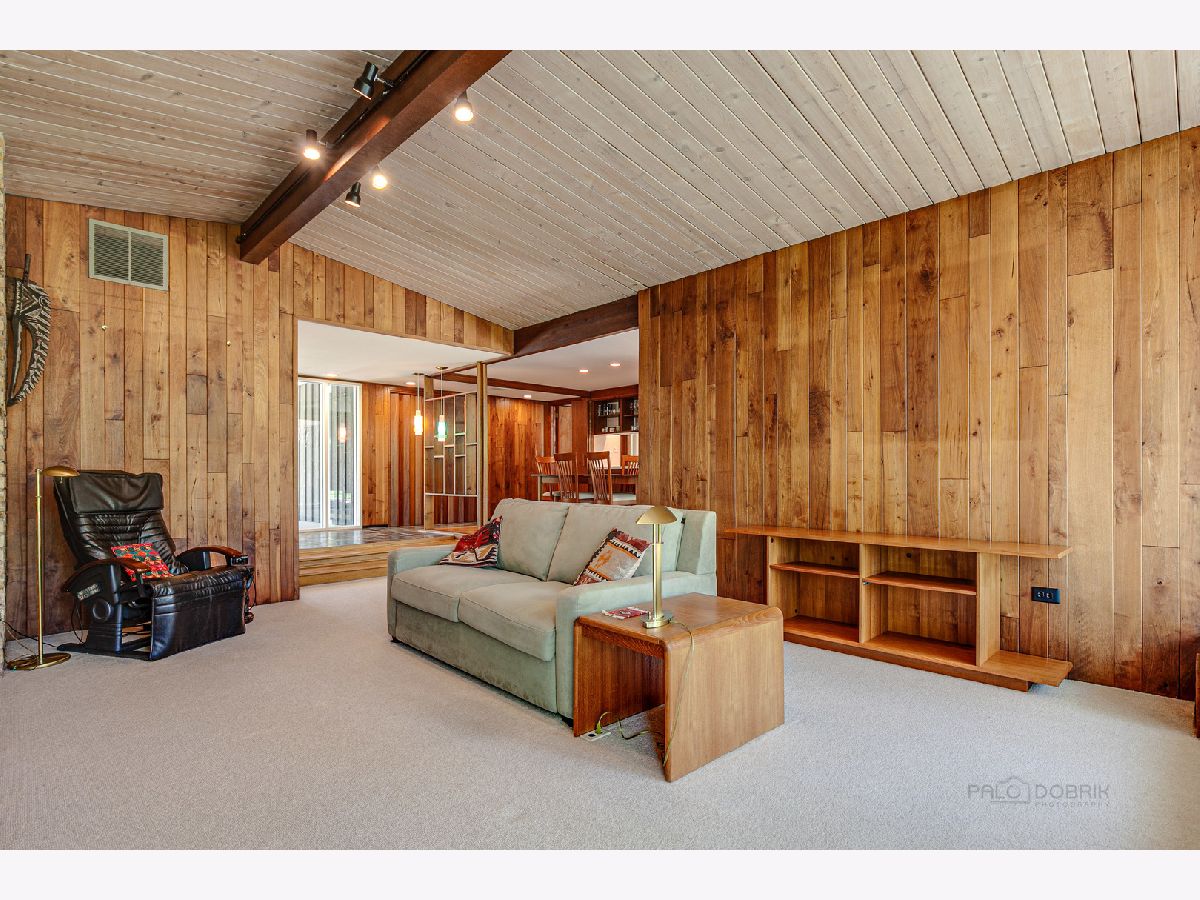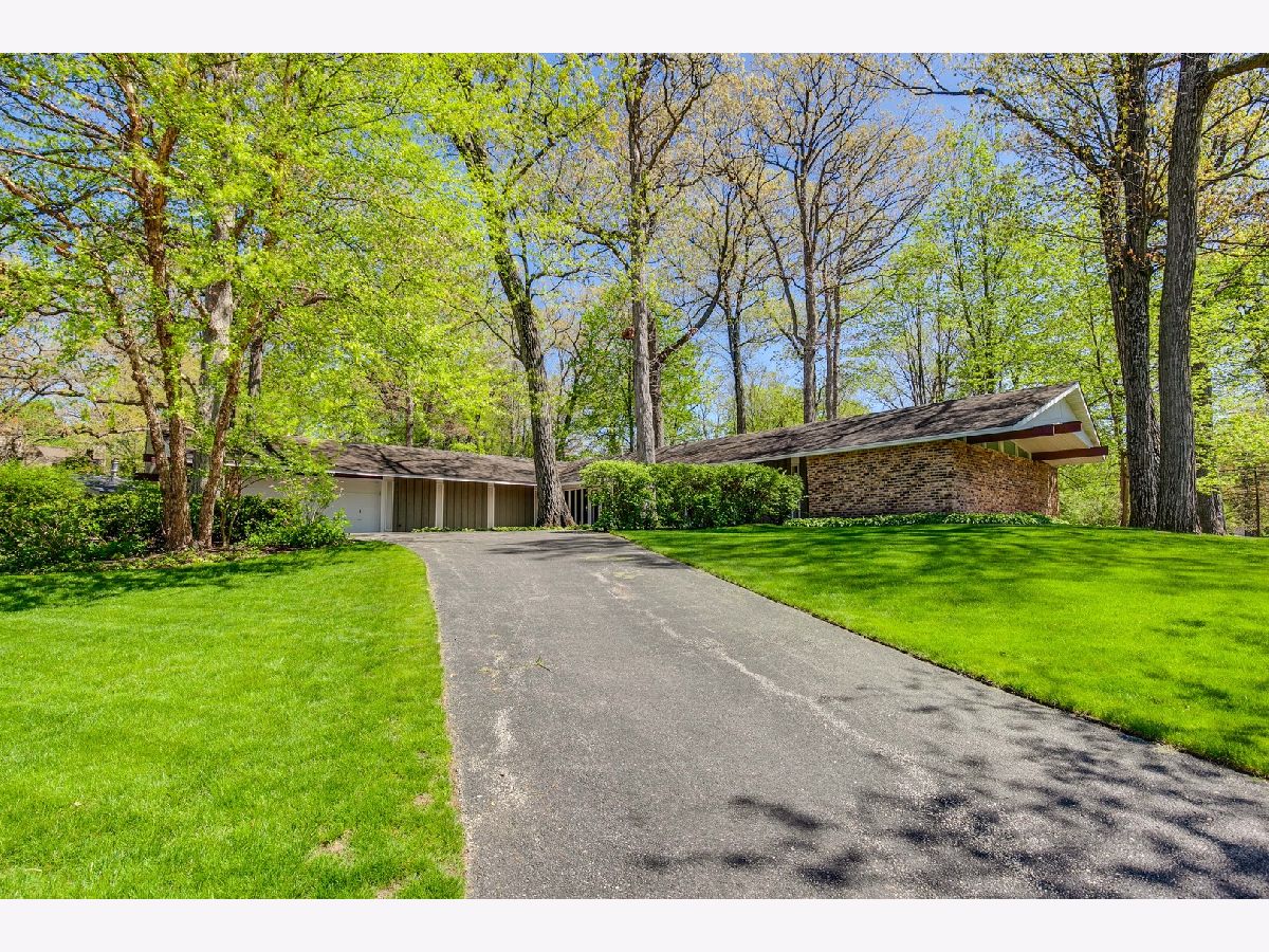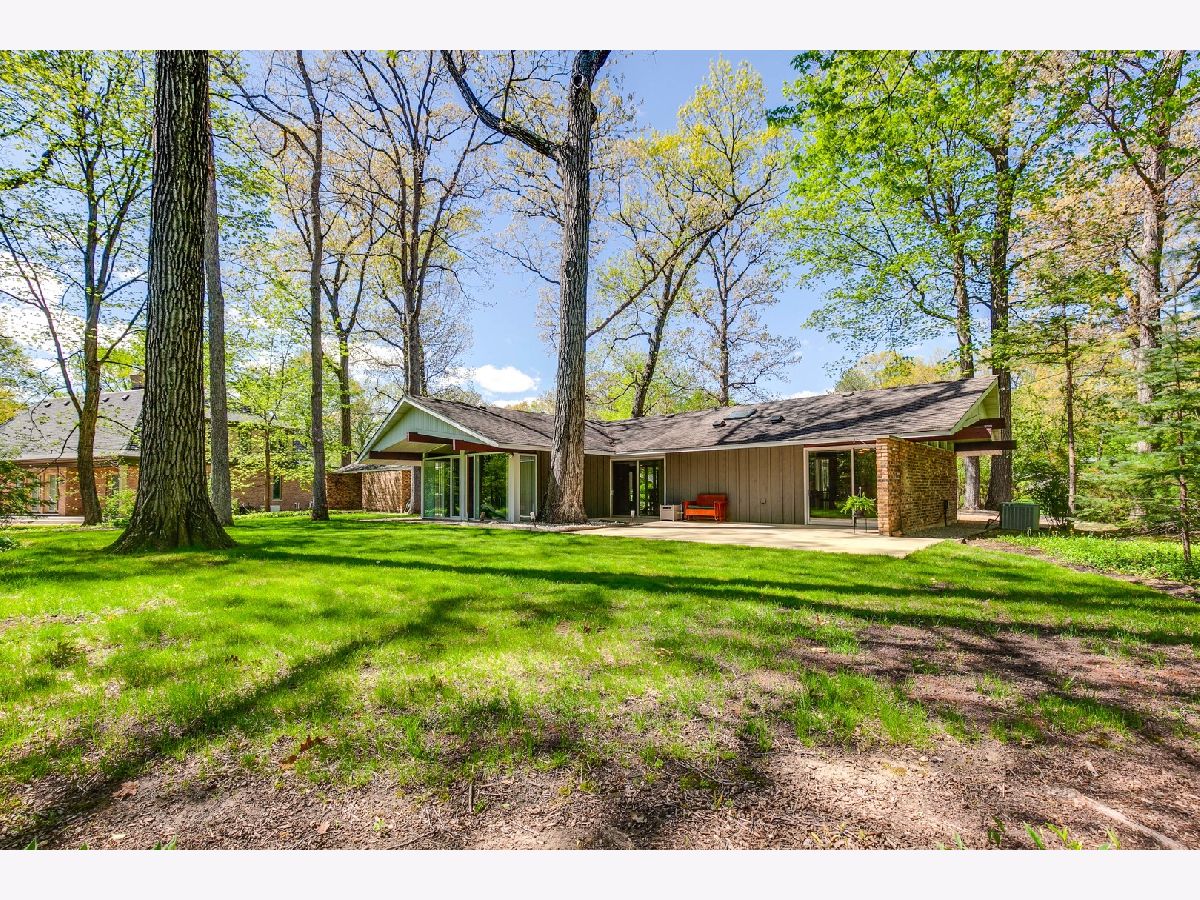 Custom-designed Mid-Century Modern home perfectly situated on half-acre lot with mature trees. Living room has vaulted ceiling with exposed wood beams, oversized fireplace, and wall of windows provides an abundance of natural light. Adjacent dining room also offers beautiful backyard views. Kitchen features new skylight, white cabinetry, center island, plenty of space for an eat in/hang out area and sliding door to rear patio. Bonus room with laundry area next to kitchen and is perfect for office, exercise or family room. Primary bedroom features vaulted ceiling, private patio and full bath with double vanity. Two additional bedrooms and full hall bath. Other features include exposed brick walls, quarter-inch tongue and groove walnut walls, ample storage space, lots of natural light and attached 2-car garage. Spacious backyard for outdoor entertaining. Located near Spring Lake Park, forest preserves and award-winning schools! This unique home has it all!