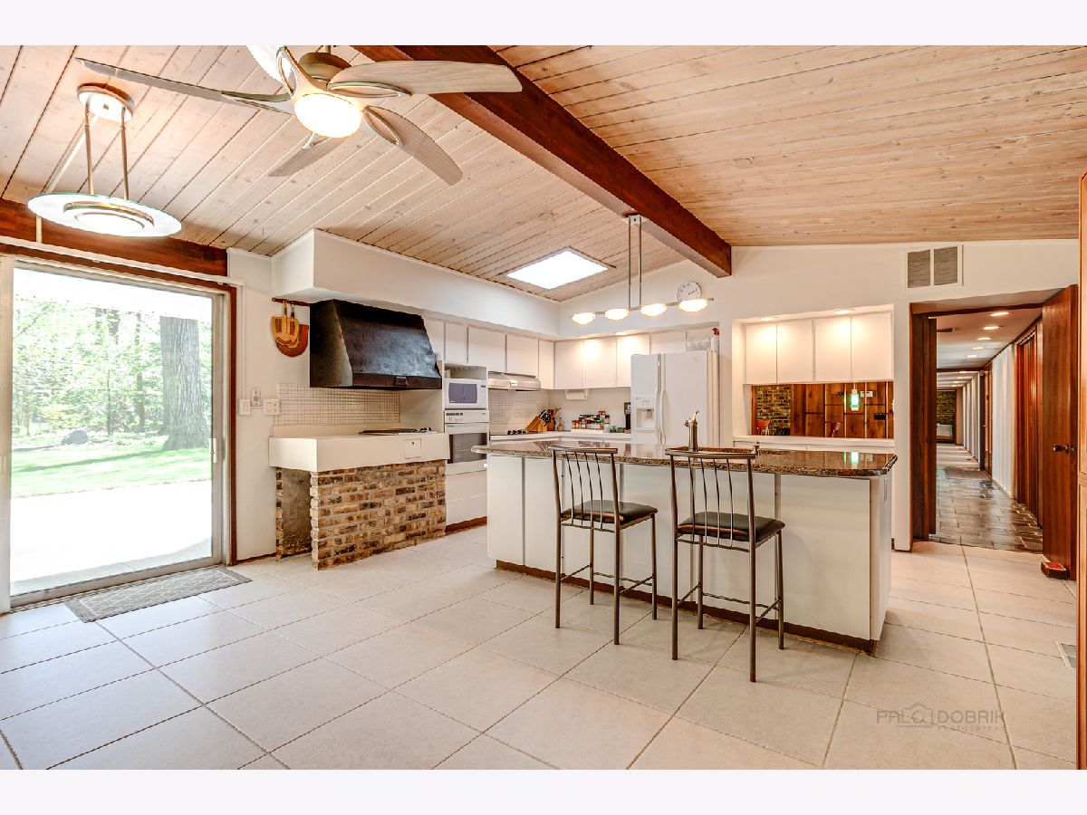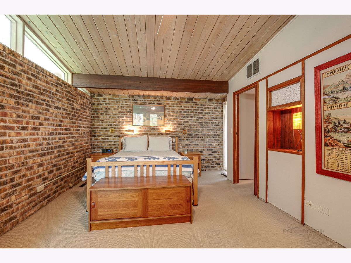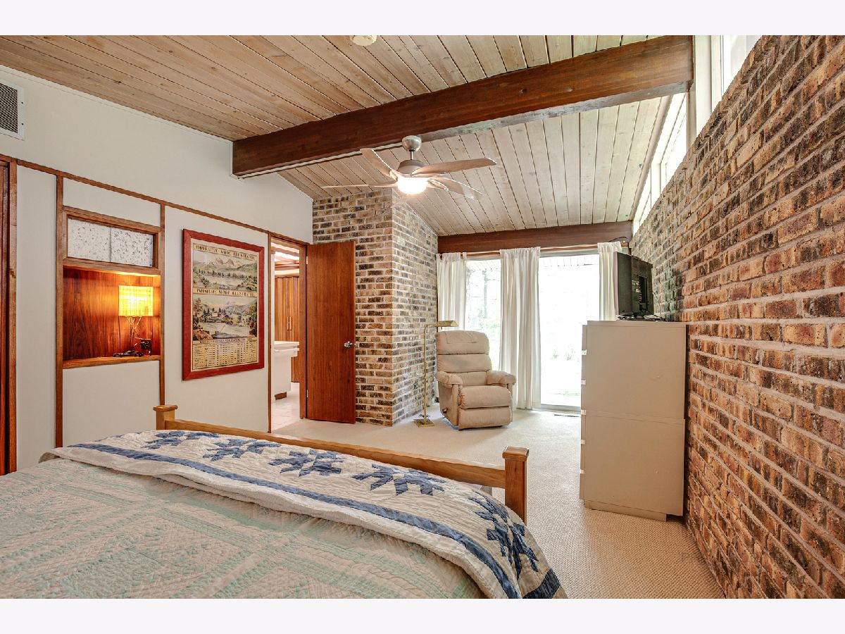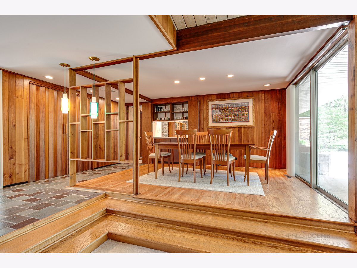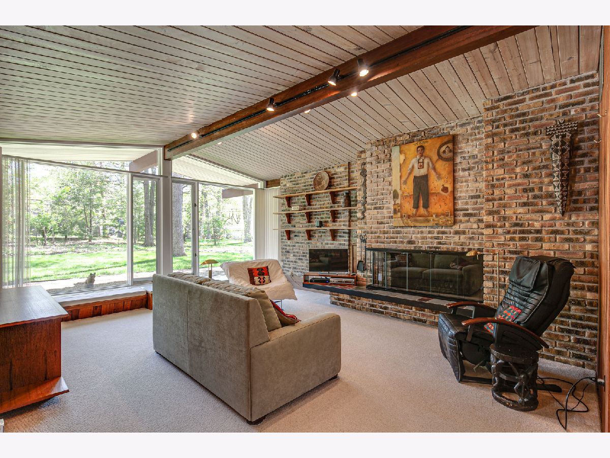 Custom-designed Mid-Century Modern home perfectly situated on half-acre lot with mature trees. Living room has vaulted ceiling with exposed wood beams, oversized fireplace, and wall of windows provides an abundance of natural light. Adjacent dining room also offers beautiful backyard views. Kitchen features new skylight, white cabinetry, center island, plenty of space for an eat in/hang out area and sliding door to rear patio. Bonus room with laundry area next to kitchen and is perfect for office, exercise or family room. Primary bedroom features vaulted ceiling, private patio and full bath with double vanity. Two additional bedrooms and full hall bath. Other features include exposed brick walls, quarter-inch tongue and groove walnut walls, ample storage space, lots of natural light and attached 2-car garage. Spacious backyard for outdoor entertaining. Located near Spring Lake Park, forest preserves and award-winning schools! This unique home has it all!