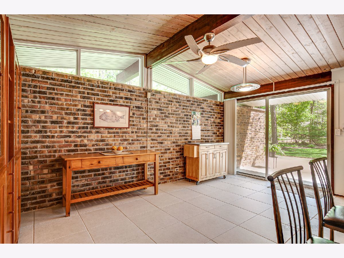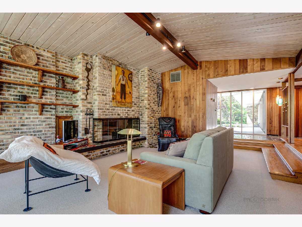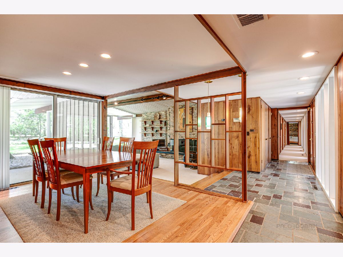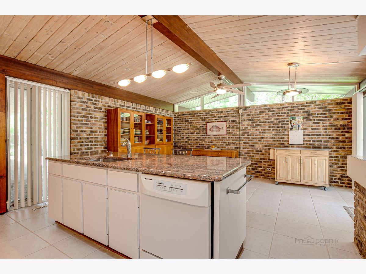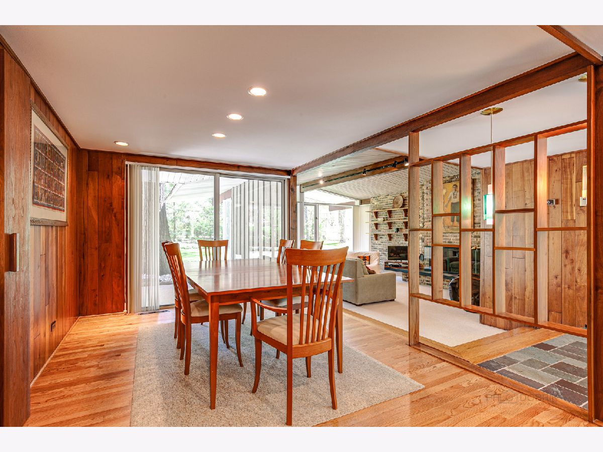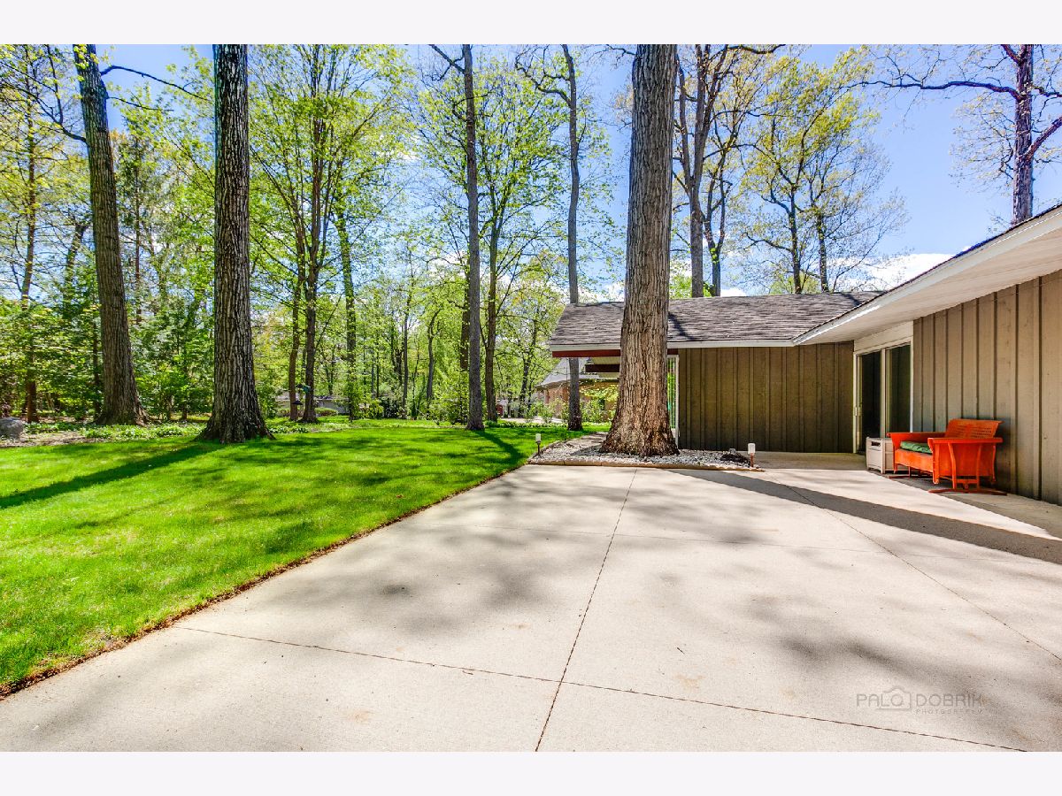 Custom-designed Mid-Century Modern home perfectly situated on half-acre lot with mature trees. Living room has vaulted ceiling with exposed wood beams, oversized fireplace, and wall of windows provides an abundance of natural light. Adjacent dining room also offers beautiful backyard views. Kitchen features new skylight, white cabinetry, center island, plenty of space for an eat in/hang out area and sliding door to rear patio. Bonus room with laundry area next to kitchen and is perfect for office, exercise or family room. Primary bedroom features vaulted ceiling, private patio and full bath with double vanity. Two additional bedrooms and full hall bath. Other features include exposed brick walls, quarter-inch tongue and groove walnut walls, ample storage space, lots of natural light and attached 2-car garage. Spacious backyard for outdoor entertaining. Located near Spring Lake Park, forest preserves and award-winning schools! This unique home has it all!