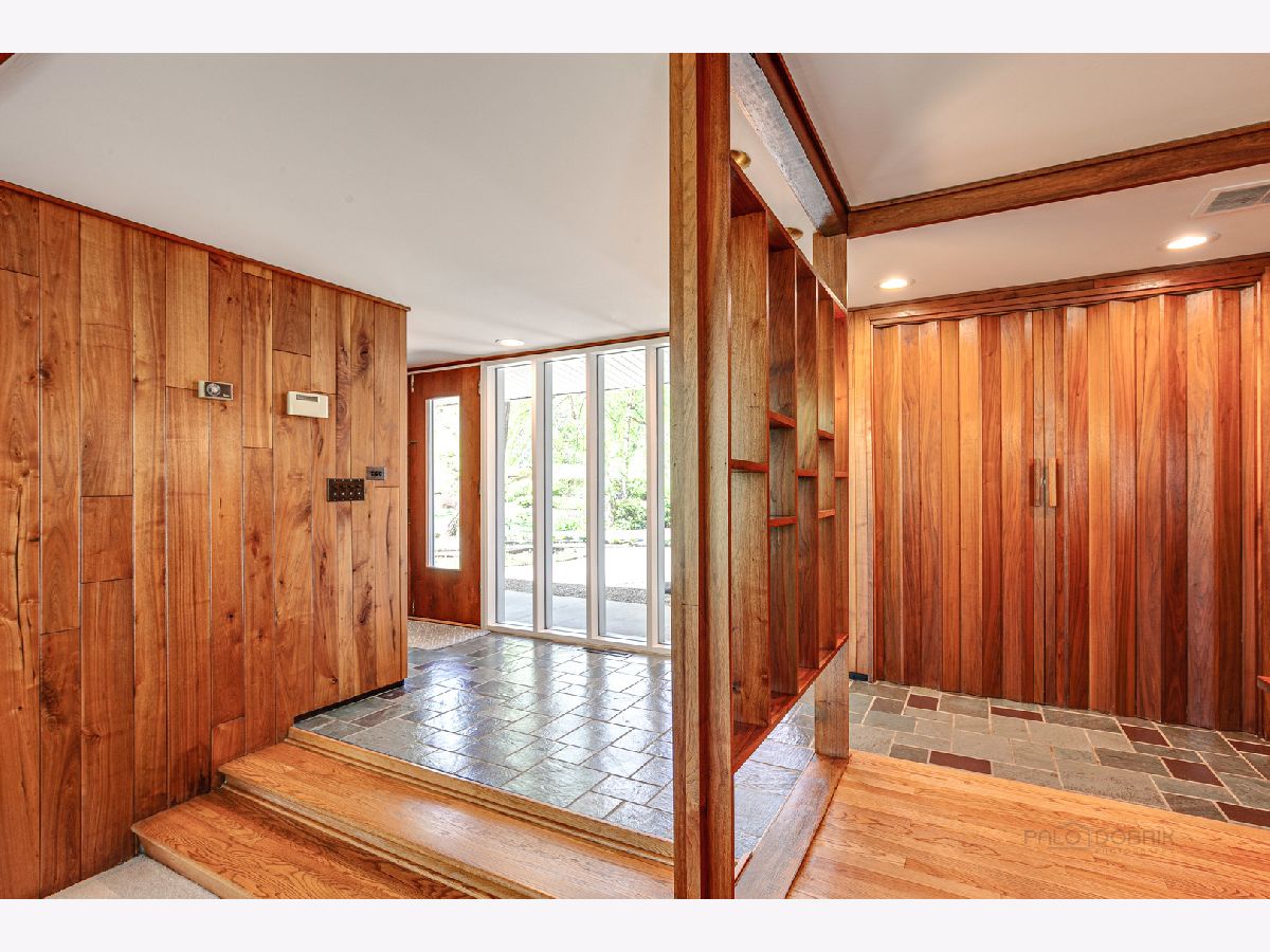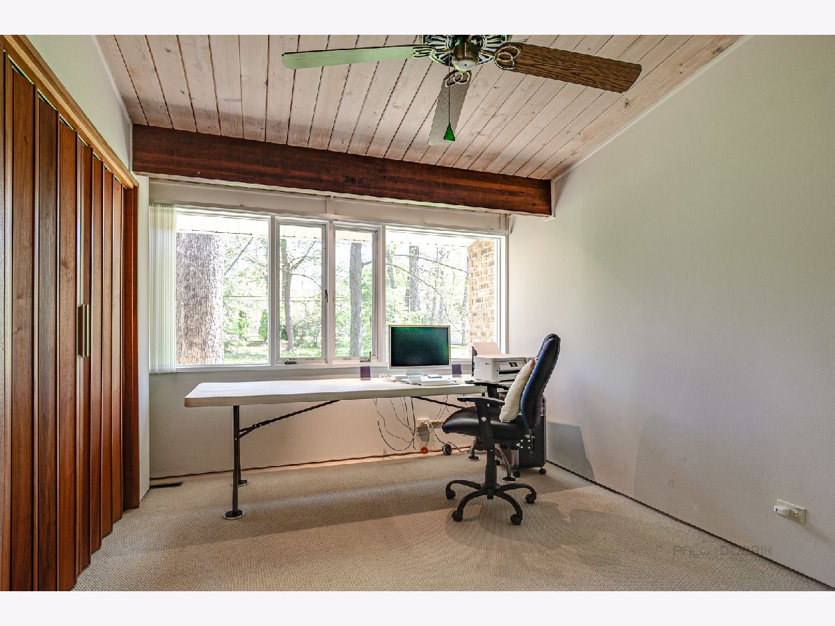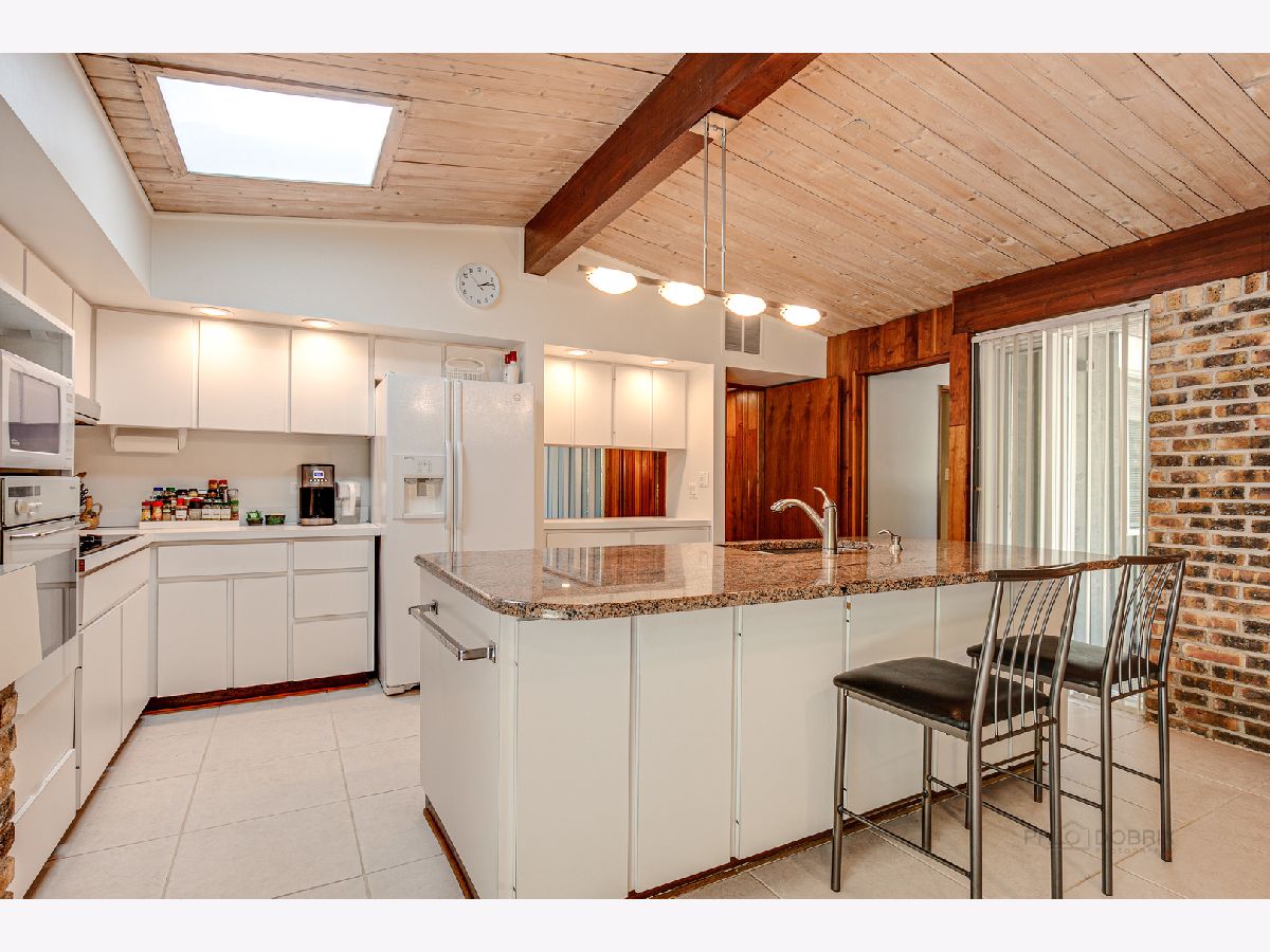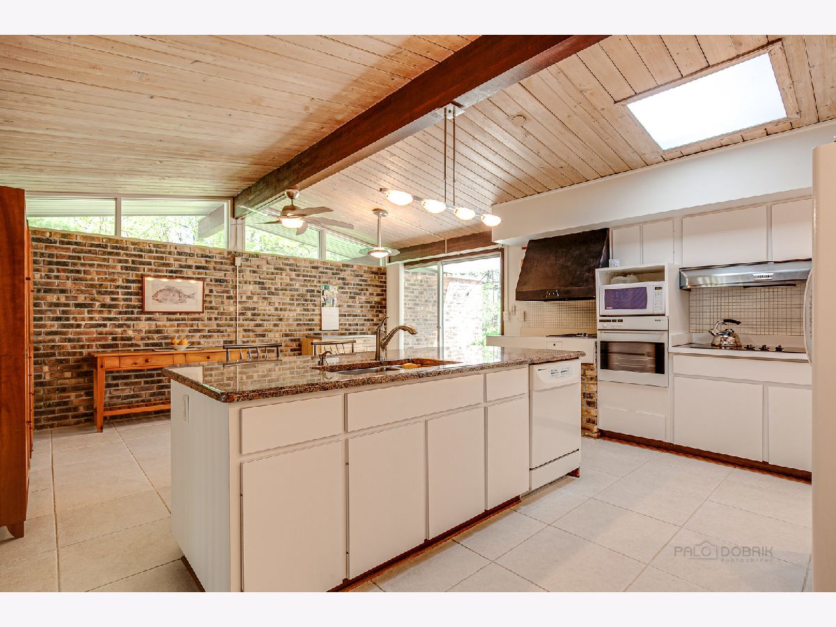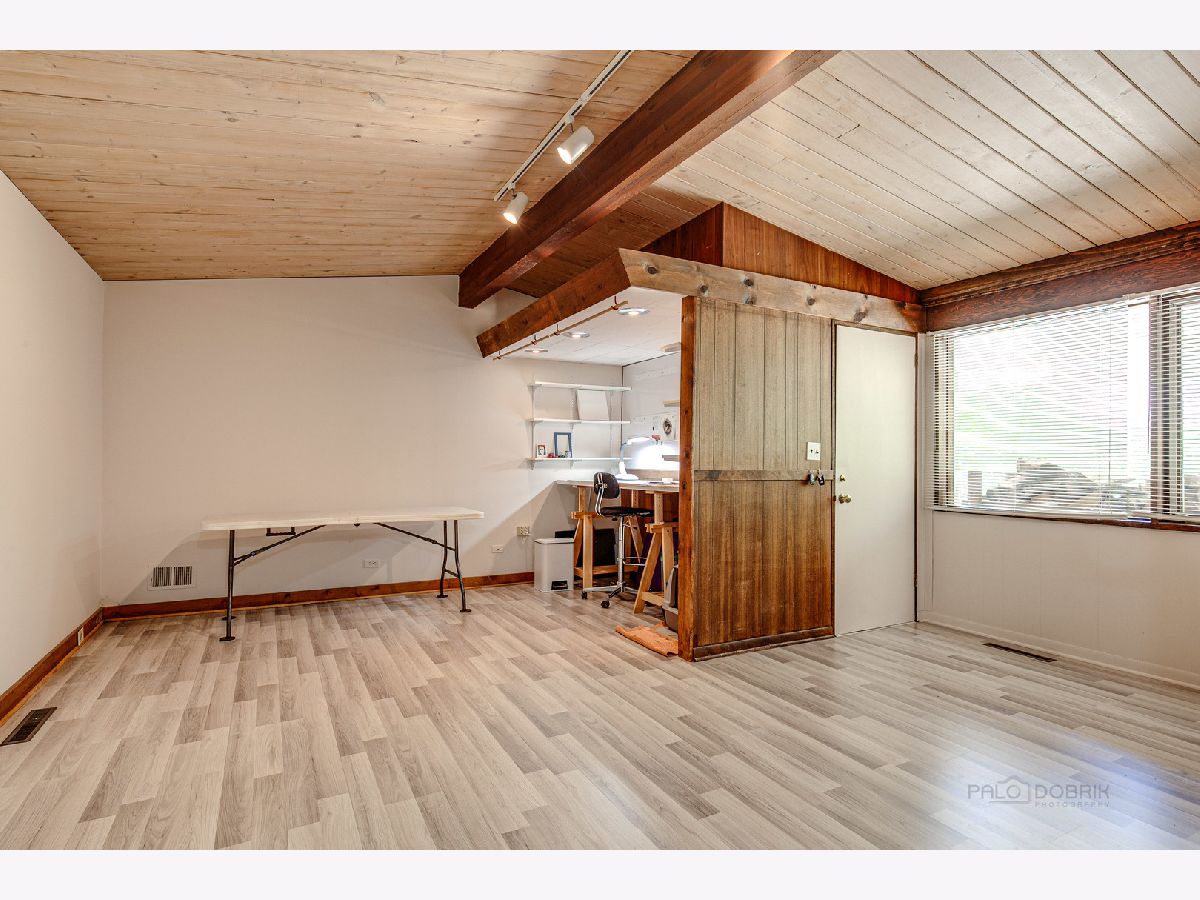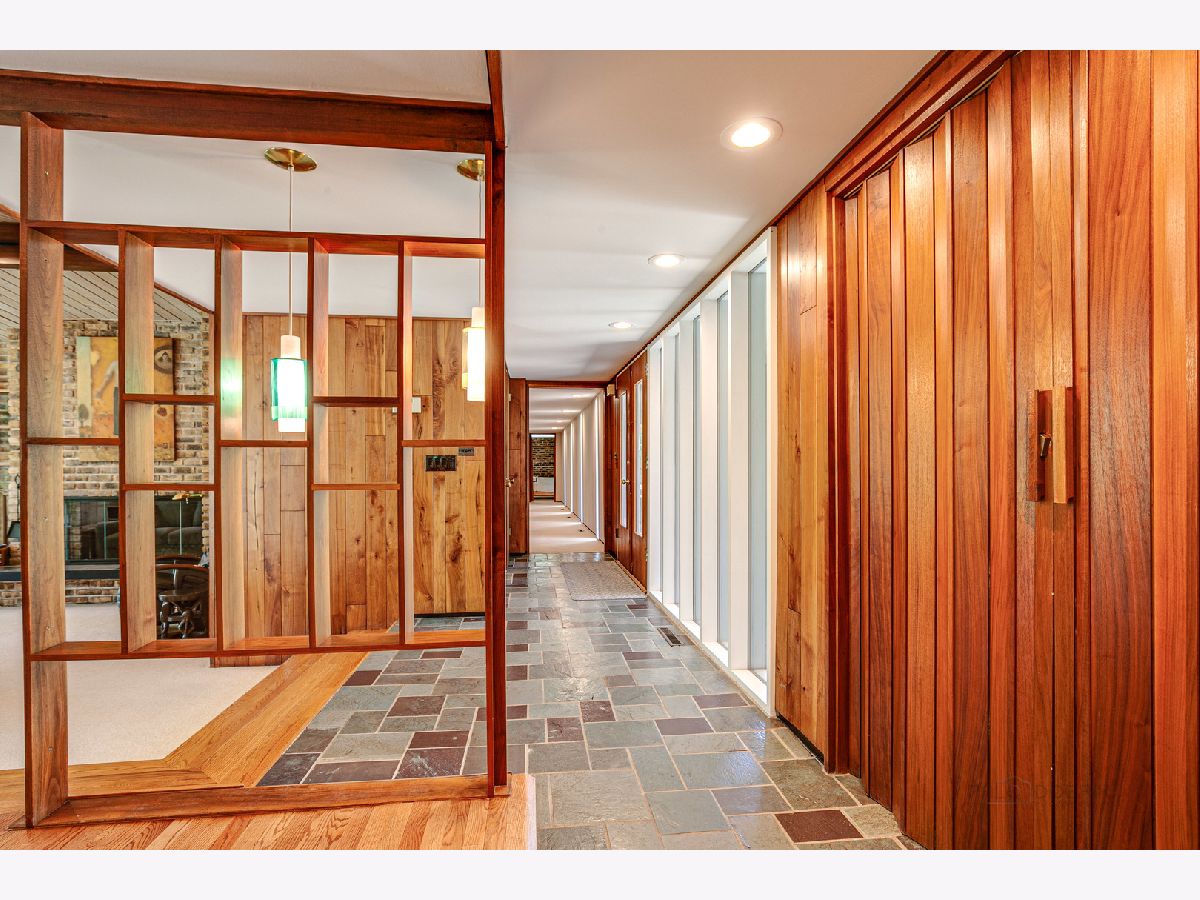 Custom-designed Mid-Century Modern home perfectly situated on half-acre lot with mature trees. Living room has vaulted ceiling with exposed wood beams, oversized fireplace, and wall of windows provides an abundance of natural light. Adjacent dining room also offers beautiful backyard views. Kitchen features new skylight, white cabinetry, center island, plenty of space for an eat in/hang out area and sliding door to rear patio. Bonus room with laundry area next to kitchen and is perfect for office, exercise or family room. Primary bedroom features vaulted ceiling, private patio and full bath with double vanity. Two additional bedrooms and full hall bath. Other features include exposed brick walls, quarter-inch tongue and groove walnut walls, ample storage space, lots of natural light and attached 2-car garage. Spacious backyard for outdoor entertaining. Located near Spring Lake Park, forest preserves and award-winning schools! This unique home has it all!