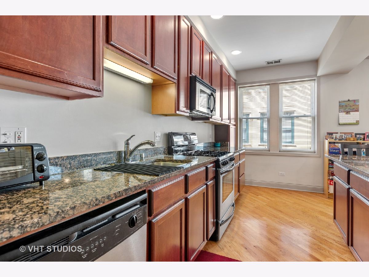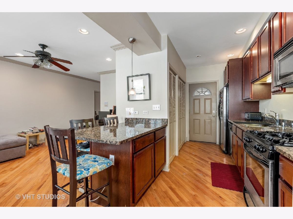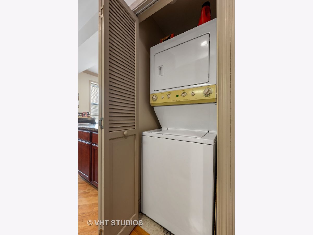 Updated 1 bedroom/1 bath on tree lined Keystone! Open living room with fireplace with gorgeous mantle.Diagonal hardwood flooring adds to the charm. Kitchen with breakfast bar, SS appliances and cherry cabinets. Updated spacious bathroom Large bedroom with closet and plenty of storage. In unit washer/dryer. Fantastic walking to the blue line . Metra and close to expressway. Tucked in a quiet street close to amenities. Financially solid courtyard building.
