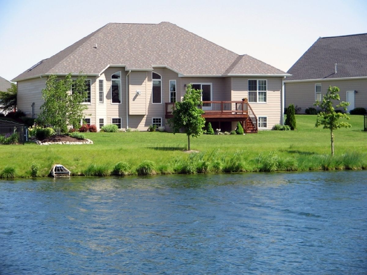 FABULOUS custom ranch built to perfection with waterfront vistas! Spectacular backyard setting provides a stunning pond view embraced by appealing landscapes! Experience style & decor with unique architectural features & stunning designer touches. Be welcomed by flagstone entry, artistic brick & stucco exterior design completed with sturdy cement composite siding. Hand-painted foyer ceiling is a breathtaking mural leading to formal dining room & vaulted great room with eye-catching, gas fireplace flanked by custom transom windows. As an added bonus the sellers are offering a beautiful wall entertainment center and sofa! Enjoy water views & vivid sunsets from custom deck with metal spindles. Brazilian cherry floors flow through common areas with porcelain tile in well appointed kitchen that's complimented by maple cabinets, granite tops, glass back-splash, planning desk center & butler server. French doors open into Master Suite separate wing showcasing private foyer, Kohler soaker tub, skylight & separate tiled shower. Half bath powder room boasts retro, barber-style sink. Andersen windows, UV tinted protected rear windows, security system, solid core doors, built-in speakers, 3-piece moldings, Roman shades, English look-out basement & extended garage! Abundant professional landscaping, underground sprinkler system, concrete driveway, cul-de-sac location and backyard retreat with panoramic water view await you!