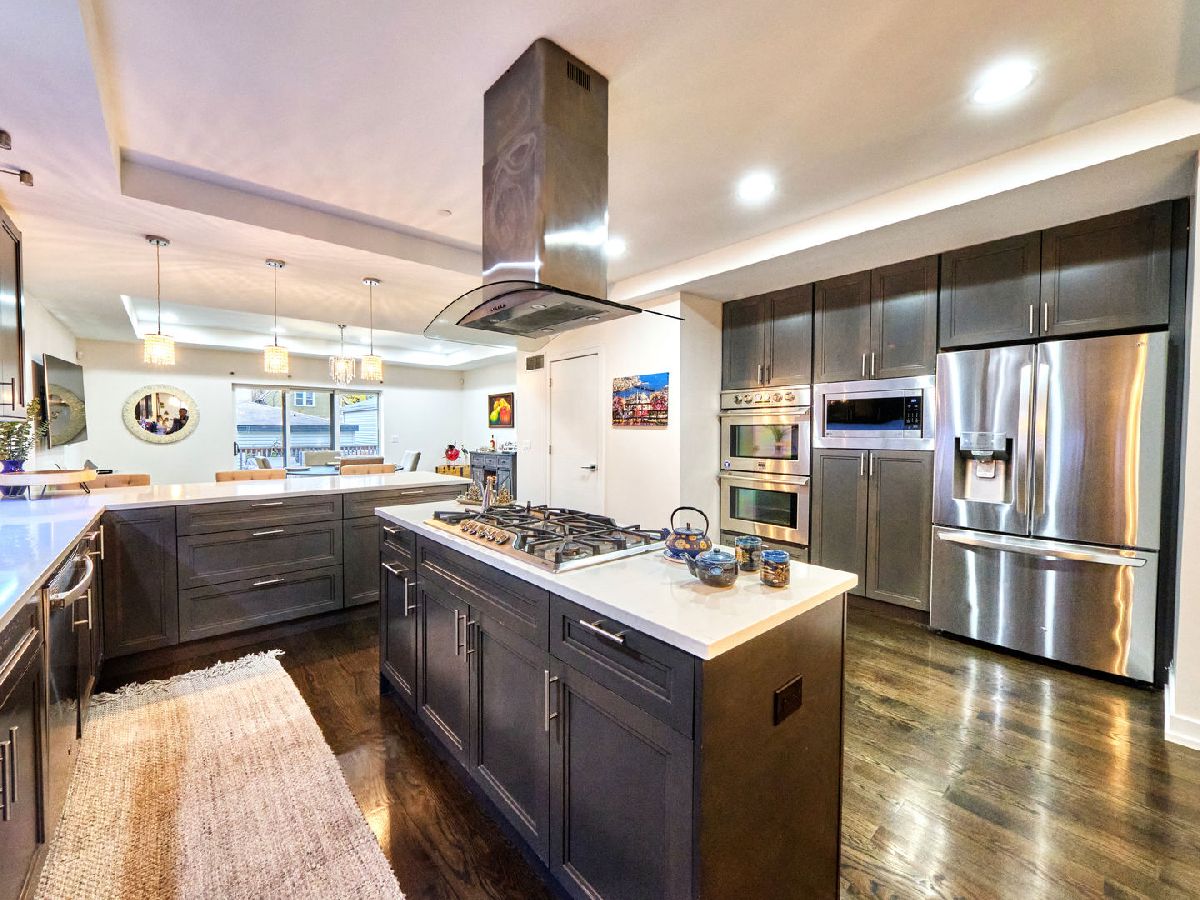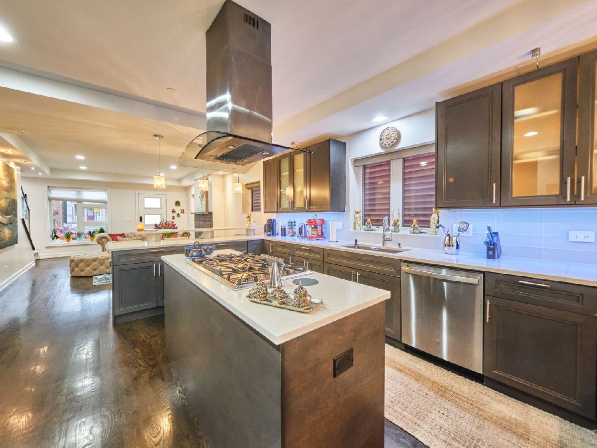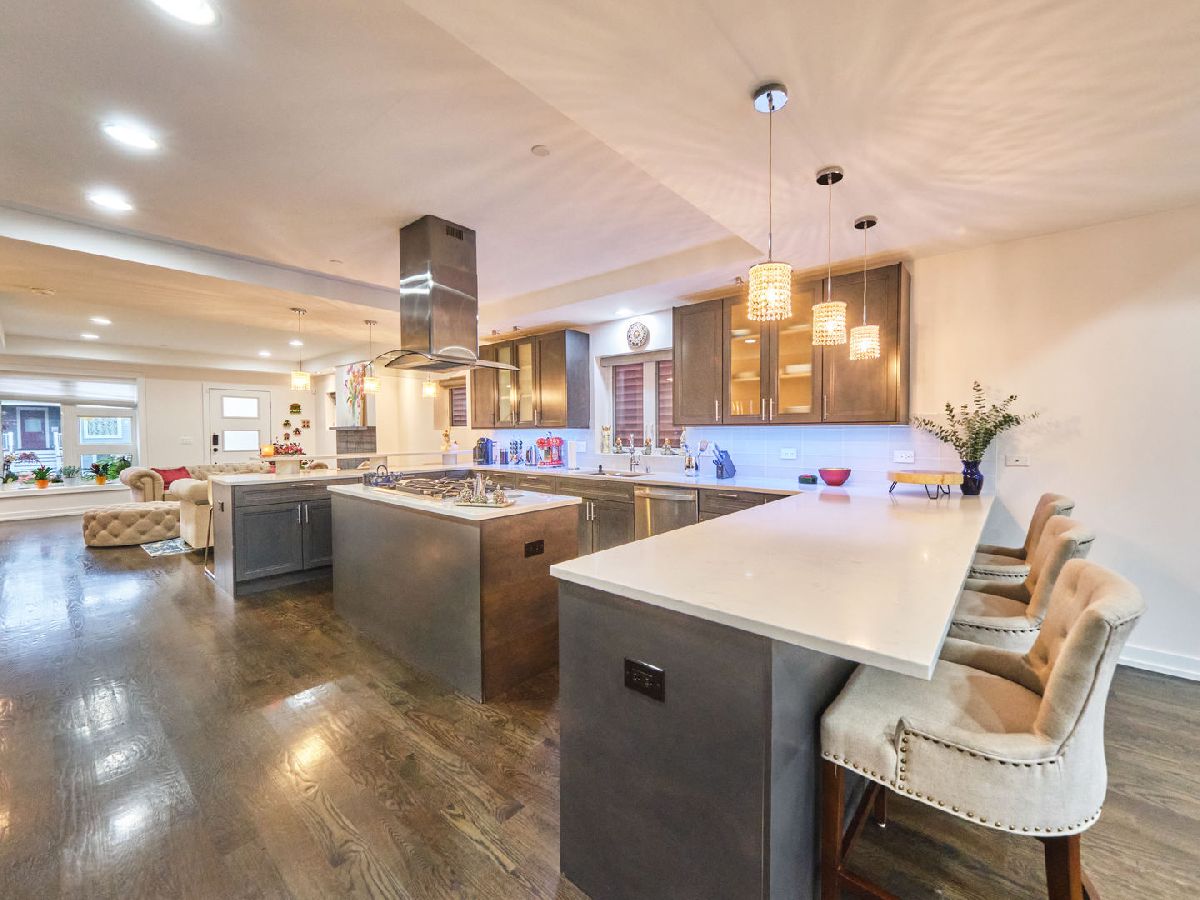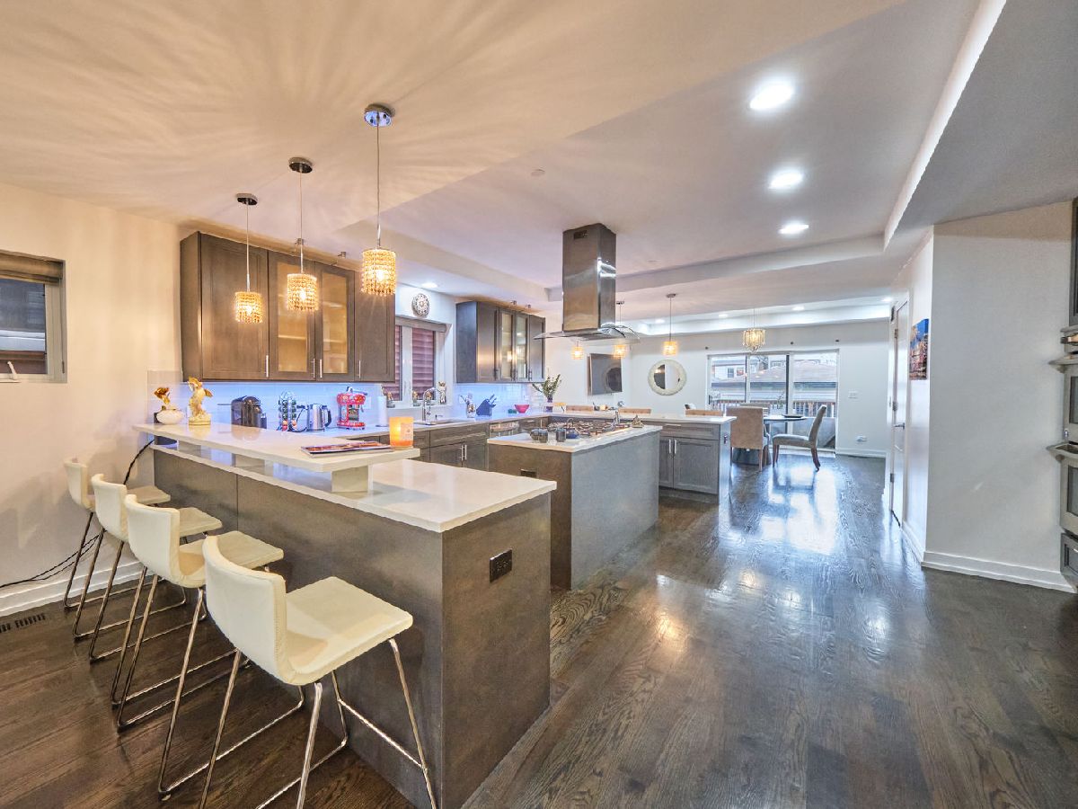 Irving Park Single Family home with modern finishes. Large open concept first floor, with large open kitchen with custom wood cabinets, quartz counter tops with a a gas range and floating hood and a separate wall with double oven, fridge and microwave all neatly tucked away and built in with great cabinet space. Large dining area that opens to back deck and yard with new backyard fence and front fence added. Upstairs features 3 large bedrooms, 2 full baths. Primary bedroom with skylights and bathroom with separate shower/tub and double vanity. Finished basement with nice family room, 4th bedroom and den and plus full bath. Washer & dryer conveniently located on 2nd floor with a laundry hook up in the lower level. Dual zoned HVAC. Two car garage. This home has a nice back deck plus great yard space. Come check it out!