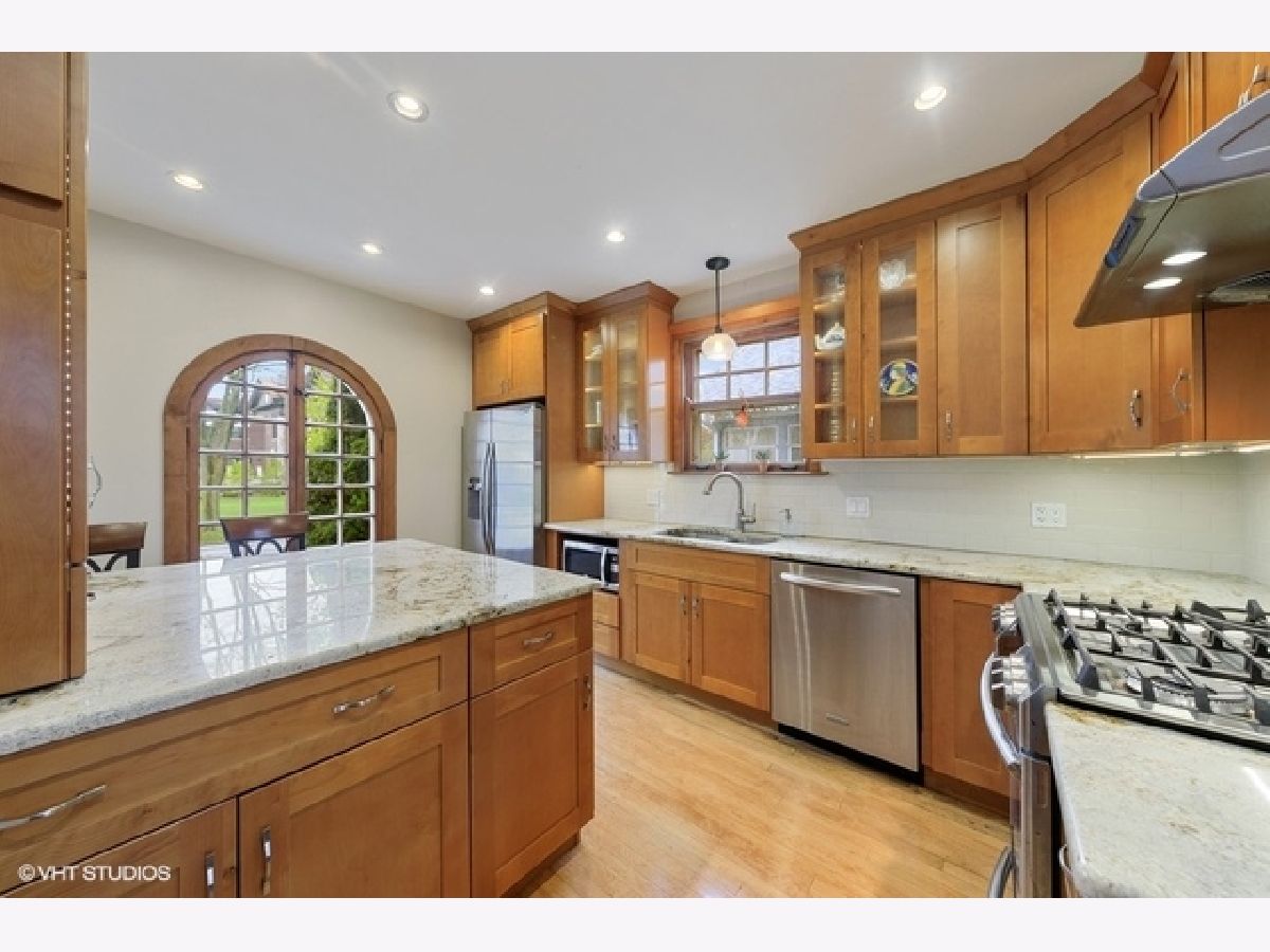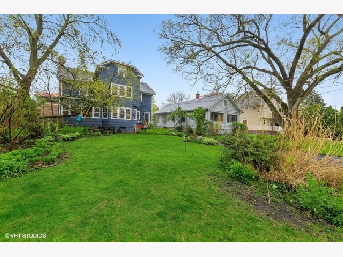 Walk to town and Metra from this super charming 4 bedroom, 2 1/2 bath 2-story! Fresh paint inside and out. Hardwoods on main and second floor and carpet on 3rd floor walk-up attic! Entry foyer with wood banister staircase to second floor. Big living room with fireplace, loads of windows, built-in bookcases that frame an in-home office space. Big spacious dining room overlooks backyard through a wall of windows. Newer kitchen has a large peninsula island, lots of cabinet cupboard space topped with granite and tile backsplash. 1/2 bath powder just inside covered back porch. Full basement with a toilet closet, family room, utility room, and door to outside. Basement is a little rough, but will clean-up well. Side drive to sunny back yard with patio and 2-car garage.