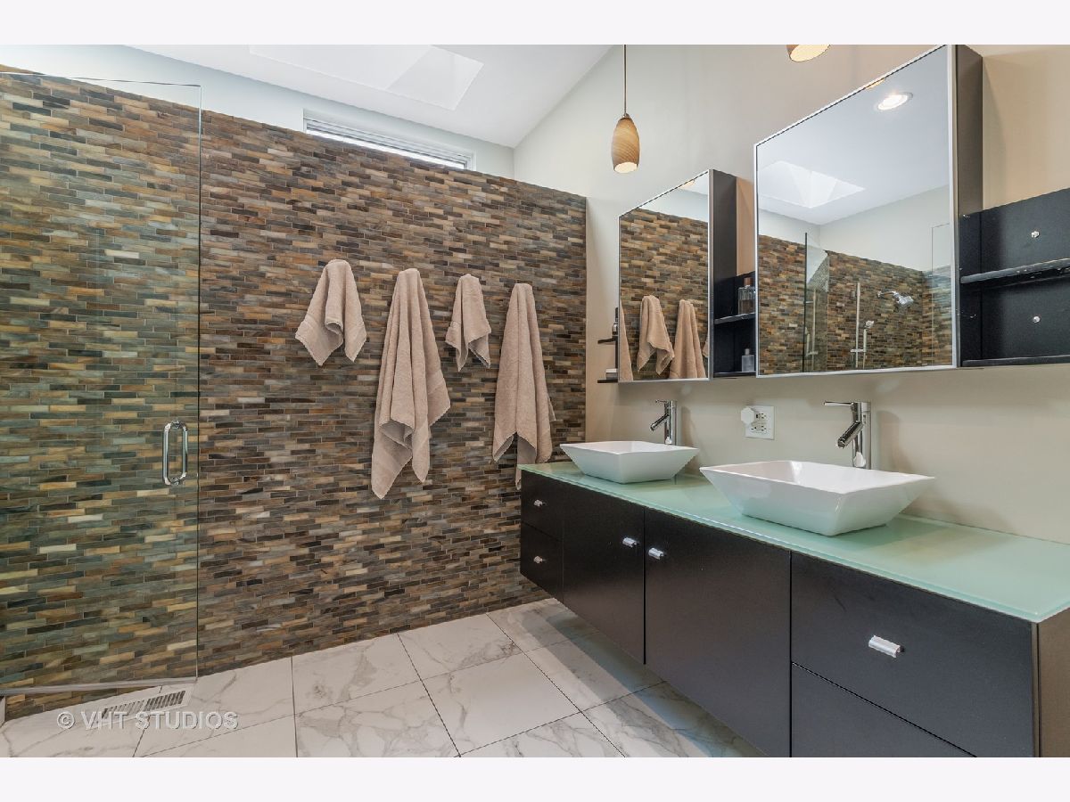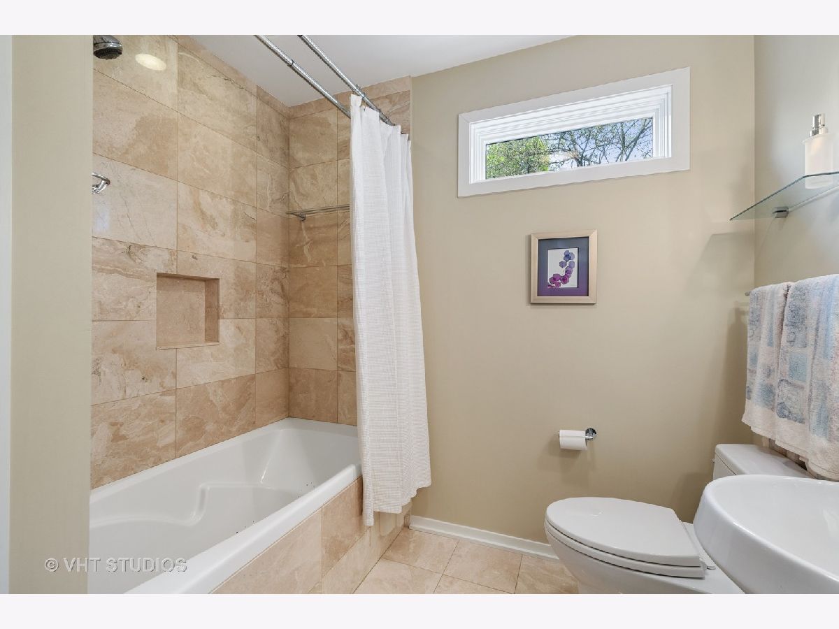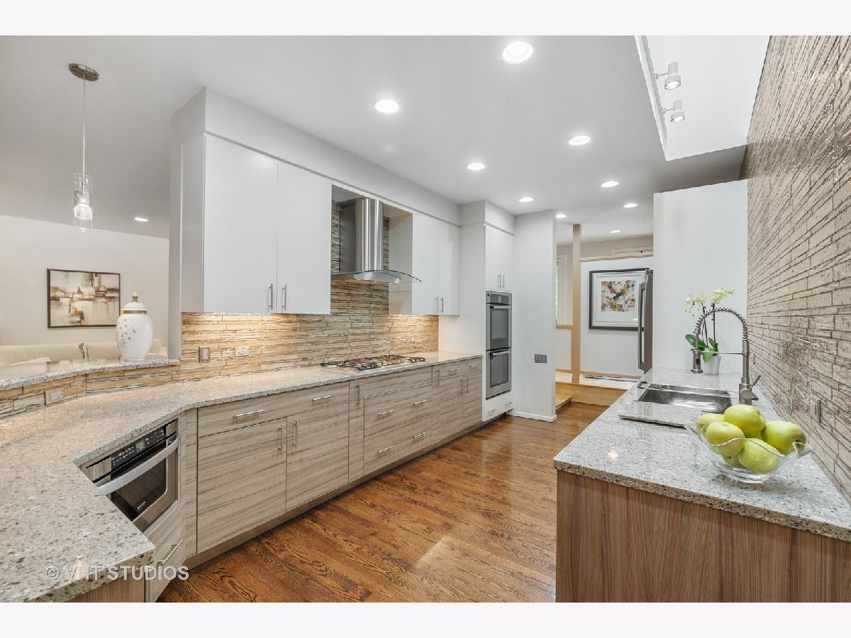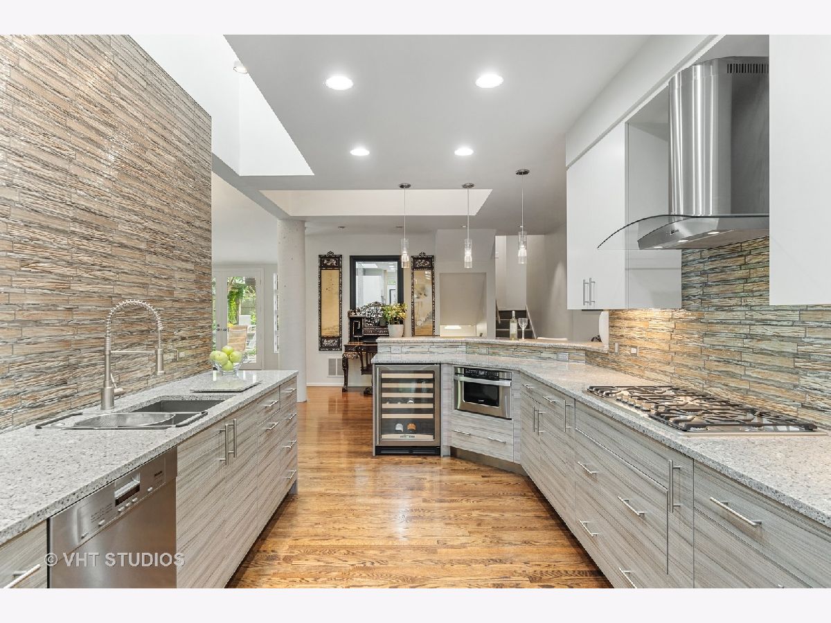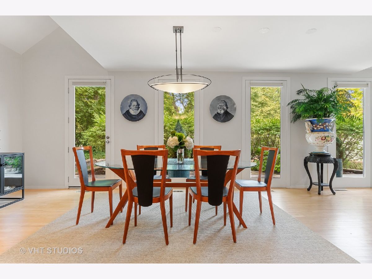 Sold in private network. Welcome to this unique high-end mid-century modern house that has been renovated with a contemporary flair. Located in the Village of Glencoe, one of the most walkable communities of the Northshore, the house sits on a beautifully landscaped plot on a quiet street. It is close to the Chicago Botanical Gardens and the Glencoe beach, at only few blocks to the Metra train station and the village's main street. The house is very versatile and suitable for entertaining and family life, ideal for children and pets. The extended entrance is raised and showcases Jerusalem travertine stone. The space flows throughout the main level thanks to the open floor plan that integrates living, dining, family room, and kitchen into one vibrant space, showcasing hardwood floors. The kitchen is equipped with top brand appliances and quartz stone countertops. The house is spacious and full of light thanks to the high ceilings, skylights, and windows that provide enticing views to the front and the back yards. The staircase splits half level up to three well sized bedrooms and two full bathrooms and half level down to a large multipurpose room, powder room, and laundry with access to the backyard. The main bedroom suite is located on the top floor, that also includes a seating area, walk-in closet with built-in shelving, and full bathroom. A one of a kind half-moon panoramic window in the bedroom oversees the manicured front yard and the street beyond. The backyard features a wooden deck and a seating paved patio. The house has been recently upgraded with split zone heating and cooling systems, front and backyard irrigation system, and a security system.
