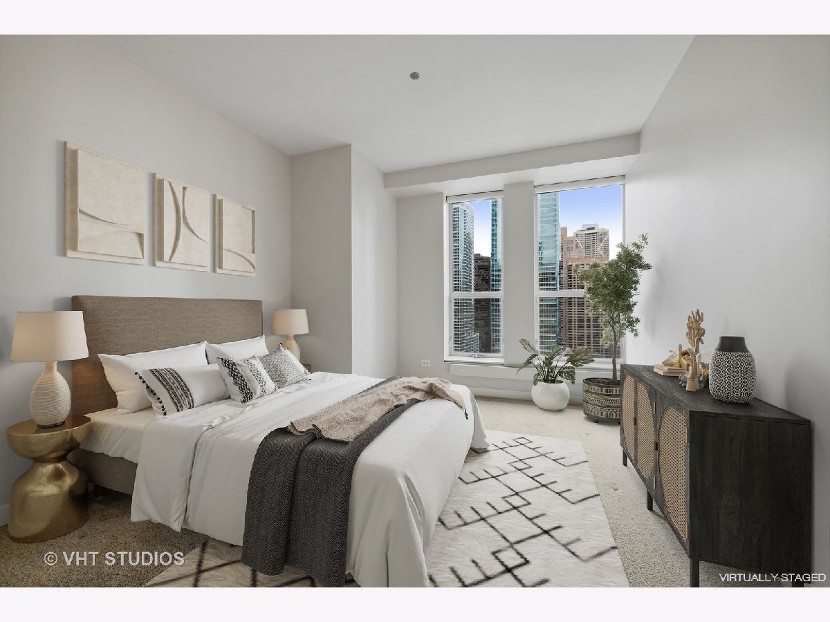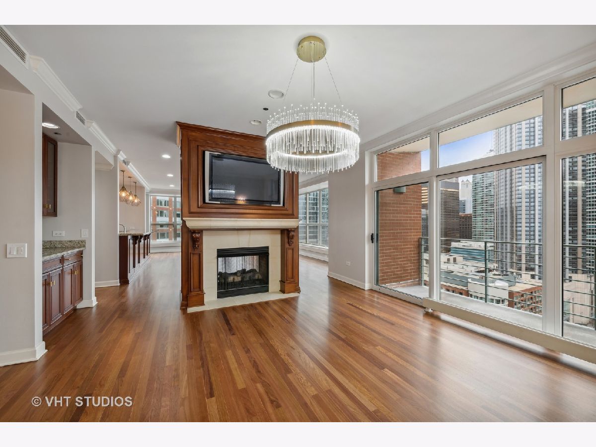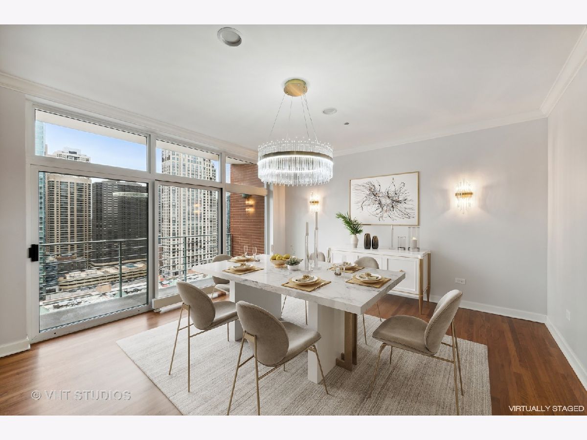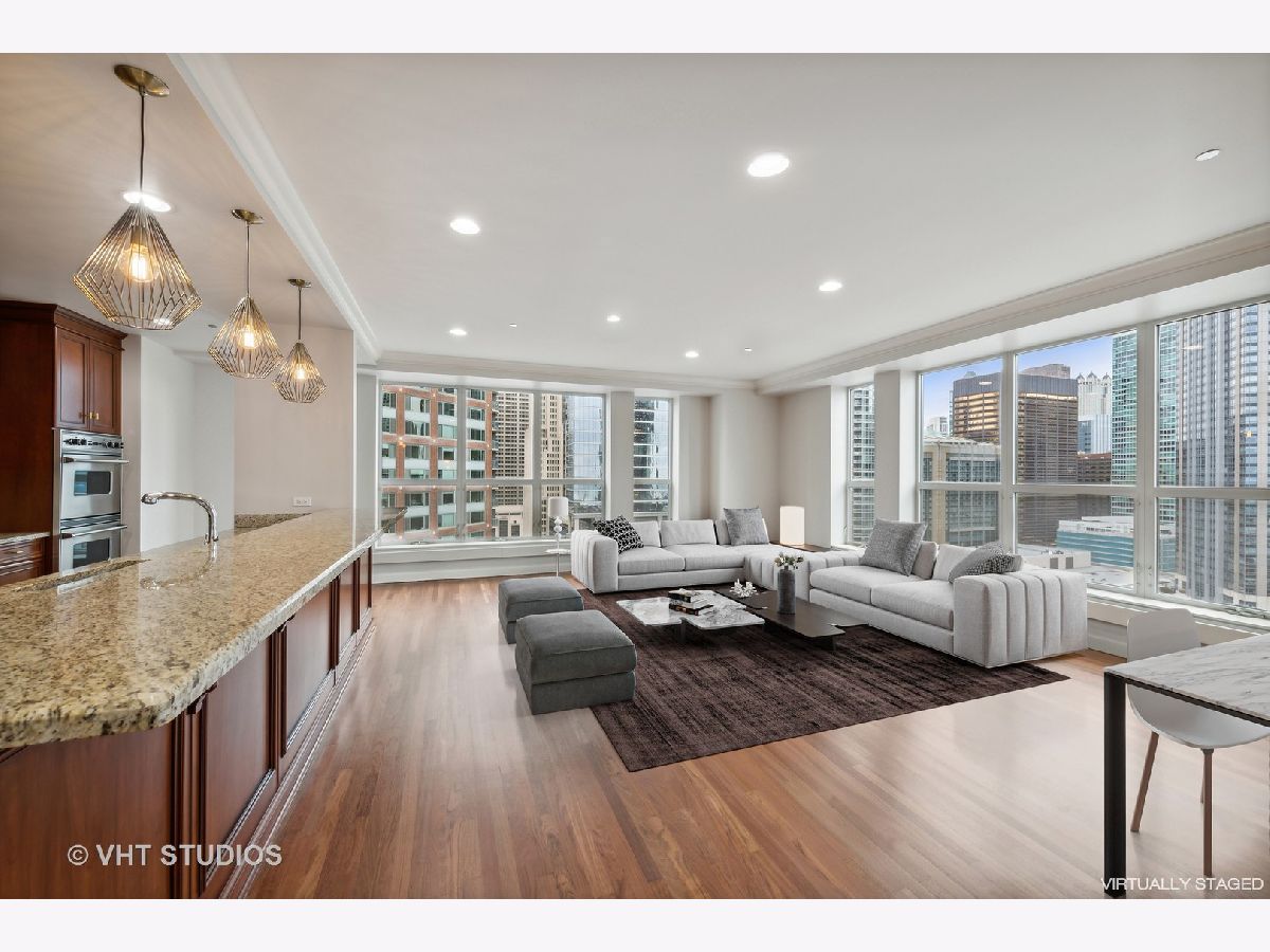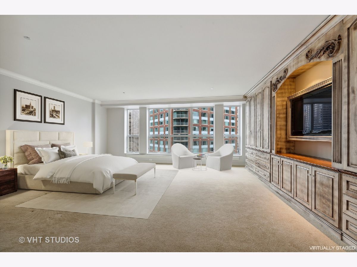 Refreshed and ready for you! Stunning home located in Streeterville's premier Riverview with direct access to the Riverwalk in downtown Chicago. Those seeking an extra large home will be delighted at this opportunity to live in comfort in this corner residence with walls of oversized windows flooding the home with natural light. Offering approx. 3,500 square feet of living space in a split floor plan layout with spectacular north city views, partial east lake and south river views plus 2 private balconies. This newly refreshed home has gorgeous refinished wood flooring in living areas, new lighting, neutral paint, and is customized with designer touches thruout. The welcoming entrance foyer leads you to a large living/family room with an enclosed two-sided fireplace that separates it from the formal dining room. The open concept kitchen is perfect for entertaining and features Subzero, Viking, KitchenAid appliances, granite, counter seating for 5 and a breakfast nook. The dining room can accommodate large- scale seating, has a butler's pantry and direct access to the north balcony to relax and take in the stunning city views. The primary suite is enormous with a wall of windows and separate from the other bedrooms. This suite offers a private sanctuary with its large full bath featuring a whirlpool tub, separate step in shower, double vanity and bidet. Who needs dressers with a wall of custom finished built-ins affording incredible storage plus a walk in closet! And there's plenty of room for a sitting area to take in the city and river views. The very large second bedroom has a huge walk in closet and it's own en-suite full bath, the third bedroom is generously sized with easy access to the hall full bath. The fourth bedroom is perfect and cozy for your guests and features amazing custom finishes and builtins with access to the west balcony that offers views of the river life and the stunning skyline. This condo lives like a single family home with it's split floor plan and generously sized rooms. Riverview is a professionally managed, full service, amenity filled building with healthy reserves-approx. $2.7M, high owner occupancy, and 24 hr. service oriented staff. First class amenities include event room with access to the sun deck, indoor pool, jacuzzi, yoga room, professionally outfitted fitness center w/high end equipment, men's and women's locker rooms with saunas, fantastic sun deck facing the river, dog run, dry cleaners and a car wash station in the garage. Exceptionally located and within steps to the lakefront activities, Riverwalk, Michigan Ave shopping, the city's best culinary experiences, Whole Foods, coffee shops, AMC Theater, Northwestern Hospital Campus, Target and easy access to Lake Shore Drive. Two garage parking spaces included in price! Welcome home!