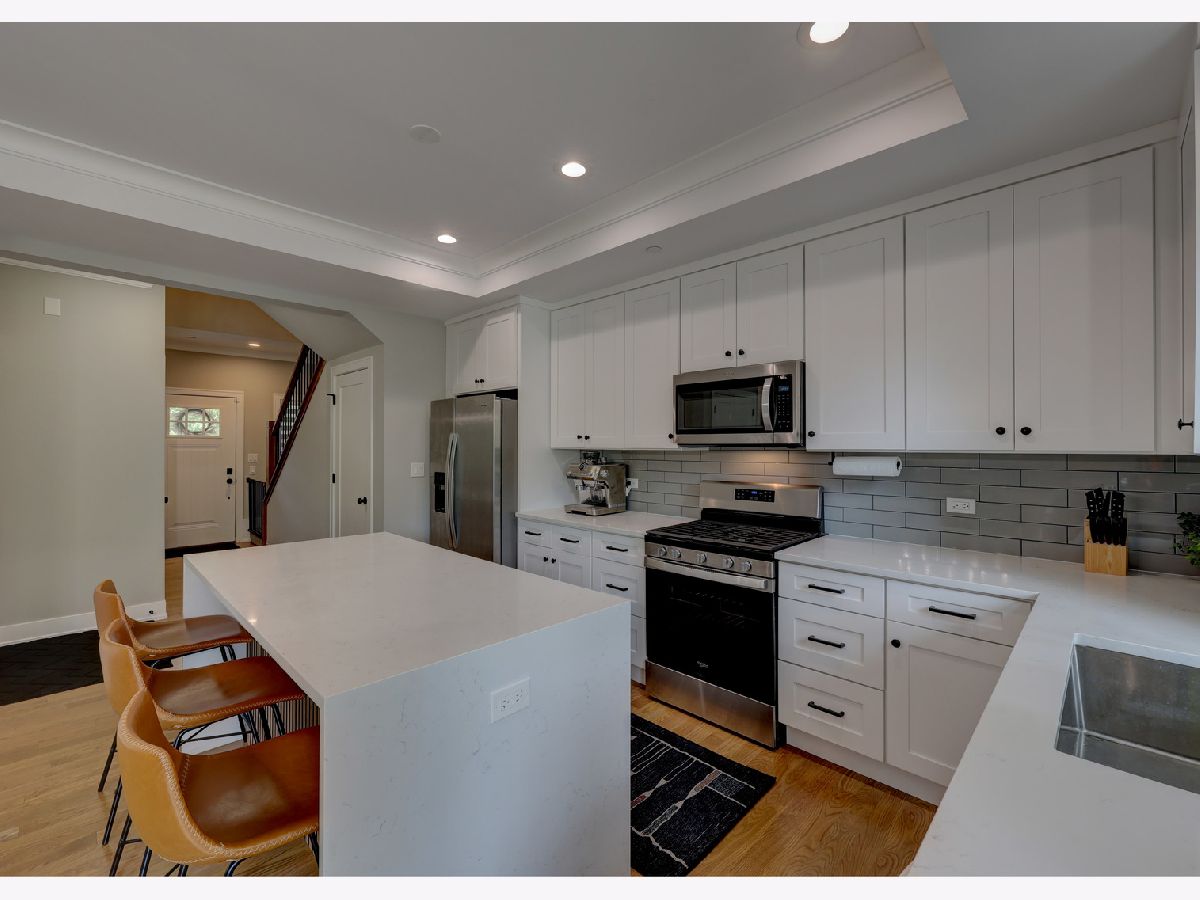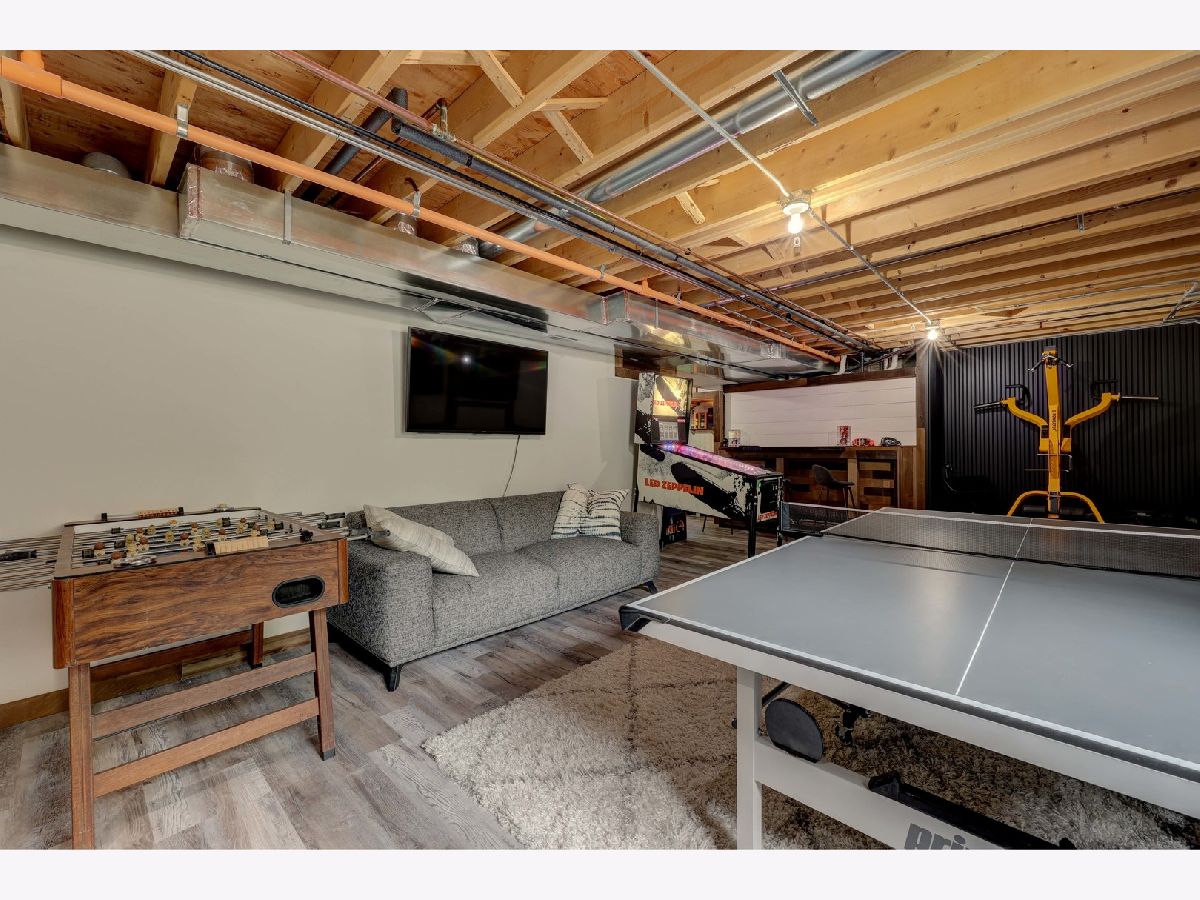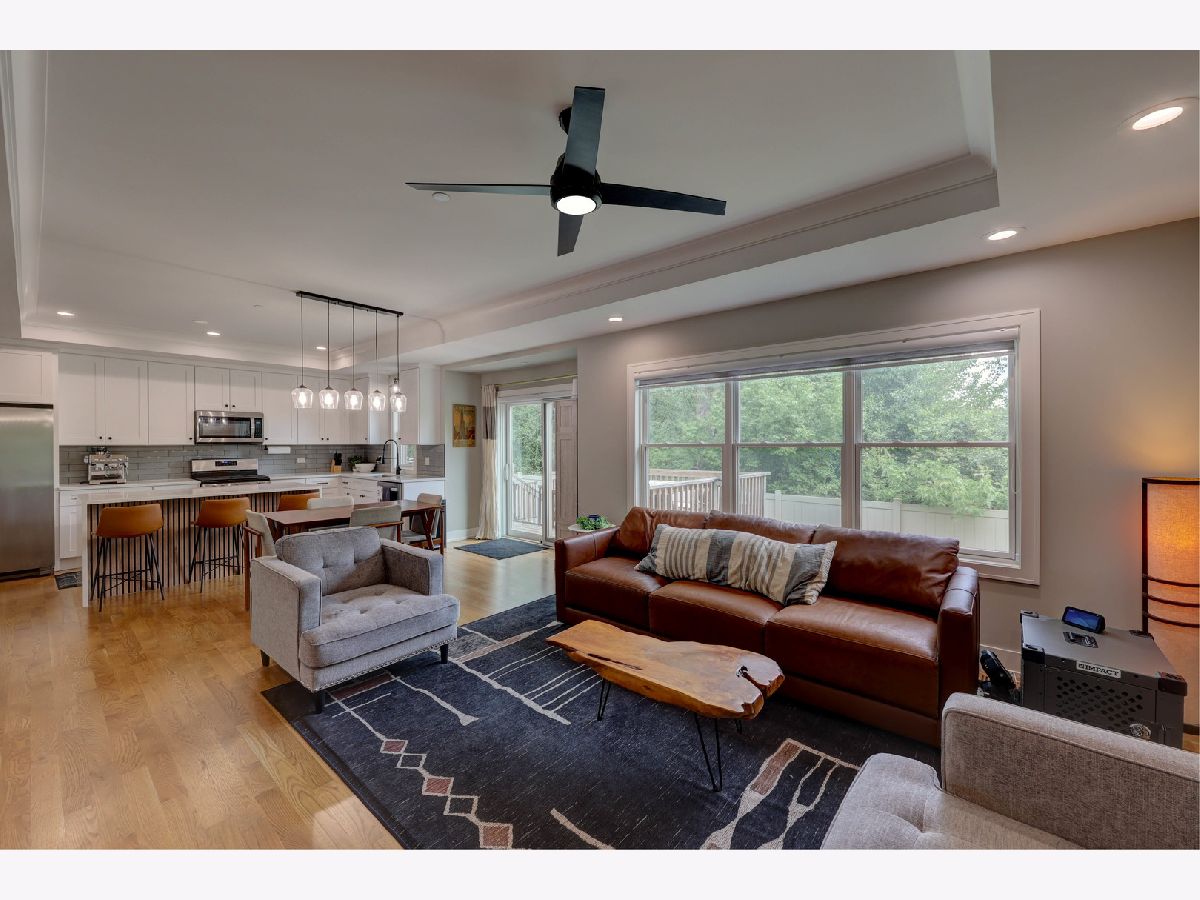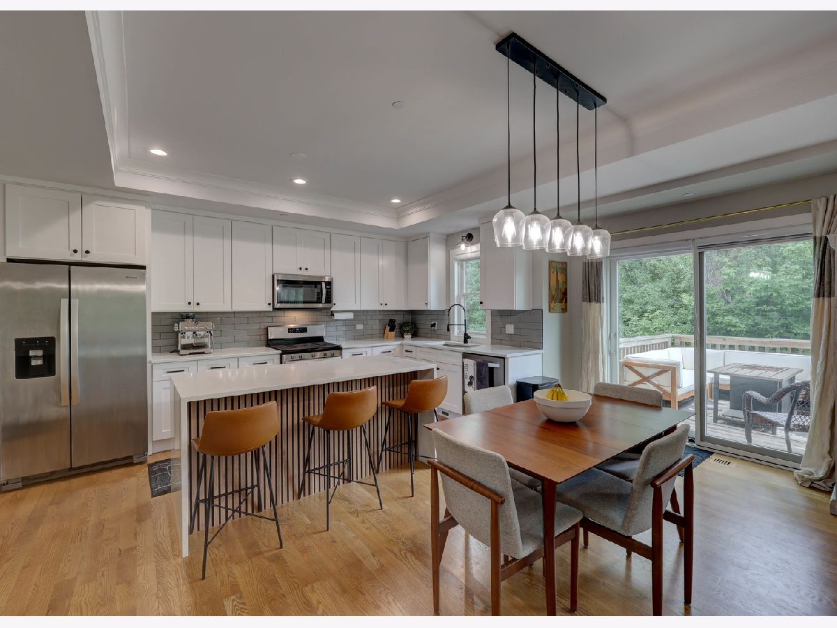 This custom-built townhome, completed in 2021, offers the perfect blend of open-concept design, elegant finishes, and highly functional living spaces. With 9-foot ceilings on both the main and upper levels and stylish recessed lighting throughout, the home feels bright, open, and effortlessly modern. From the moment you step through the front door, the warmth of hardwood flooring and the clean lines of shaker cabinetry set the tone for a sophisticated, move-in-ready experience. The kitchen is a true showpiece, featuring quartz countertops, stainless steel appliances, a spacious center island, and a sleek tile backsplash. It flows seamlessly into a light-filled dinette and a comfortable family room, anchored by a wall of Pella windows overlooking the private backyard. Step out onto the elevated deck-your own outdoor oasis-perfect for morning coffee or quiet evenings, surrounded by mature trees and lush landscaping. Upstairs, you'll find three generous bedrooms, including a luxurious primary suite with vaulted ceilings, a massive 12' x 6' walk-in closet, and a spa-inspired en suite bath. Indulge in the freestanding soaking tub, double quartz vanity, and oversized 6' x 4' walk-in shower finished in designer tile. A second-floor laundry room adds everyday convenience, complete with a utility sink and ample storage space. The finished basement offers additional living space with a flexible layout-ideal for a home theater, gym, playroom, or entertainment zone. A custom-built bar nook under the stairs features stylish cabinetry, a beverage fridge, and warm wood accents, creating a cozy and inviting atmosphere for gatherings or relaxing at the end of the day. Additional highlights include an oversized 20' x 19' garage with 11-foot ceilings, providing excellent vertical storage or space for larger vehicles. Surrounded by open areas, parks, ponds, and walking paths, yet just minutes from Woodfield Mall, Busse Woods, and all major expressways, this townhome offers the perfect balance of comfort, convenience, and community.
