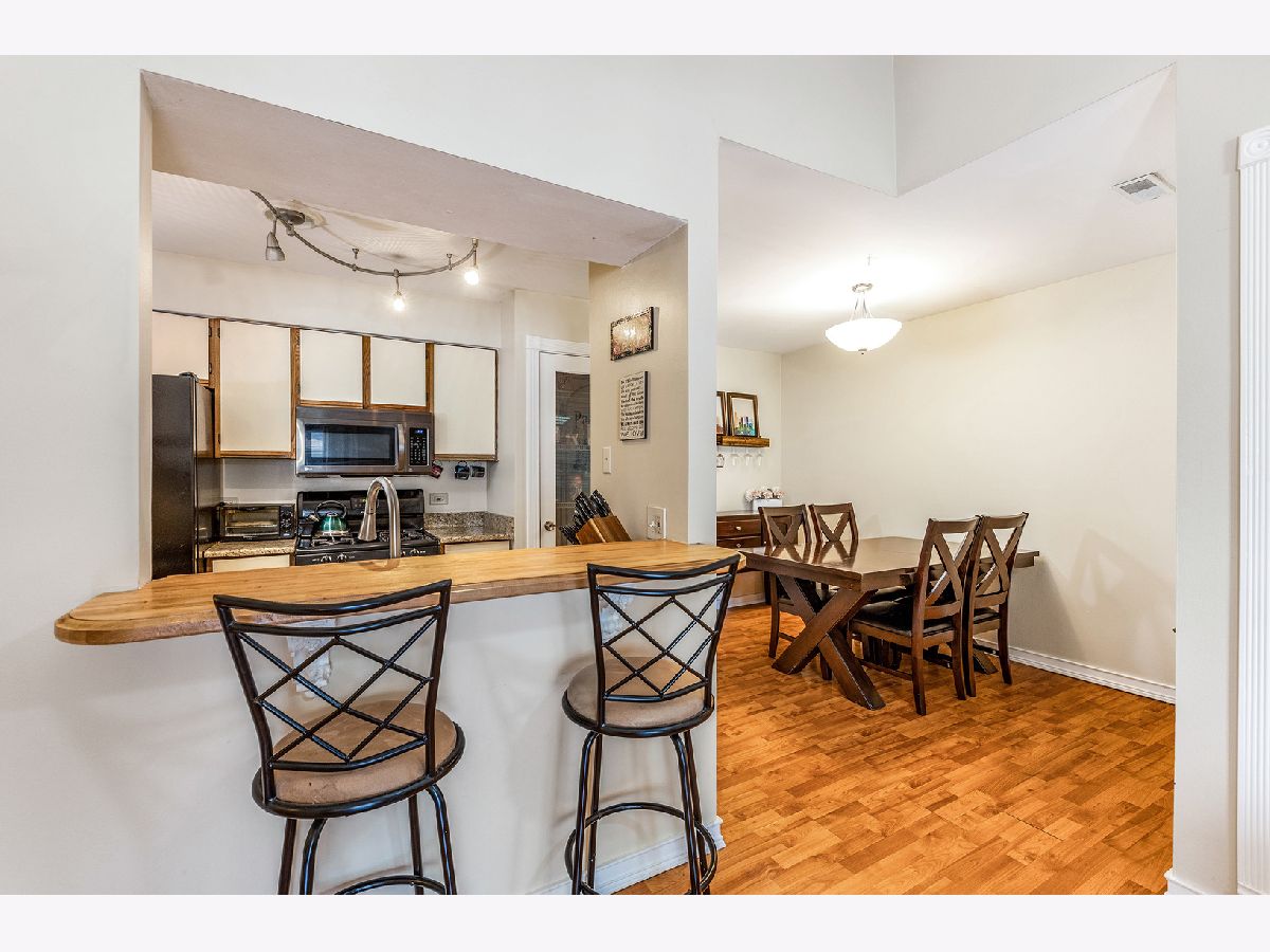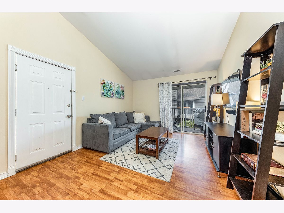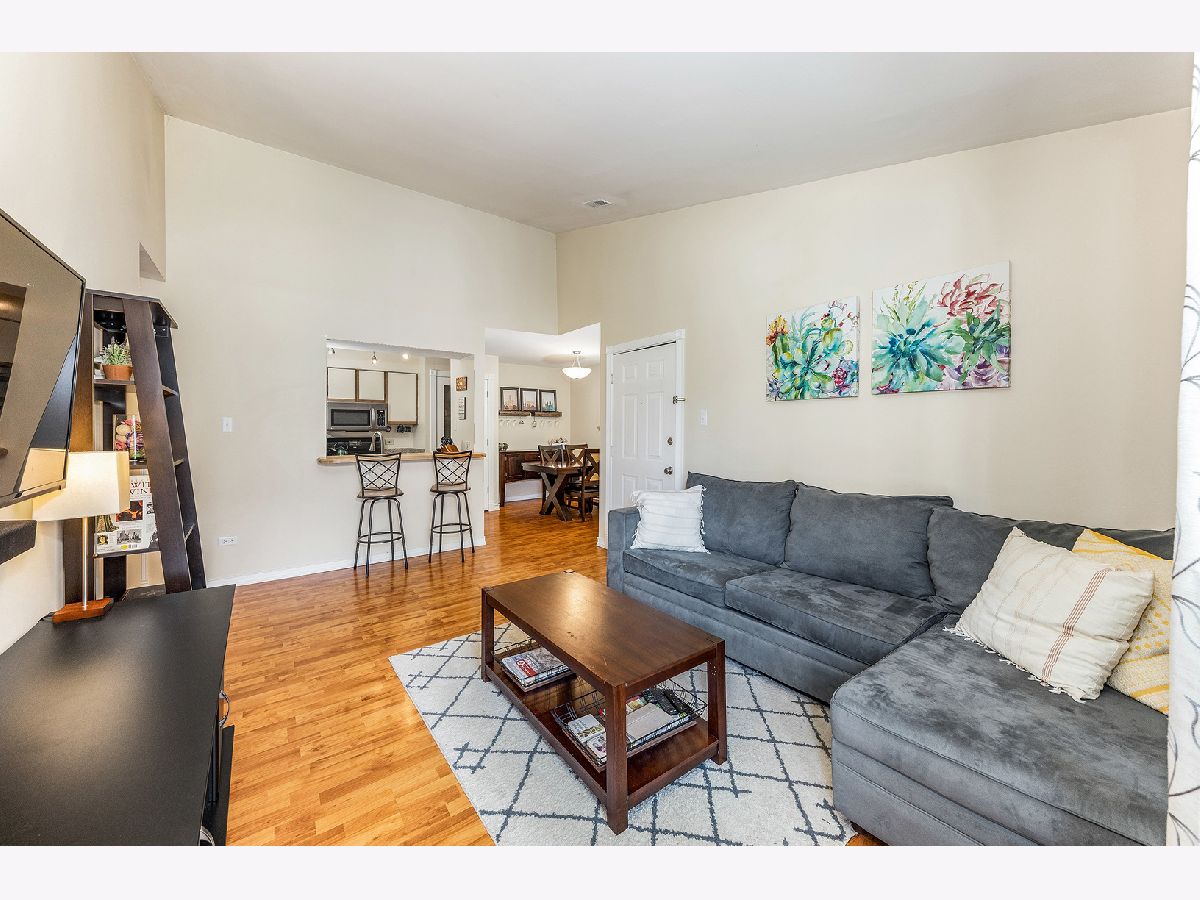 Bright & updated condo! Gorgeous unit with balcony, steps from everything downtown Lombard has to offer and only one block from the Metra Station. Close to parks, Prairie Path and in very desirable school district 44. Spacious second floor unit has vaulted ceilings in living & dining room, beautiful hardwood style laminate floors, open galley kitchen with breakfast bar, pantry, granite counters, custom tile work in both updated bathrooms, newer carpeting in both bedrooms, in unit stackable laundry, loads of attic storage and 2 parking spaces!