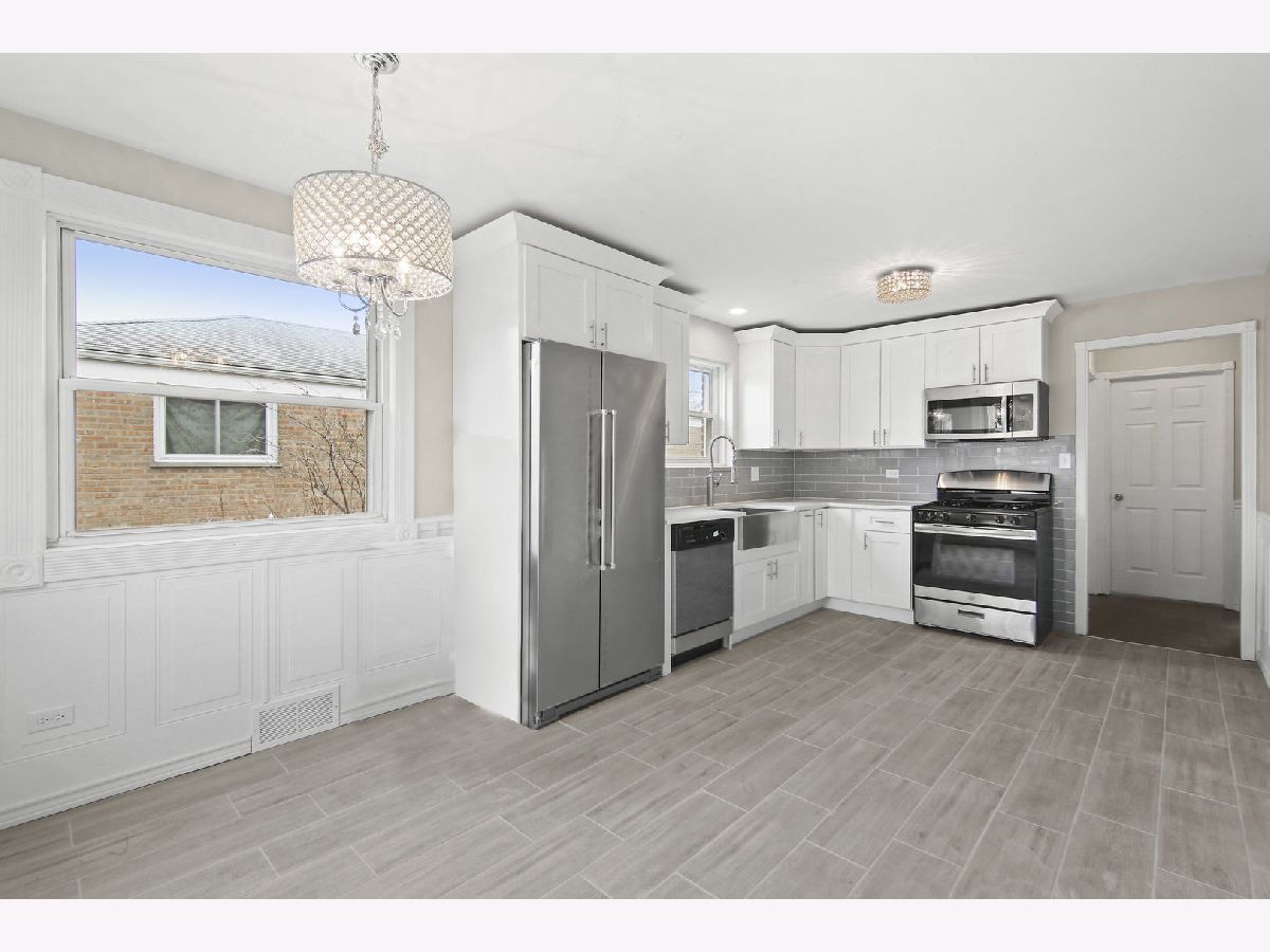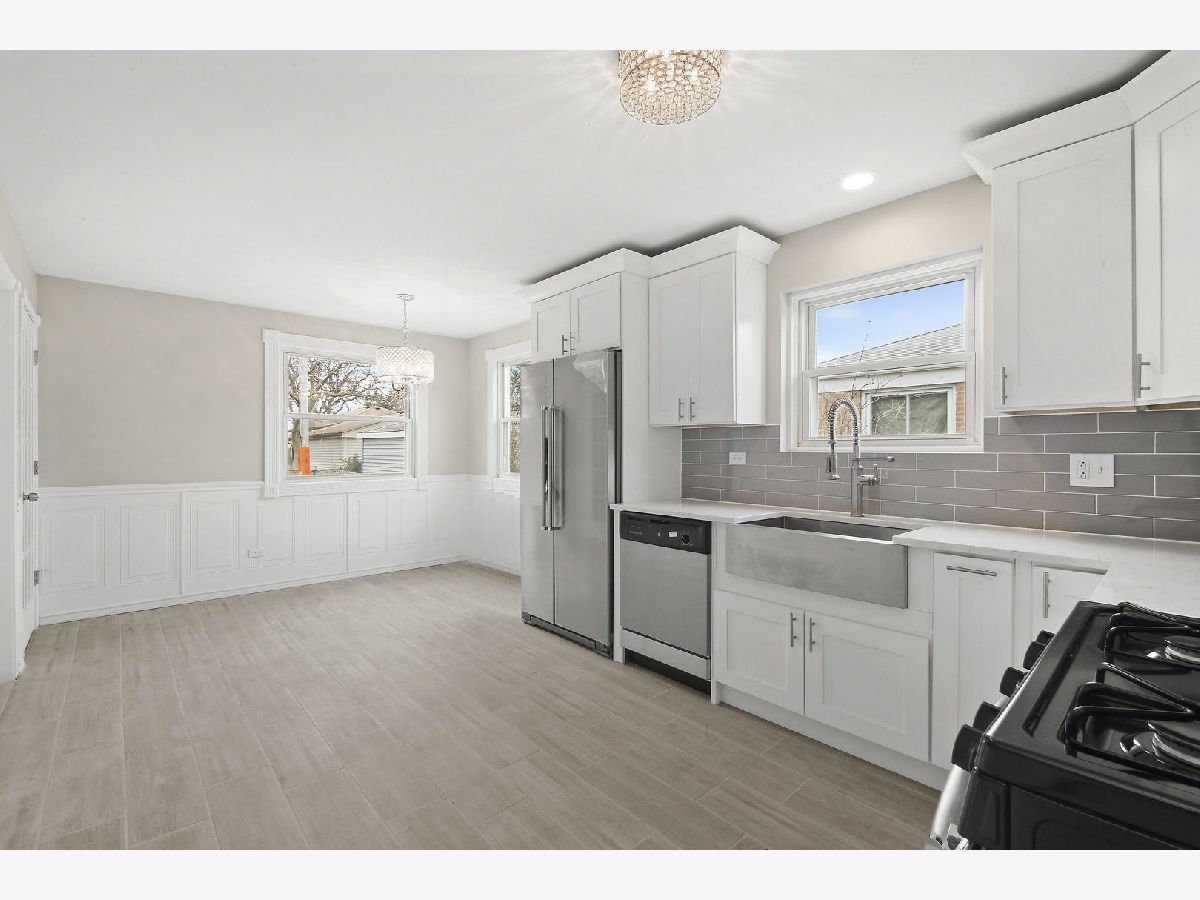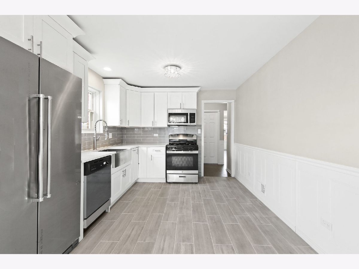 Beautifully remodeled raised ranch features refinished original hardwood floors and modern style wainscot. Kitchen features new stainless appliances, quartz counter tops, high quality cabinetry, stainless steel farm-style sink with matching faucet. The spacious dining area includes a beautiful chandelier and lots of natural light. Bathroom has marble flooring, modern vanity and a no bulb replacing lighting fixture. Basement is finished with a full bath and a bedroom. New awning windows in the basement make the space feel open and airy. A perfect space for a family entertainment room. Laundry room is spacious and ready for personalization. Garage roof, siding and garage door are all new. Large back yard features professional landscaping, new concrete walk way and a beautiful brick basket weave pattern design. 1 yr diamond warranty with full price sale.