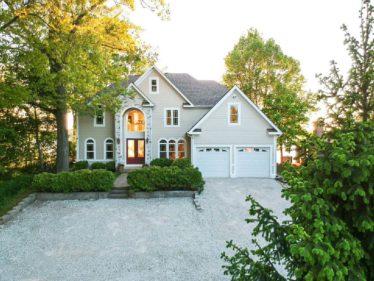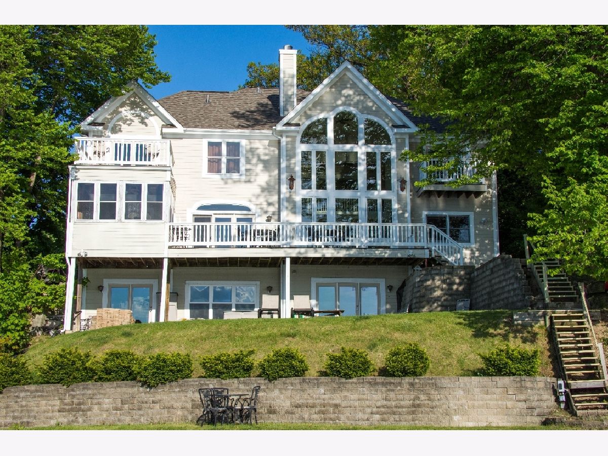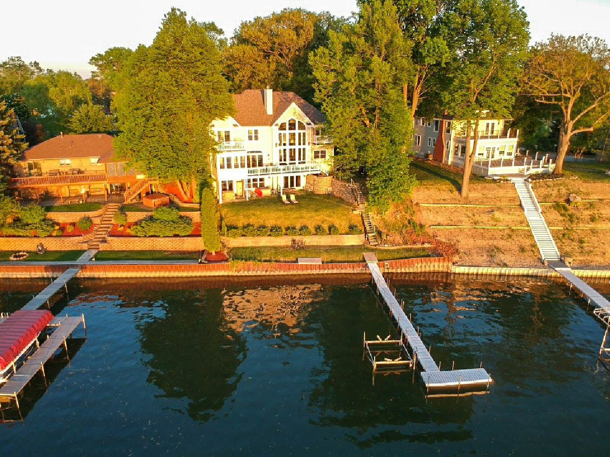 Timeless custom built French Traditional home by award-winning architect. Nearly 90 ft of shoreline facing the sunset! Perfect for both family living and entertaining. Quality 2x6 construction with a sprawling open floor plan. Features include: 22' grand entry, double tray ceilings, double stair case w/kitchen access, 40ft catwalk, 26' vaulted ceiling with a stunning 22' window array that provides a bright open feeling. New luxury kitchen, walk-in pantry and 1st floor laundry. 4 spacious bedrooms including 900+ SQF master suite, walk-in closets, 4 full baths. 3 decks and screened in porch provide endless lake views. Walkout basement stubbed for 5th full bath and radiant heat. Dual zone heat up & down with 400 amp electric service. 2 garages.