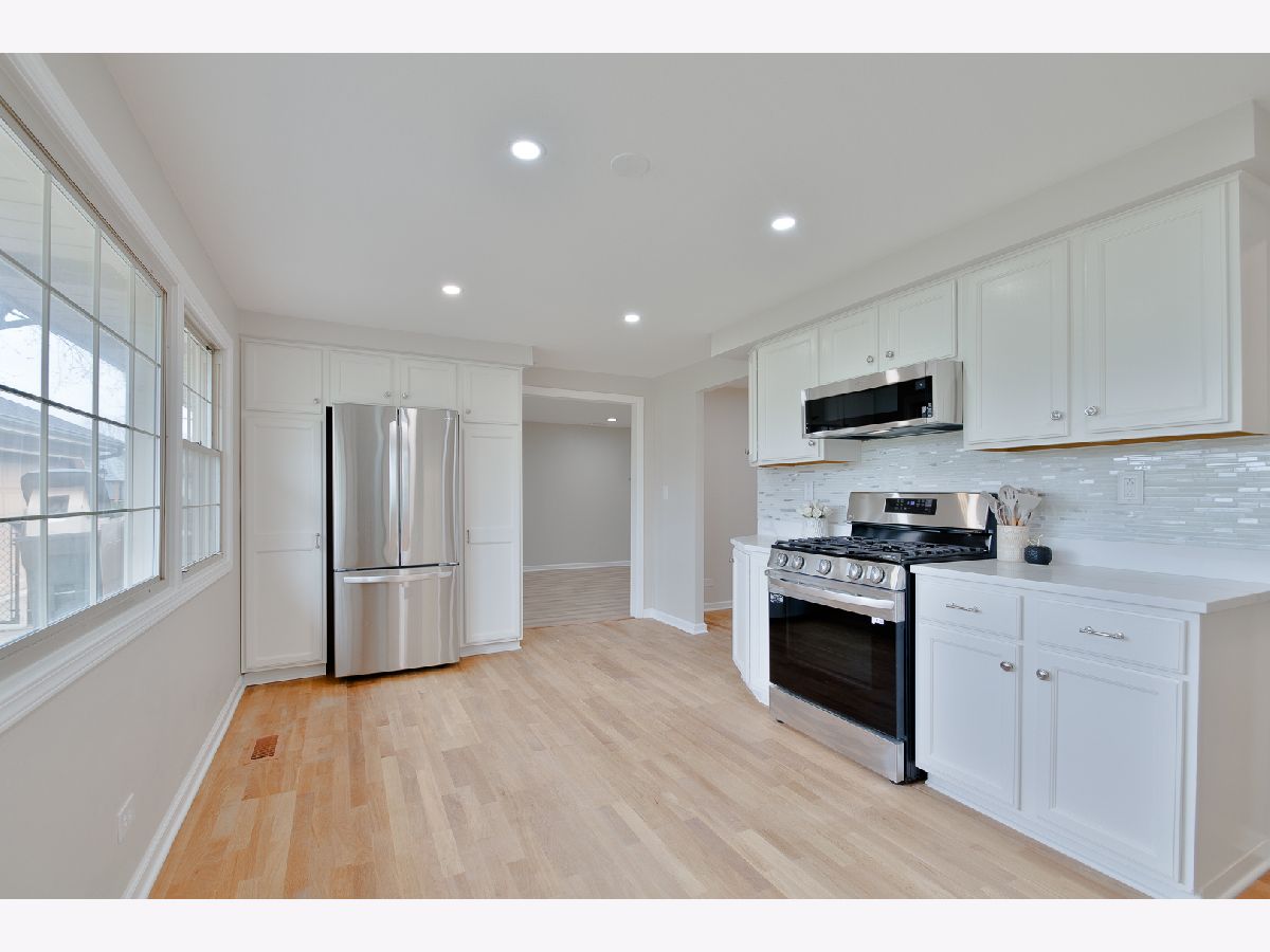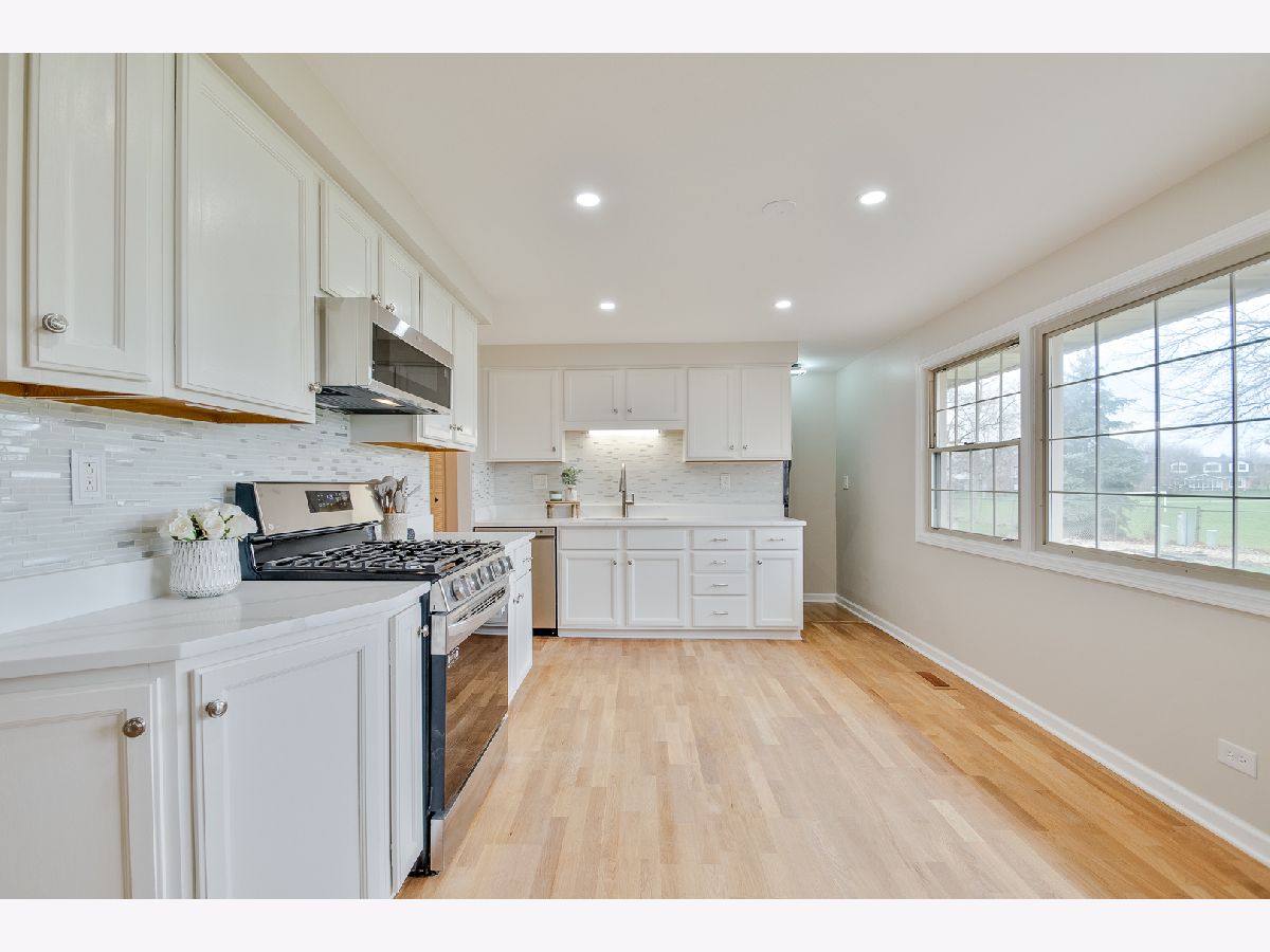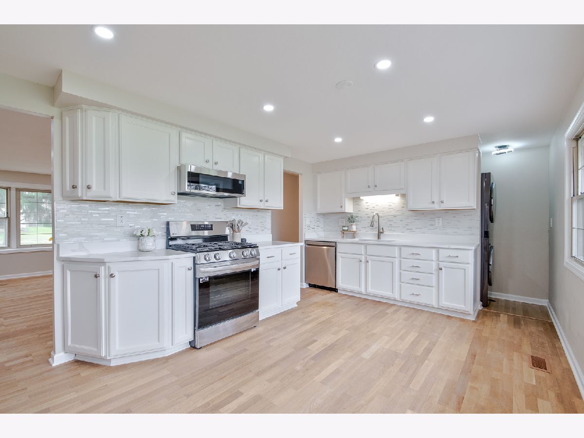 Beautifully updated Weathersfield ranch with BONUS family room ~ Enjoy stair free living! So much NEW here! Kitchen complete with brand new stainless steel appliances, quartz countertops, tile backsplash, sink & light up faucet, recessed lighting and freshly refinished hardwood floors. Living room complete with recessed lighting, fresh coat of paint, refinished hardwood floors and trim. Family room complete with fresh coat of paint, recessed lighting, trim and laminate floor. All 3 bedrooms new paint, laminate flooring & trim, and ceiling fans. Both bathrooms nicely updated. Other features include: Newer A/C, heated garage, brand new washer & dryer. Great location near parks, shops & award winning Schaumburg schools. Home backs to Cove Park.