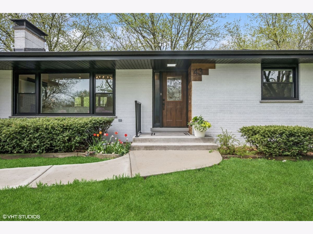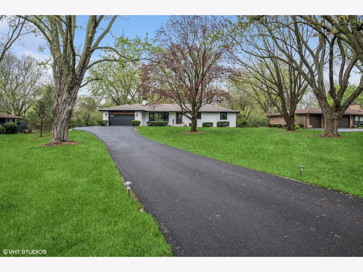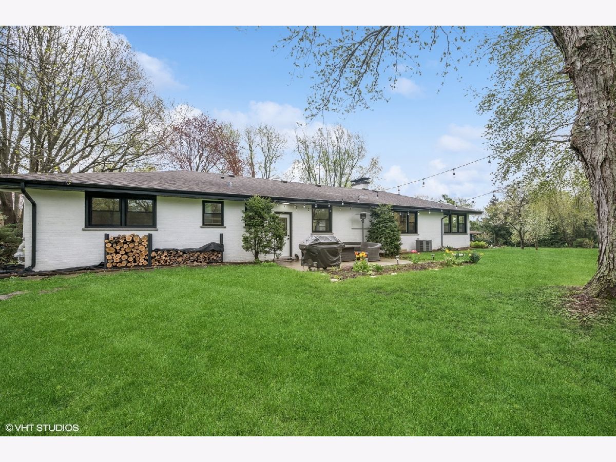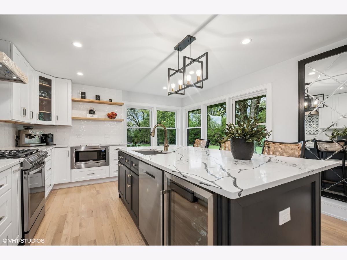 Welcome to 43 Lagoon Drive - A Modern Ranch Retreat in the Heart of Hawthorn Woods. Tucked away on a quiet, wooded lot in the sought-after Glennshire neighborhood, this all-white brick ranch has been completely reimagined for modern living. Step inside to discover silver whitewashed oak floors flowing throughout an open-concept layout filled with natural light and timeless style. The custom kitchen is a showstopper - soaring white cabinetry, stunning Calacatta Laza Quartz countertops, and a statement island illuminated by a sculptural iron and satin gold geometric light fixture. Enjoy high-end appliances including a Smart WiFi Samsung French-door refrigerator and counter-height wine fridge, all framed by a cushion subway tile backsplash with a designer focal point over a premium range beneath a black hood with limestone border. Open natural oak shelves add warmth and sophistication. Two walls of windows overlook the private, tree-lined backyard, while the immense dining area and great room feature designer lighting and a white stone fireplace with shiplap detail. The custom alder front door, scored glass sidelight, and modern iron chandelier make a striking first impression. The main level includes three generously sized bedrooms with custom plantation shutters (2023), overhead lighting, and large closets. The primary suite offers a spa-like bath with double vessel sinks, sleek black vanity with gold accents, rain shower and soaking tub in oversized subway surround, and designer tile flooring. The finished lower level boasts a bright rec room, laundry space, and large crawlspace for storage. A natural oak staircase with iron balusters adds architectural interest, and thoughtful details throughout include a stylish powder room, accent walls, and ample closets. Recent upgrades include: new driveway (2024), sump pump and backup system (2024), chimney restoration and cap (2024), and manicured landscaping with the addition of nine 70+ foot trees. Located just a short walk from the lake, park, tennis courts, baseball field, basketball courts, this move-in ready home blends luxury, comfort, and nature in one truly special package.