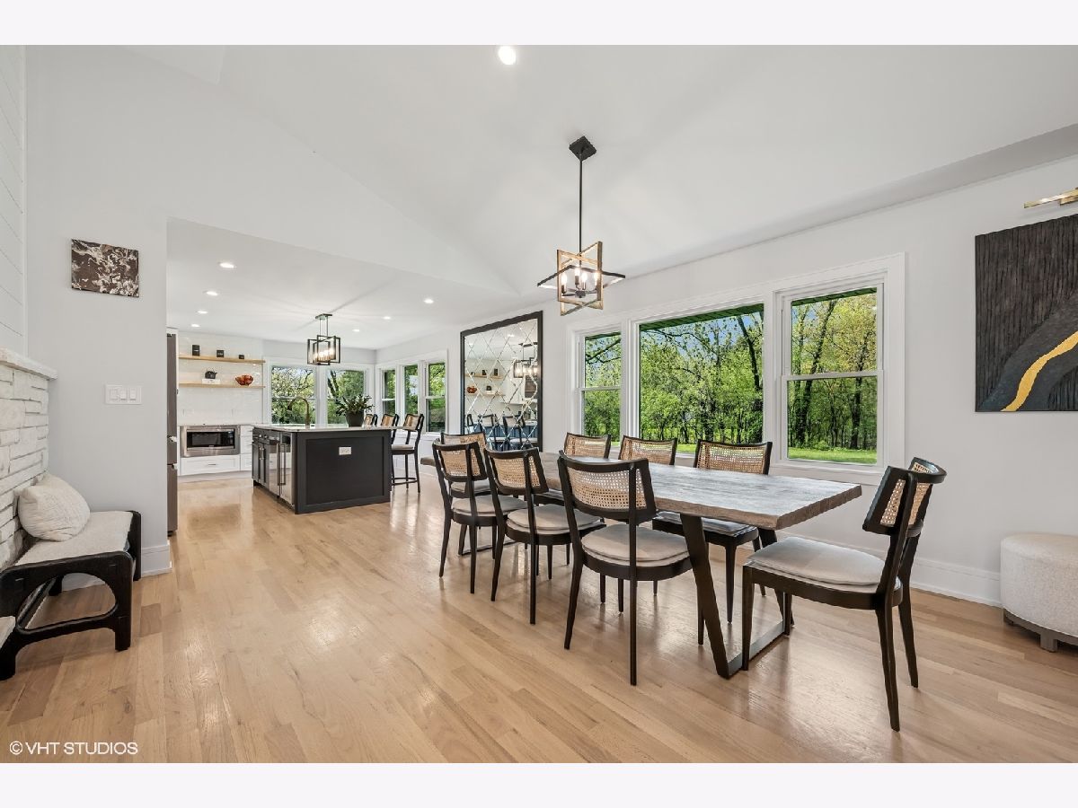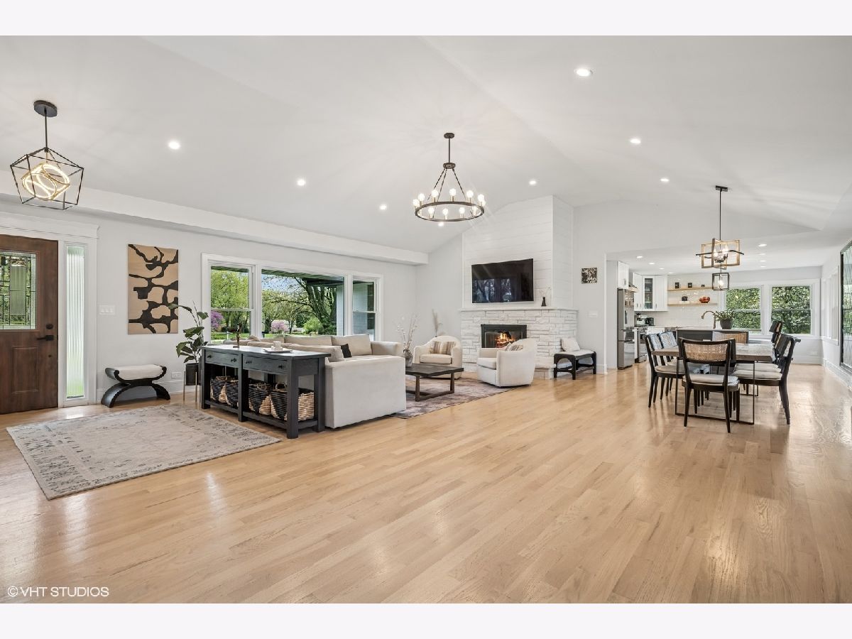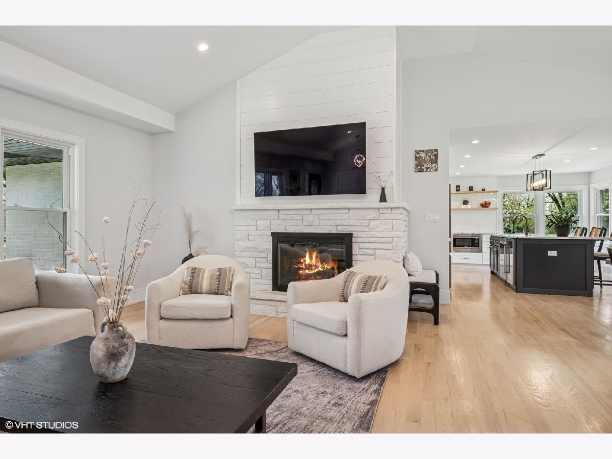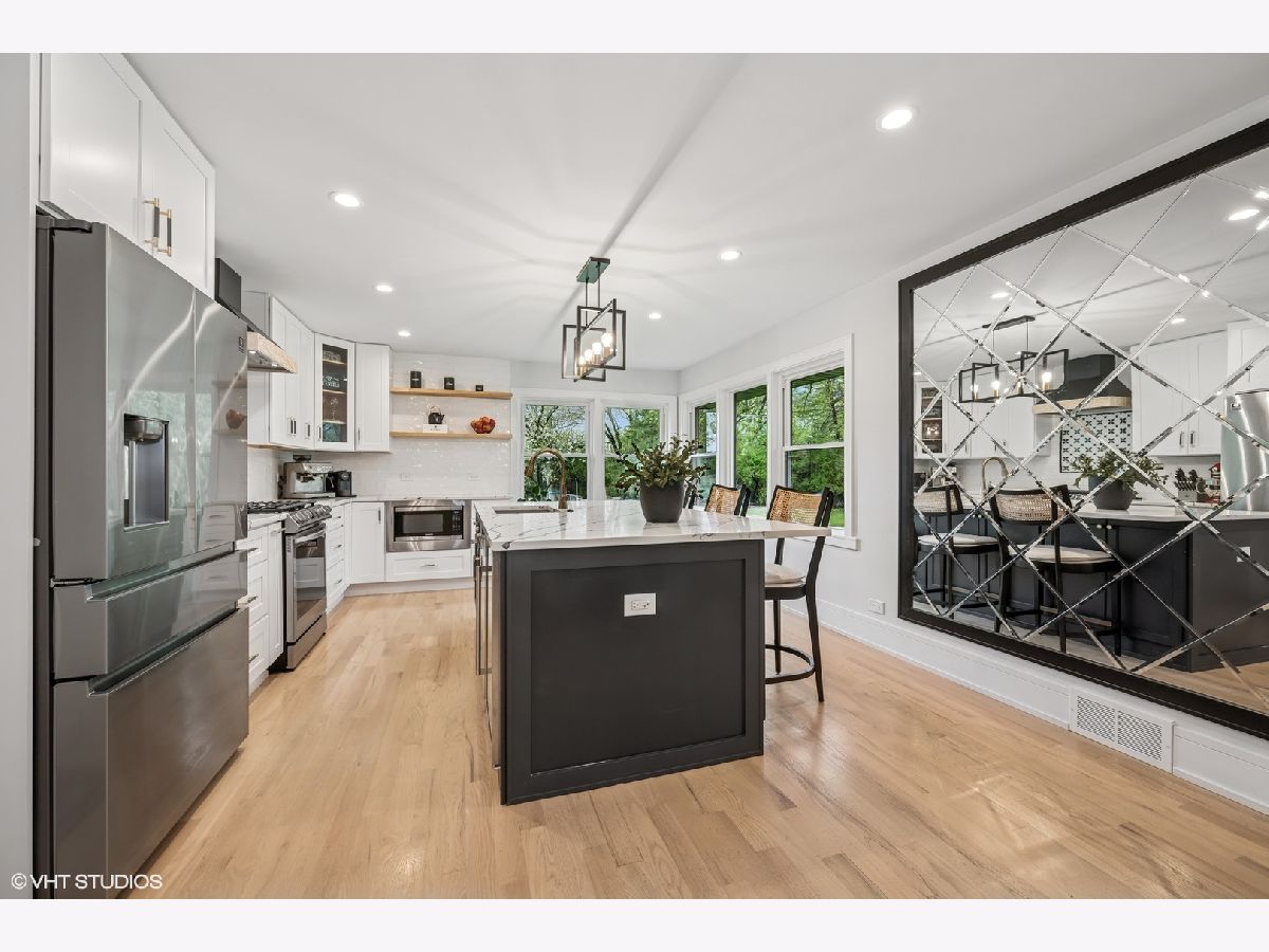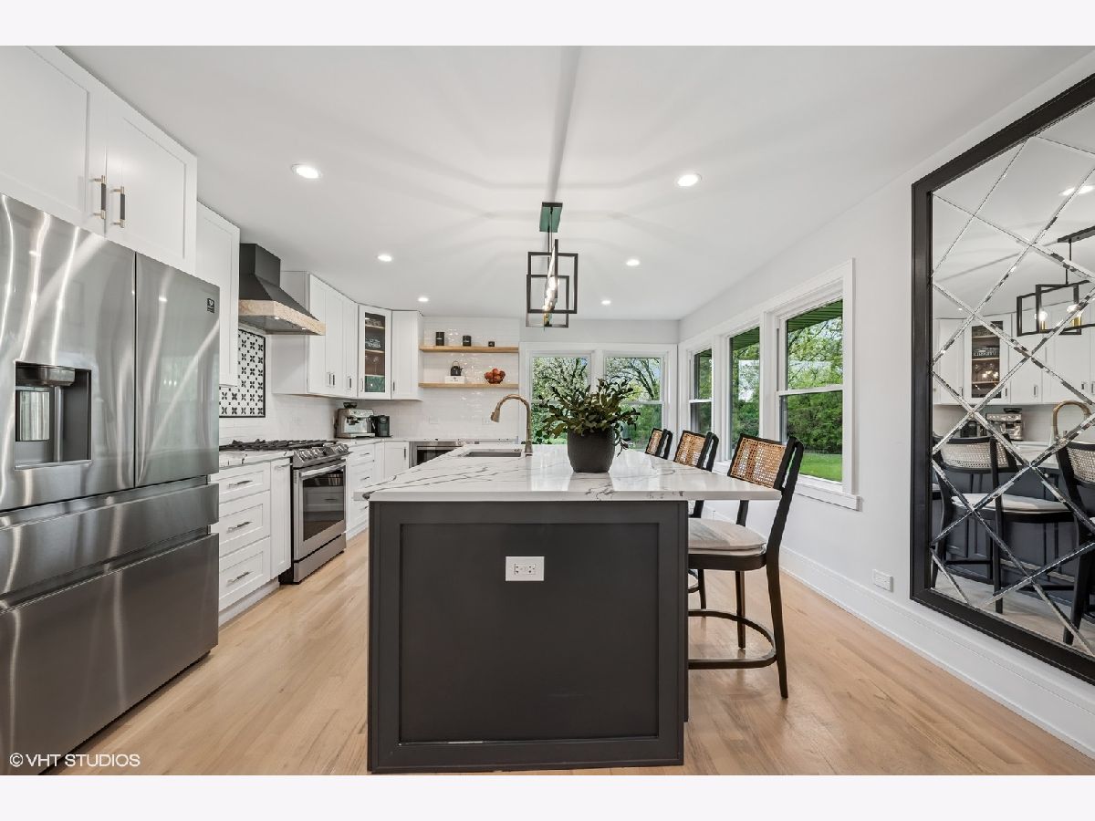 Welcome to 43 Lagoon Drive - A Modern Ranch Retreat in the Heart of Hawthorn Woods. Tucked away on a quiet, wooded lot in the sought-after Glennshire neighborhood, this all-white brick ranch has been completely reimagined for modern living. Step inside to discover silver whitewashed oak floors flowing throughout an open-concept layout filled with natural light and timeless style. The custom kitchen is a showstopper - soaring white cabinetry, stunning Calacatta Laza Quartz countertops, and a statement island illuminated by a sculptural iron and satin gold geometric light fixture. Enjoy high-end appliances including a Smart WiFi Samsung French-door refrigerator and counter-height wine fridge, all framed by a cushion subway tile backsplash with a designer focal point over a premium range beneath a black hood with limestone border. Open natural oak shelves add warmth and sophistication. Two walls of windows overlook the private, tree-lined backyard, while the immense dining area and great room feature designer lighting and a white stone fireplace with shiplap detail. The custom alder front door, scored glass sidelight, and modern iron chandelier make a striking first impression. The main level includes three generously sized bedrooms with custom plantation shutters (2023), overhead lighting, and large closets. The primary suite offers a spa-like bath with double vessel sinks, sleek black vanity with gold accents, rain shower and soaking tub in oversized subway surround, and designer tile flooring. The finished lower level boasts a bright rec room, laundry space, and large crawlspace for storage. A natural oak staircase with iron balusters adds architectural interest, and thoughtful details throughout include a stylish powder room, accent walls, and ample closets. Recent upgrades include: new driveway (2024), sump pump and backup system (2024), chimney restoration and cap (2024), and manicured landscaping with the addition of nine 70+ foot trees. Located just a short walk from the lake, park, tennis courts, baseball field, basketball courts, this move-in ready home blends luxury, comfort, and nature in one truly special package.