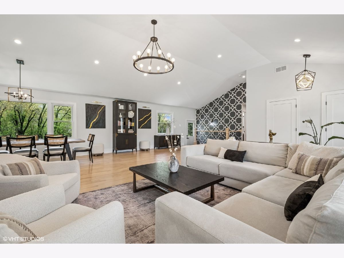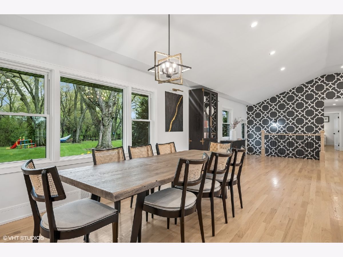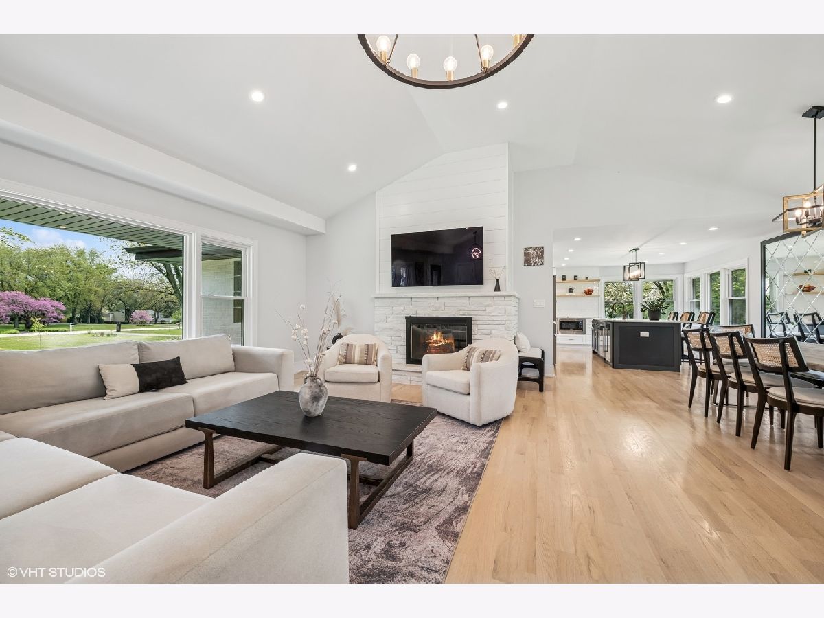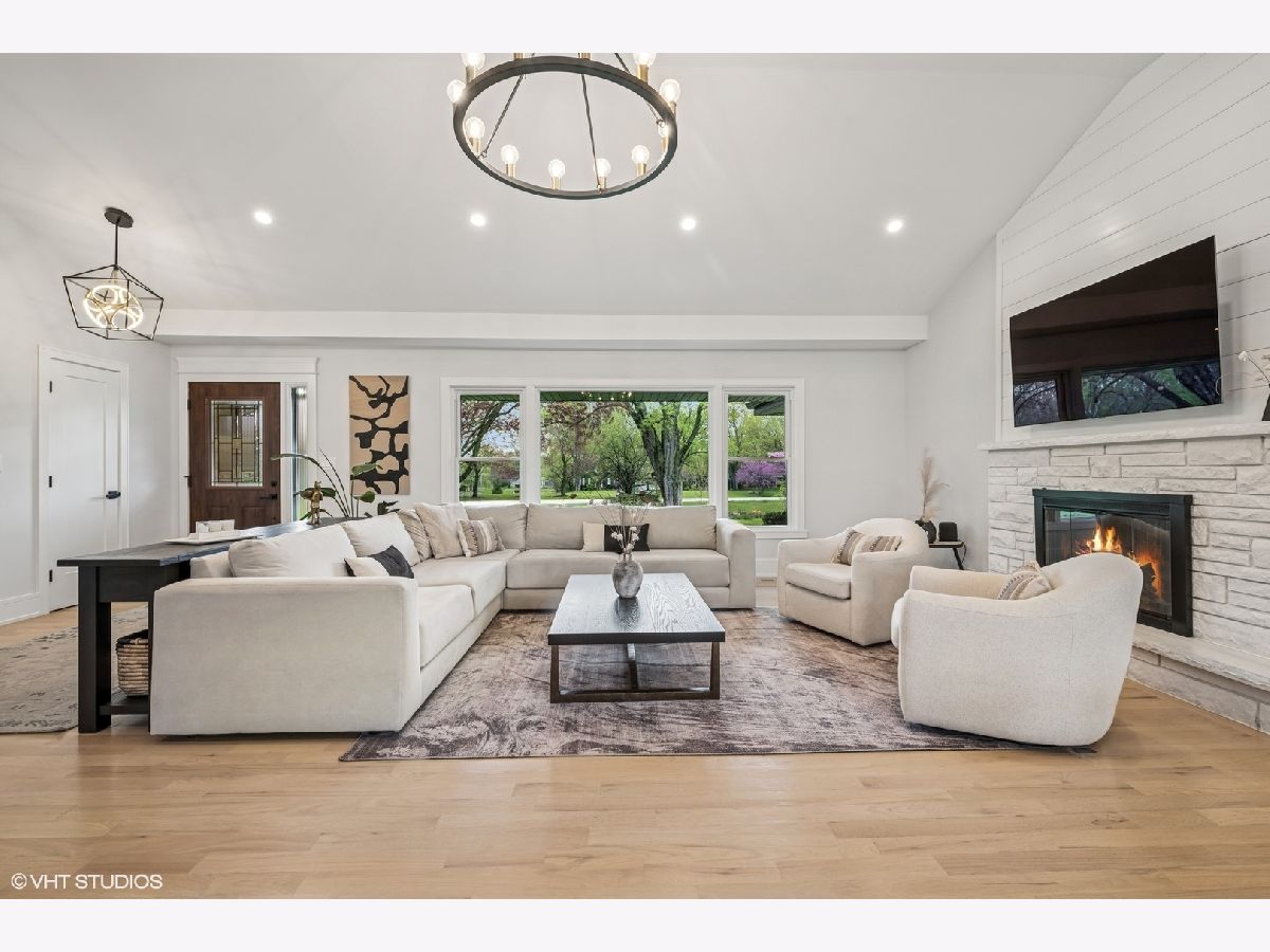 Welcome to 43 Lagoon Drive - A Modern Ranch Retreat in the Heart of Hawthorn Woods. Tucked away on a quiet, wooded lot in the sought-after Glennshire neighborhood, this all-white brick ranch has been completely reimagined for modern living. Step inside to discover silver whitewashed oak floors flowing throughout an open-concept layout filled with natural light and timeless style. The custom kitchen is a showstopper - soaring white cabinetry, stunning Calacatta Laza Quartz countertops, and a statement island illuminated by a sculptural iron and satin gold geometric light fixture. Enjoy high-end appliances including a Smart WiFi Samsung French-door refrigerator and counter-height wine fridge, all framed by a cushion subway tile backsplash with a designer focal point over a premium range beneath a black hood with limestone border. Open natural oak shelves add warmth and sophistication. Two walls of windows overlook the private, tree-lined backyard, while the immense dining area and great room feature designer lighting and a white stone fireplace with shiplap detail. The custom alder front door, scored glass sidelight, and modern iron chandelier make a striking first impression. The main level includes three generously sized bedrooms with custom plantation shutters (2023), overhead lighting, and large closets. The primary suite offers a spa-like bath with double vessel sinks, sleek black vanity with gold accents, rain shower and soaking tub in oversized subway surround, and designer tile flooring. The finished lower level boasts a bright rec room, laundry space, and large crawlspace for storage. A natural oak staircase with iron balusters adds architectural interest, and thoughtful details throughout include a stylish powder room, accent walls, and ample closets. Recent upgrades include: new driveway (2024), sump pump and backup system (2024), chimney restoration and cap (2024), and manicured landscaping with the addition of nine 70+ foot trees. Located just a short walk from the lake, park, tennis courts, baseball field, basketball courts, this move-in ready home blends luxury, comfort, and nature in one truly special package.