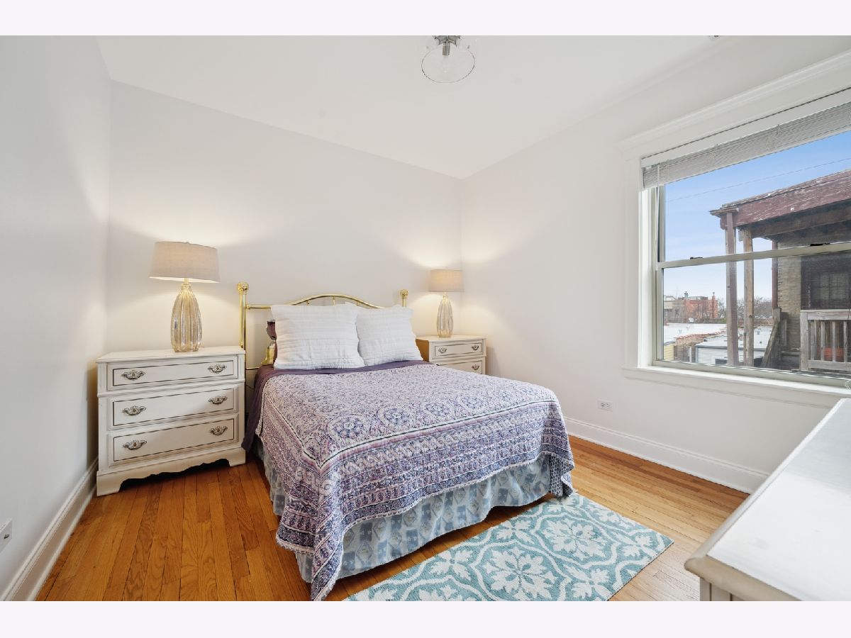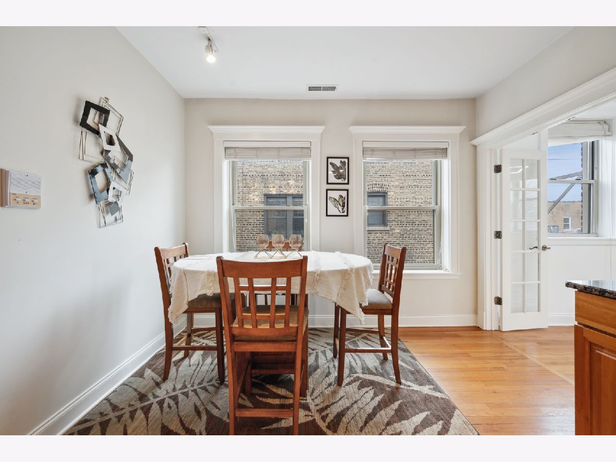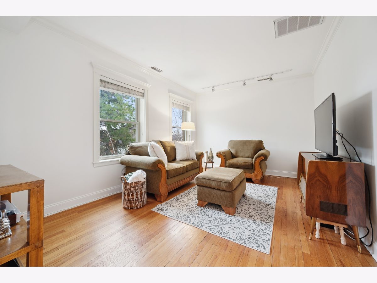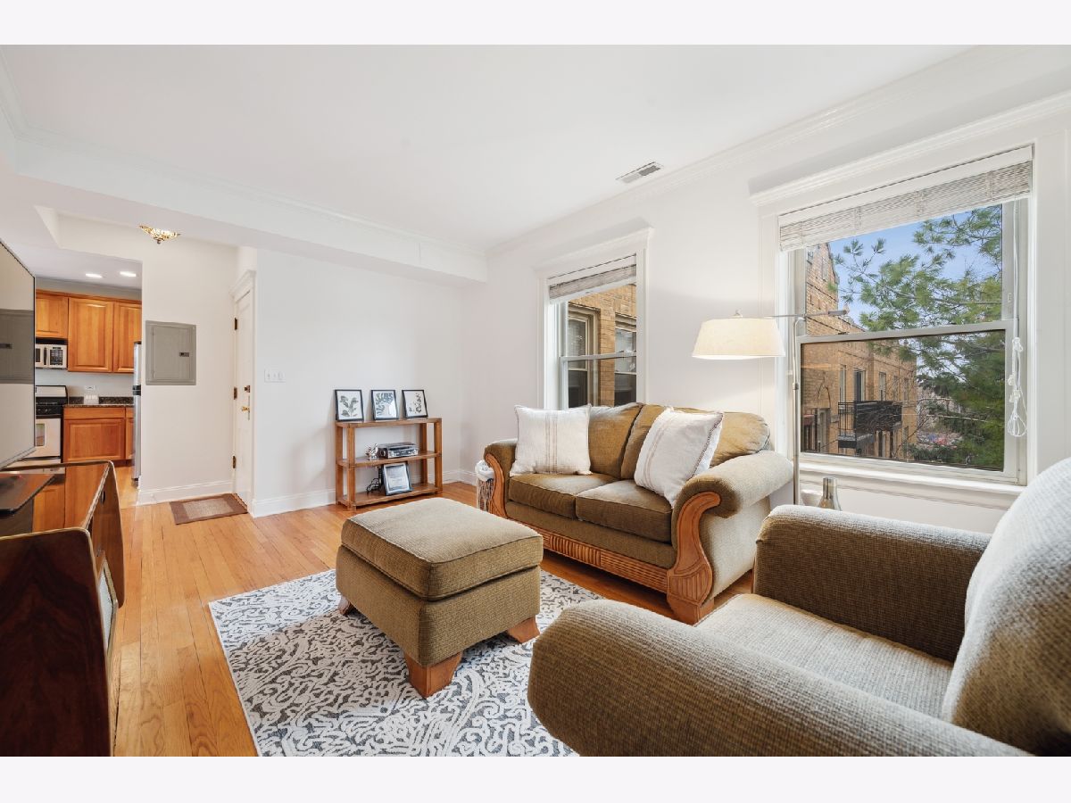 Bright top floor 2 bed/1 bath Ravenswood condo. Fresh paint, hardwood floors throughout. Kitchen features cherry cabinets, granite counters, stainless steel appliances opens to ample table space that overlooks the front room with crown molding. French doors grace the 2nd bedroom which leads to a small deck area allowing for great office space or convertible bedroom. 4 exposures to let all the light in. In-unit laundry, 8X5 storage room in basement. Ample street parking, restaurants, grocery, shops, walk to the brown line.