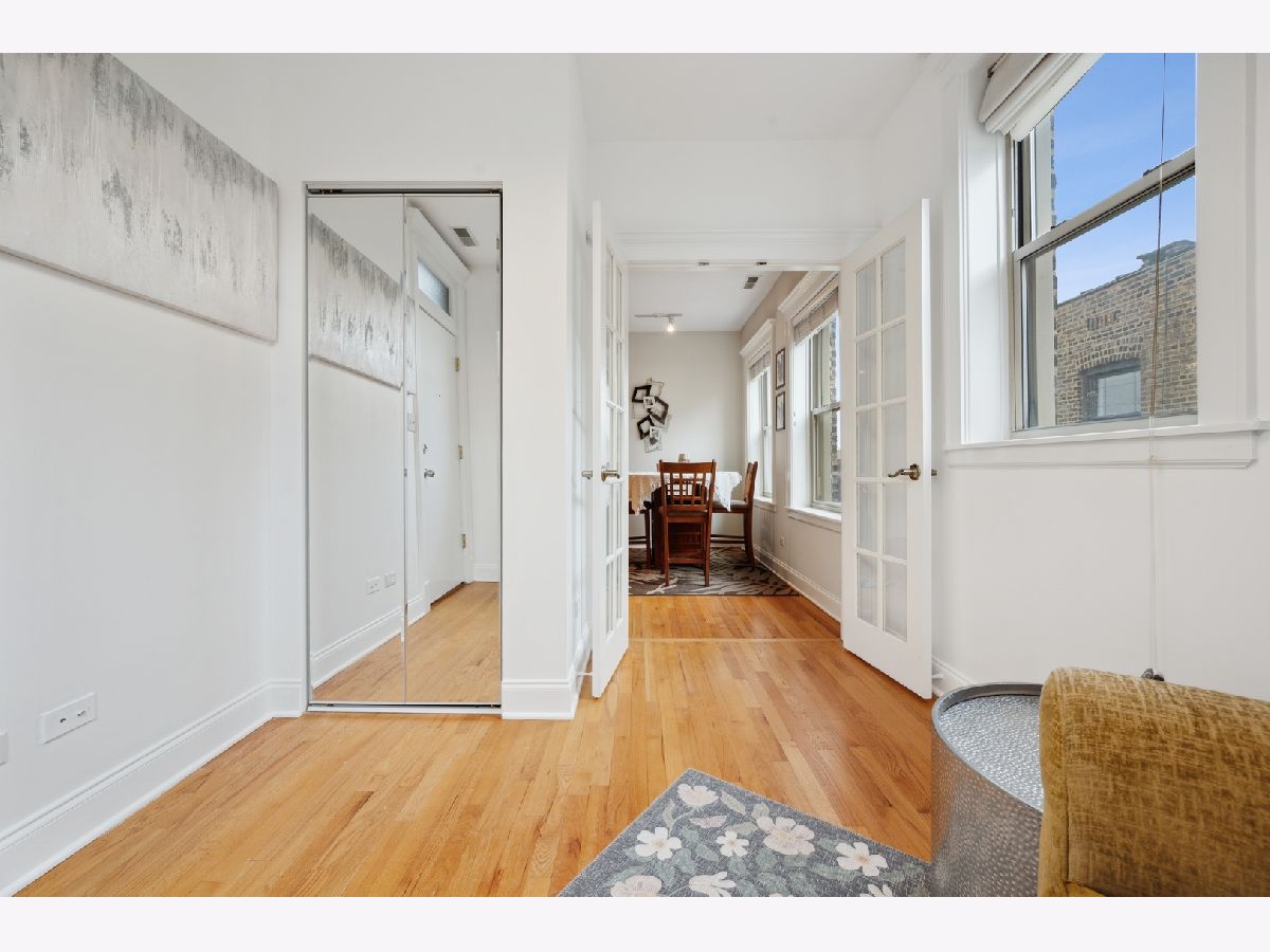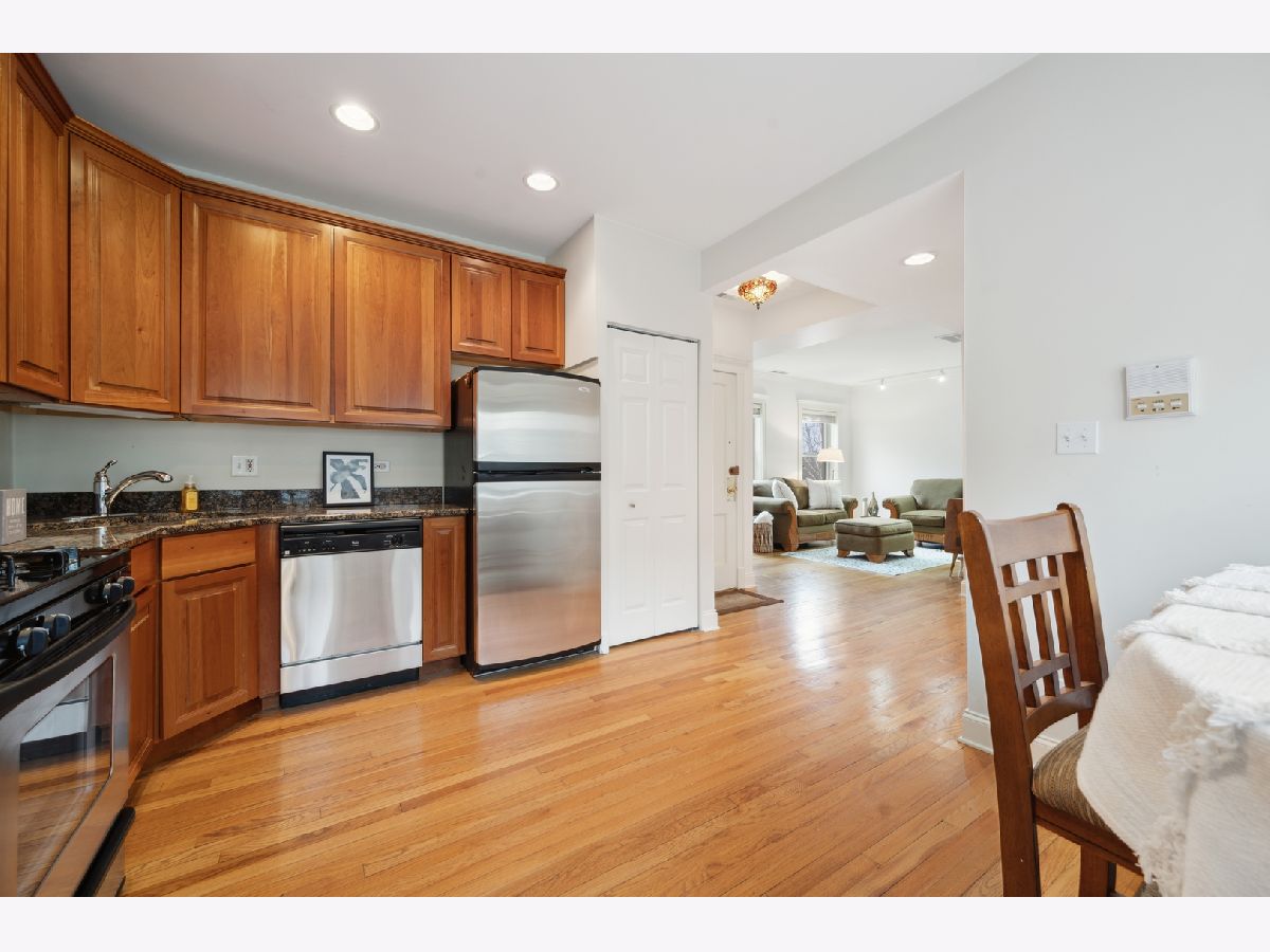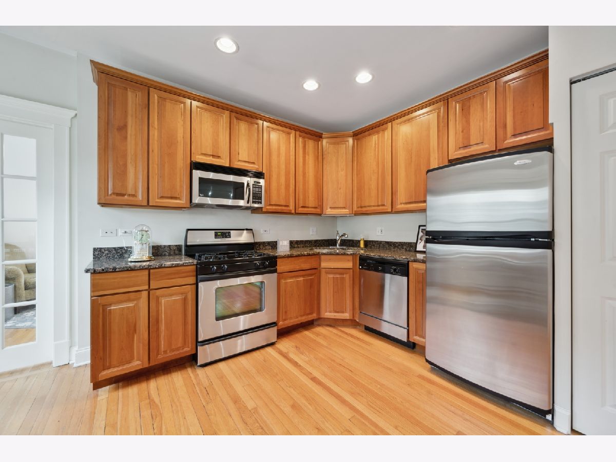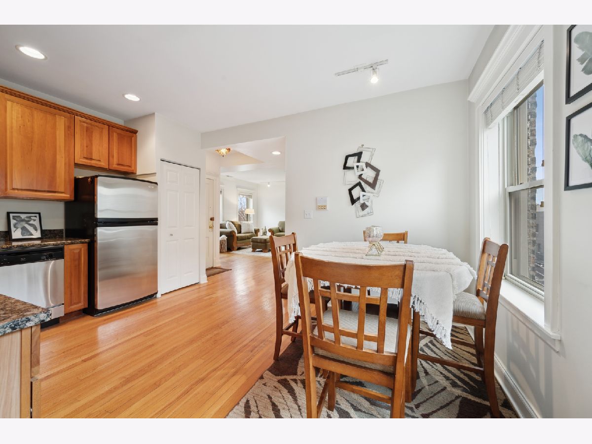 Bright top floor 2 bed/1 bath Ravenswood condo. Fresh paint, hardwood floors throughout. Kitchen features cherry cabinets, granite counters, stainless steel appliances opens to ample table space that overlooks the front room with crown molding. French doors grace the 2nd bedroom which leads to a small deck area allowing for great office space or convertible bedroom. 4 exposures to let all the light in. In-unit laundry, 8X5 storage room in basement. Ample street parking, restaurants, grocery, shops, walk to the brown line.