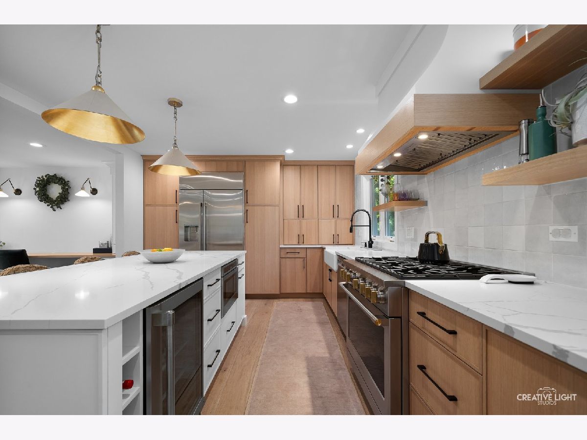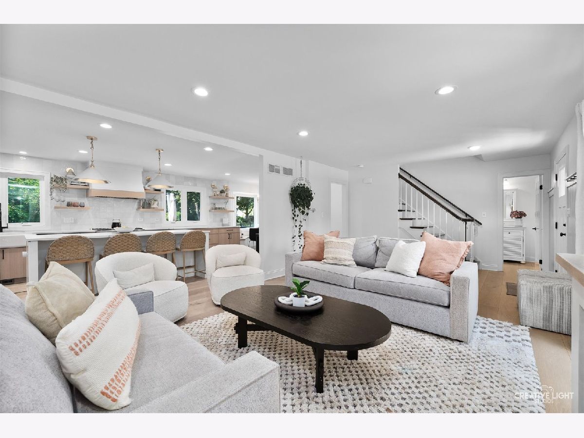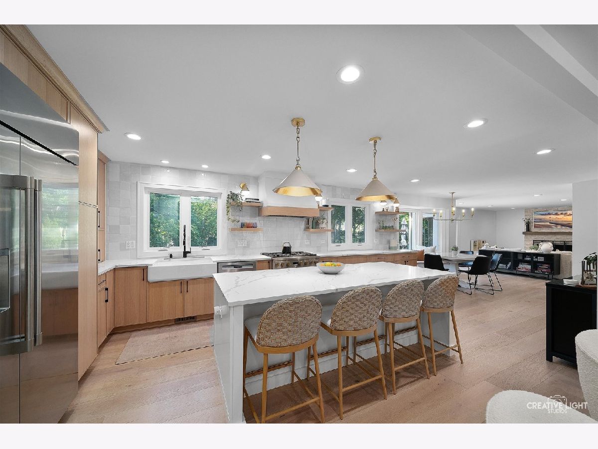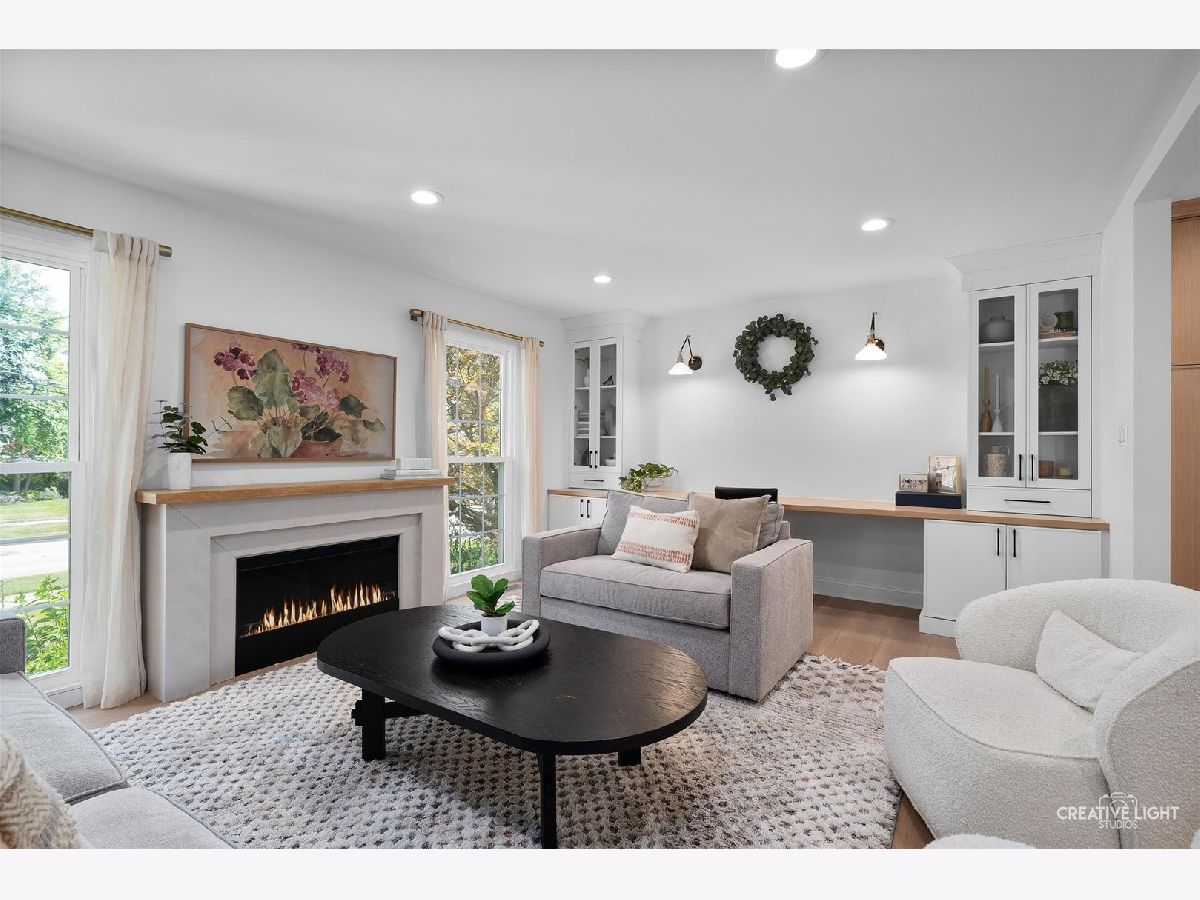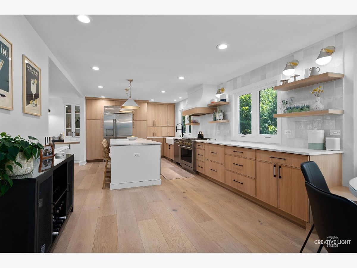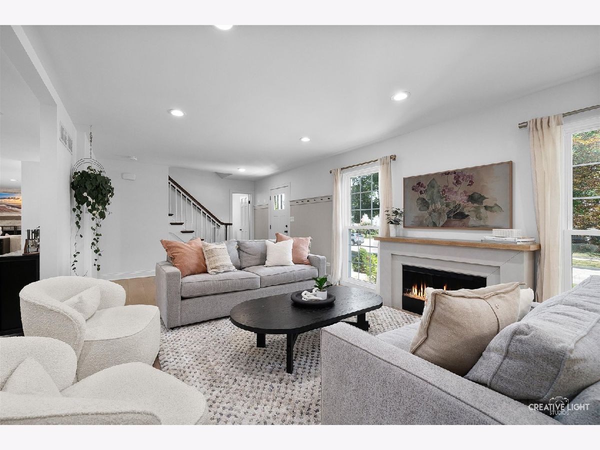 Welcome to 438 Hill Avenue, located in the heart of Glen Ellyn. This in-town charmer is situated just steps to school, town, train, restaurants, library, Prairie Path and Main Street Rec Center. Remodeled in 2022, the home features 3 bedrooms and 2.5 baths with finished basement. The open concept living room, kitchen and dining space features custom Greek Shake millwork cabinetry and floating shelves, Calacatta Laza quartz countertops, ceramic backsplash, GE Monogram refrigerator, range, hood, microwave and beverage fridge, Bosch dishwasher, Kohler farmhouse apron sink, bay window banquette with storage, built-in desk with custom millwork and wall sconce lighting, fireplace and white oak engineered flooring. The flowing floorpan also includes adjacent family room with scenic views of the fenced yard, mudroom/laundry room combo and attached two car garage. The second floor boasts generous sized bedrooms including a primary ensuite with custom shaker style double vanity, Kohler undercount sinks, Misterio quartz countertop, herringbone subway shower tile and accent wall, Delta brass bathroom fixtures and basketweave floor tile. Two additional bedrooms are light and bright with a shared hall bath. The finished lower level includes a large finished rec room with wood panel accent wall, custom built-in cabinets and plenty of storage space. Additional updates include front yard landscaping and paver walkway, high efficiency water heater, Trane Accuclean electronic hepa filtration system, April Aire bypass humidifier, new garage door with wi-fi and integrated camera, and upgraded 200-amp electric panel. Roof new in 2018 and driveway in 2019. Whether entertaining a group, or enjoying day to day family time, this home offers comfortable, updated living in a location that allows you to take advantage of all that the village has to offer. Simply move in and enjoy this wonderful home!