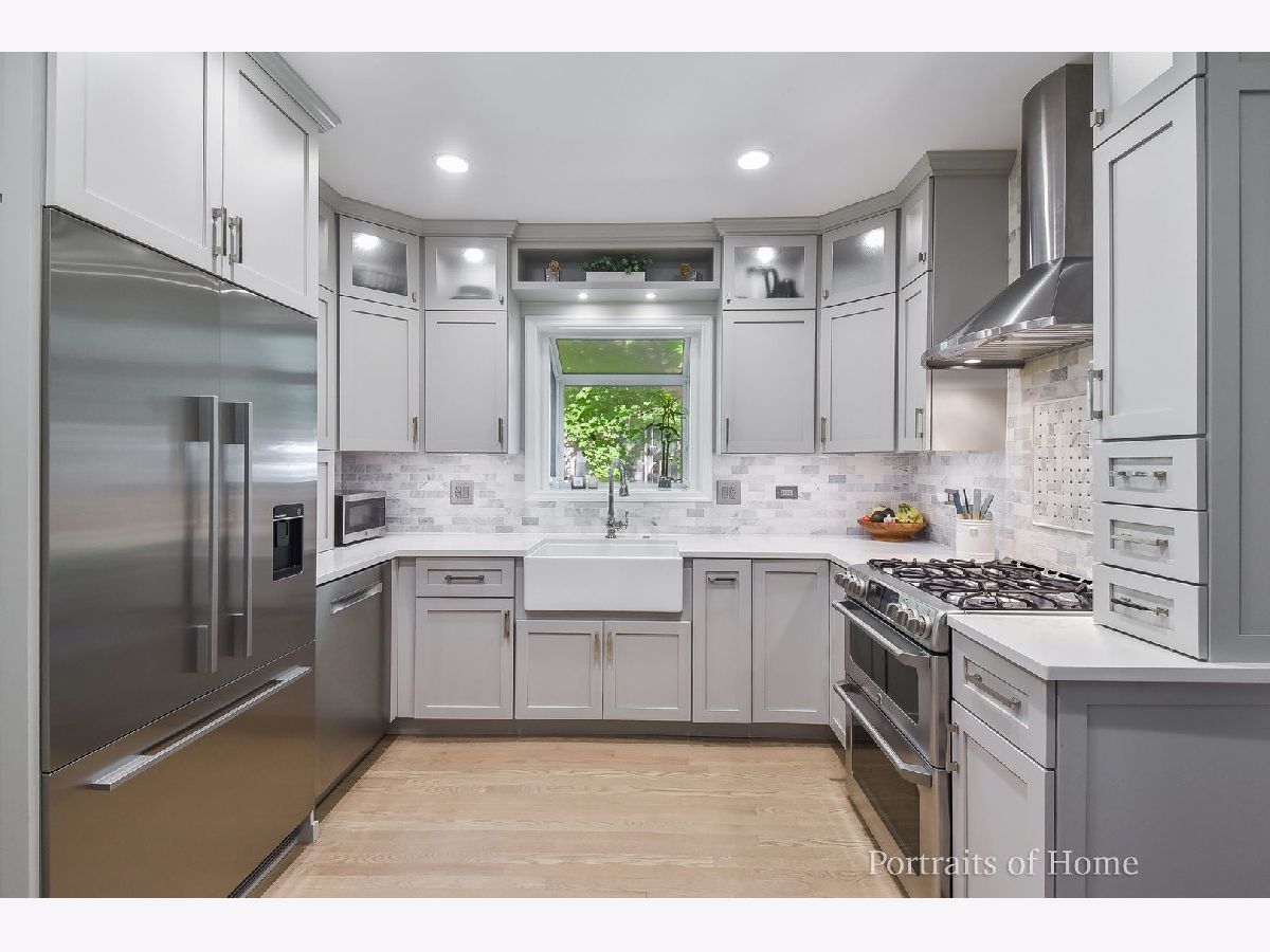 This updated bungalow features the best of vintage charm and contemporary amenities! Beautiful interiors combine with outstanding outdoor recreation spaces in a coveted location near elementary, pool, town, dining and shopping. The renovated kitchen is central to the main floor and perfectly located for gatherings inside and out. It has been updated with custom cabinetry, quartz counters, marble backsplash, farmhouse sink and stainless steel appliances including a Fisher and Paykel Refrigerator (new in 2022). The living and dining rooms enjoy an open layout and overlook the front yard and gardens. The family room has a new custom bar with beverage refrigerator and walk-out to the fabulous back patio and yard. Two bedrooms with generous closet storage are on the first level along with an updated full-bath and half-bath. On the second level is the master suite with a luxurious bathroom including dual sink vanity with marble counter, heated marble floor and marble shower surround. Extensive built-in closets offer generous storage on this floor. The renovated basement (2022) includes a recreation room with luxury vinyl plank floors, electric fireplace and entertainment center, plus large laundry and storage. The outdoor entertaining spaces include a paver patio with seat walls and built-in gas fire pit, along with a large fenced yard. The built-in kitchen has a stainless steel natural gas grill, outdoor stainless steel refrigerator and granite counter top. The front gardens are equally as pretty with paver walkways, perennials and mature trees. Extensive exterior updates (2020) include roof, gutters, facia, siding, cedar siding, cedar corbels, garage windows, and a remodeled front porch.