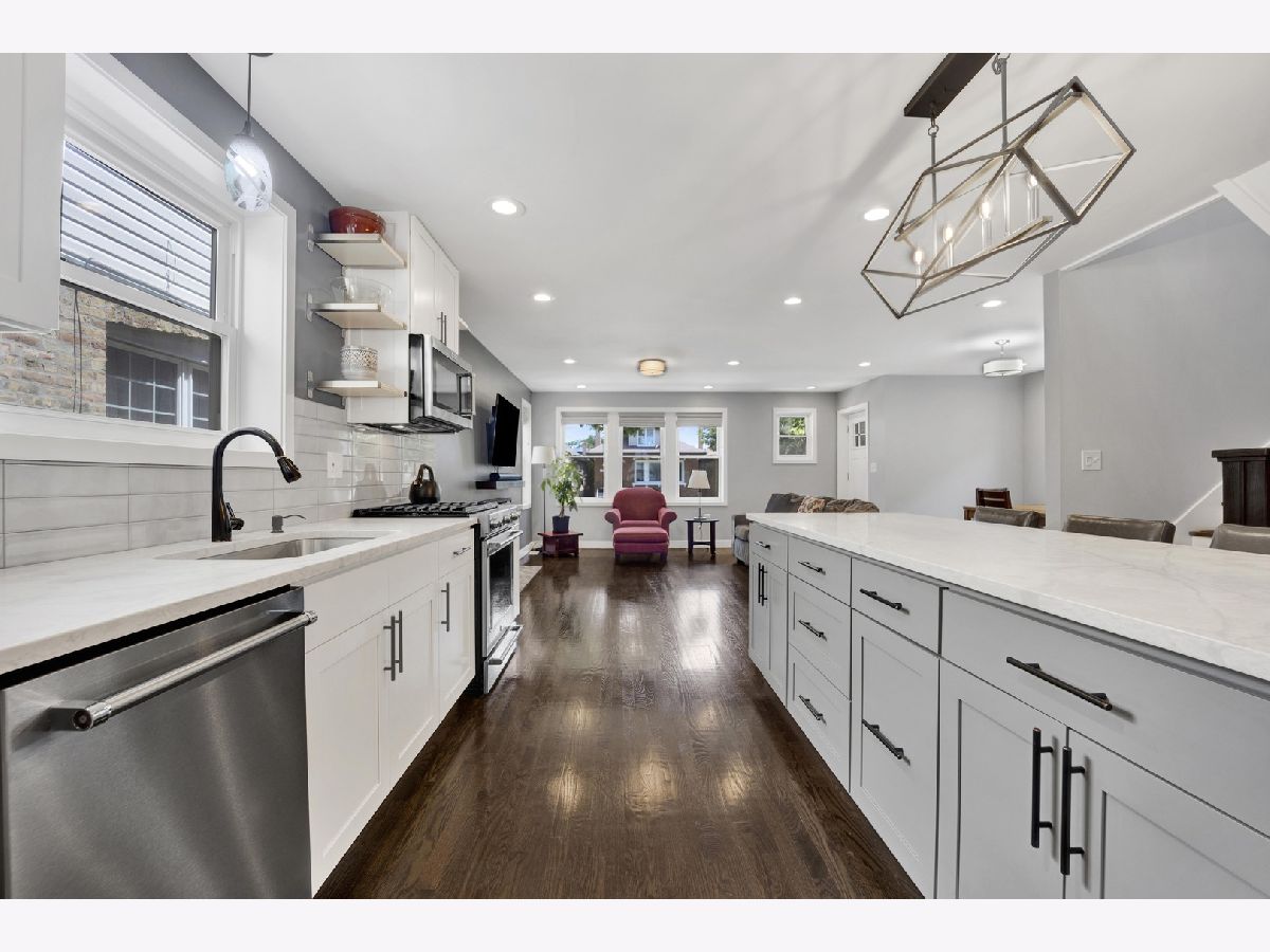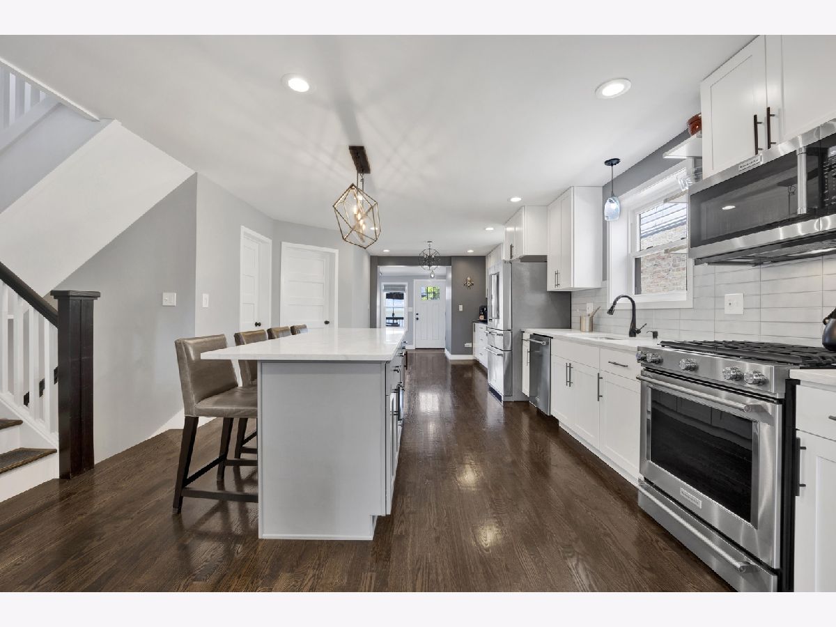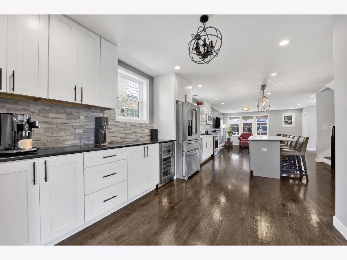 Stunning Renovated Bungalow in Portage Park - Introducing a beautifully rehabbed bungalow on an oversized lot, located on a quiet, tree-lined street in the heart of Portage Park. This spacious home features 4 bedrooms and 4 elegantly designed bathrooms, offering the perfect blend of classic charm and modern luxury. Step inside to an open-concept main level with a bright and airy living room that seamlessly flows into a chef's dream kitchen, complete with top-of-the-line stainless steel appliances, custom white cabinetry, quartz countertops, elongated subway tile backsplash, and a massive island with breakfast bar seating. Adjacent to the kitchen, you'll find a stylish dining area and a custom-designed coffee bar/butler's pantry including a wine fridge-ideal for entertaining. The main floor also includes one spacious bedroom, a full bathroom, and direct access to a maintenance-free Trex deck, perfect for relaxing or hosting guests. Upstairs, you'll find three generous bedrooms and two full bathrooms, including a luxurious primary suite with a private bath including designer finishes. The fully finished basement offers exceptional flexibility with a large family room, separate sleeping space, the perfect space for a wine cellar, bonus room, full bathroom, laundry room, and abundant storage. Additional highlights include a 2-car garage, electric fireplace in the main living room, waterproof luxury vinyl plank flooring in the lower level, new gutters in 2023, party door on garage, new security doors on the front and back of the house, and meticulous attention to detail throughout. Just minutes to the expressway, restaurants, and everything beautiful Portage Park has to offer!