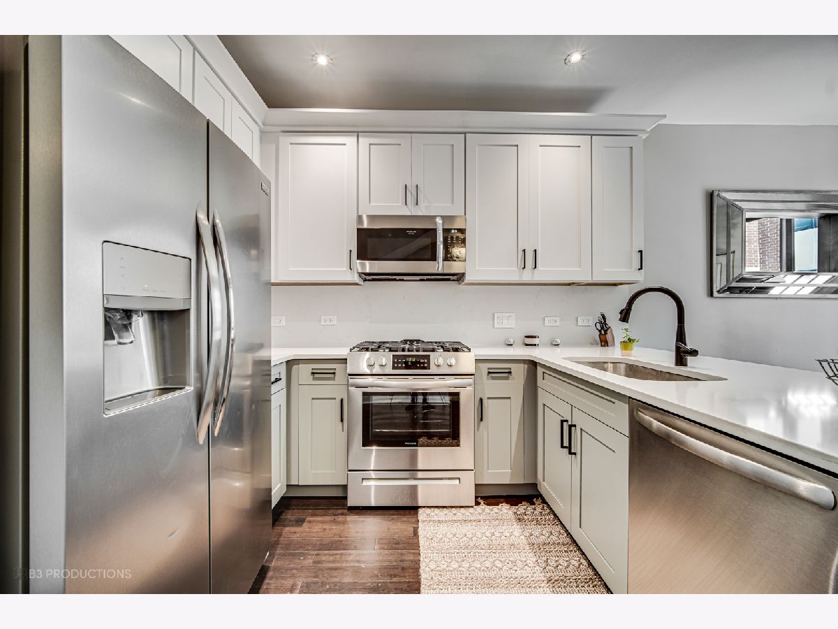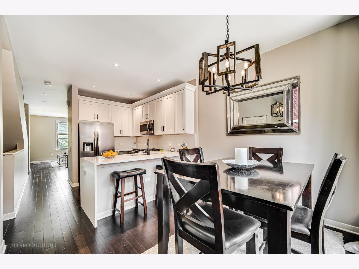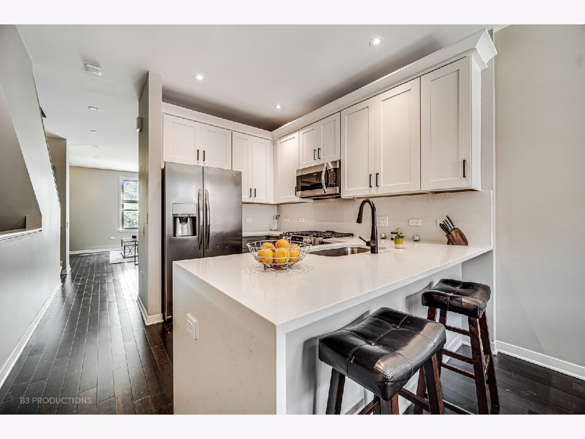 Rarely available completely renovated townhouse with 3 bedrooms and 3 full bathrooms centrally located between Old Town & River North. This transitional design with a wide open floor plan is south facing and has an abundance of light throughout. The view from your newly constructed private TREX rooftop deck looking over the Chicago skyline is perfect for entertaining. The kitchen features new white shaker custom cabinets and a waterfall quartz countertop. HDWD throughout the main level. The newly renovated bathrooms include Kohler and Delta fixtures and a design parallel to none. The first level living area is the perfect flex space to be utilized as a guest bedroom, home office, or gym and also has a full bath. The entire home includes LED lights throughout and nest system. The 1.5 car garage provides ample storage. Short walk to Whole Foods, New City center, steps to Wells street and all of the restaurants in Old Town, 5-minute walk to River North.