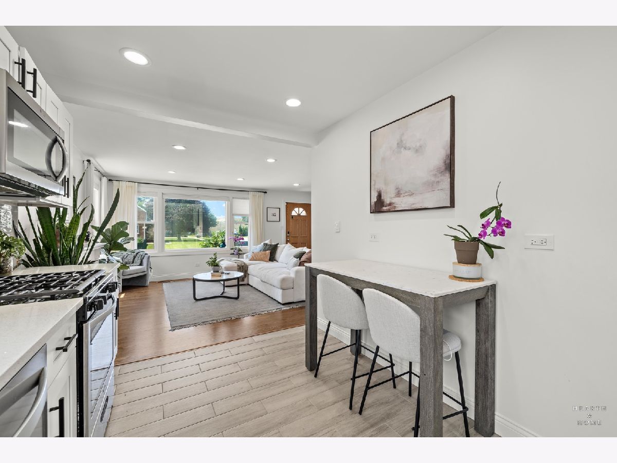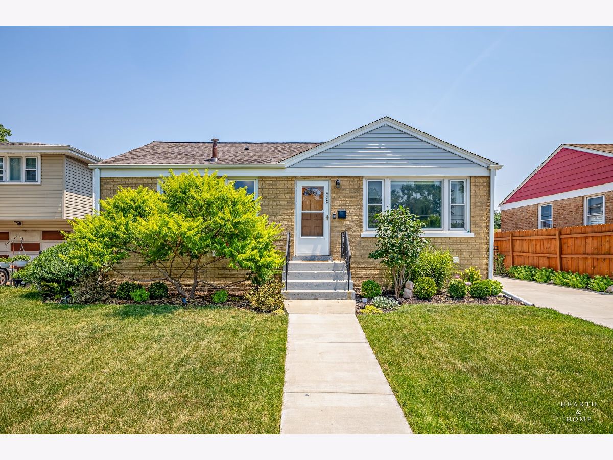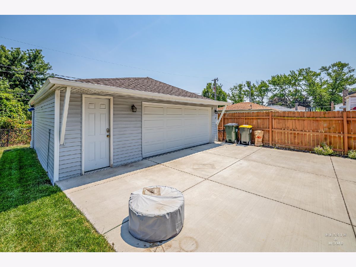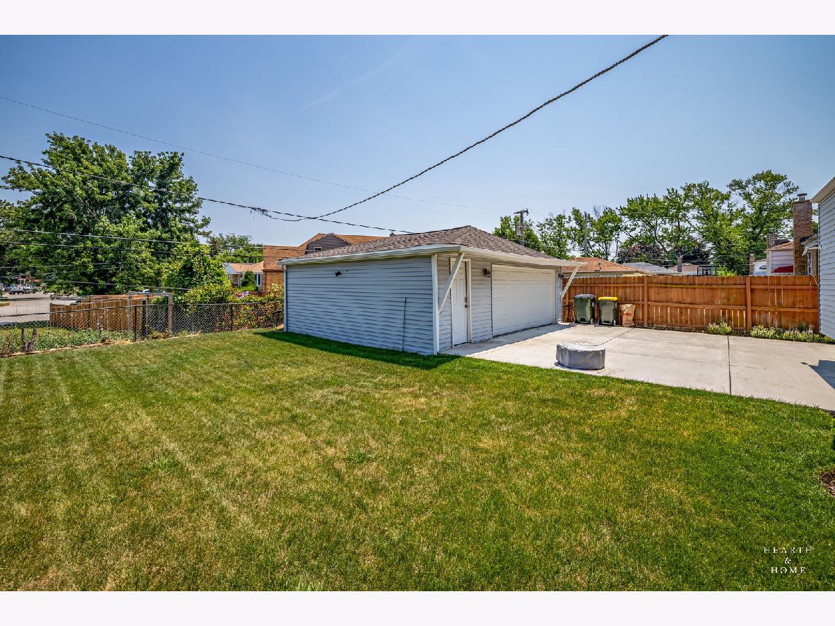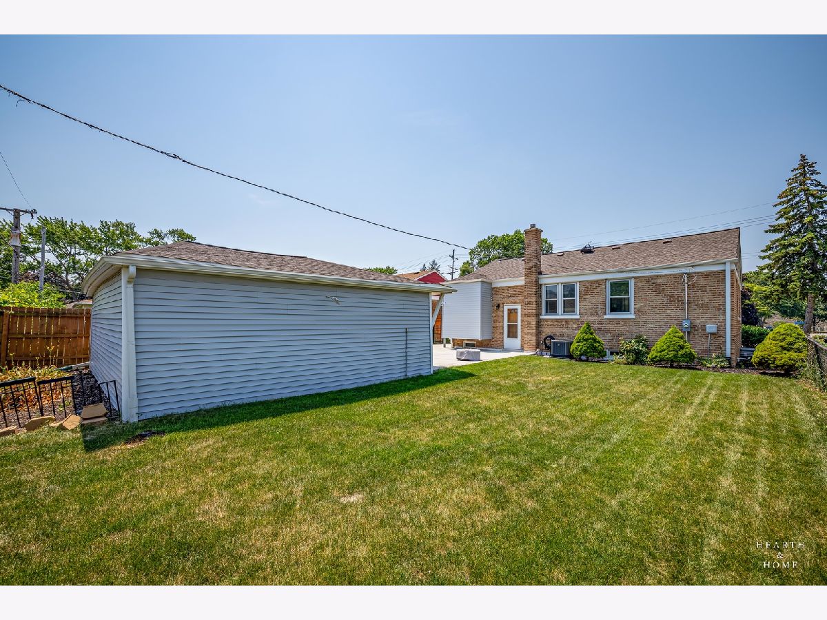 Superbly renovated 4 bedroom home with 2 full bathrooms and an oversized 2.5 car garage. Great bright and open ranch floor plan with high end finishes. Hardwood floors, updated lighting, and newer LVP flooring in remodeled kitchen and finished basement. Gorgeous kitchen is highlighted by stainless steel appliances, new hardware, beautiful tile backsplash, and an efficient eat-in area. One bedroom and bathroom in the basement in addition to a great rec room, fitness area, laundry room, and storage space. Spacious primary bedroom and one bedroom currently being utilized as a home office. Updated bathroom features white marble tile and a glass shower. Nice fenced backyard perfect for cookouts and entertaining. Tons of recent updates. NEW concrete driveway, new roof on house and garage, new attic ventilation, new insulation. High-efficiency HVAC system. Newer windows. Custom shades stay. Enjoy the convenience of easy interstate, Metra and O'hare access, while still enjoying peace and quiet inside your beautiful home, thanks to great soundproofing!