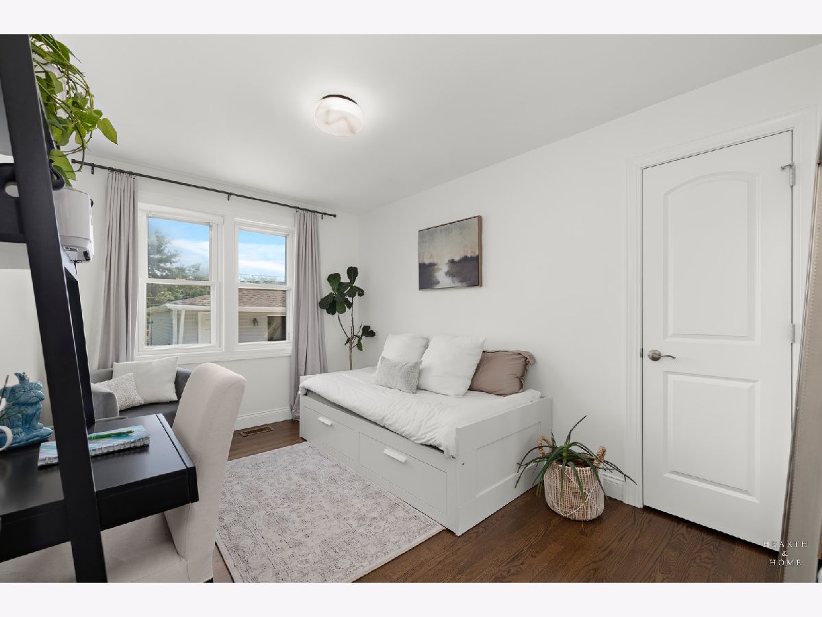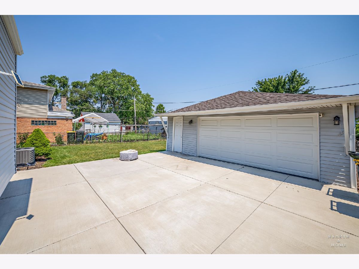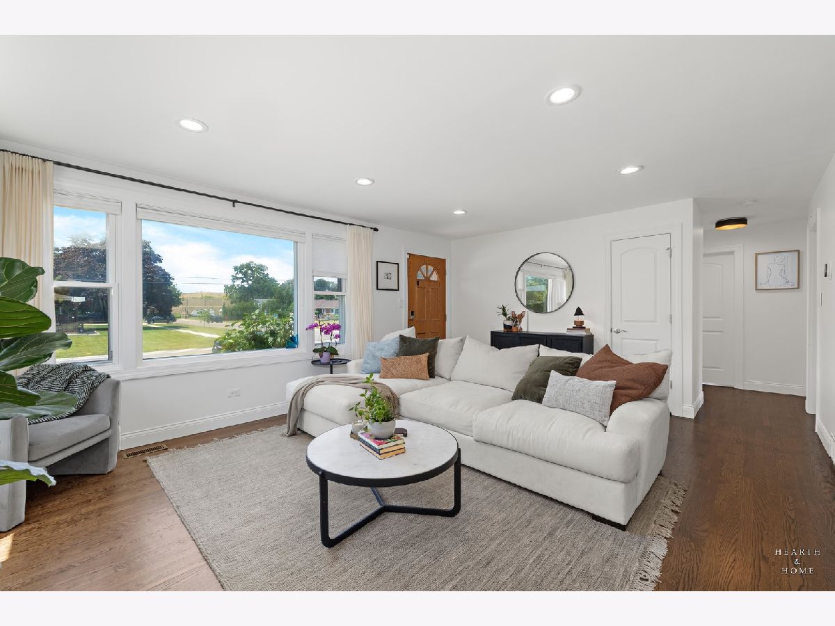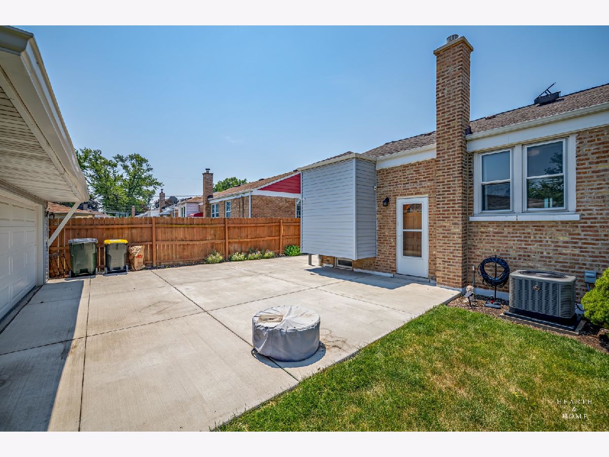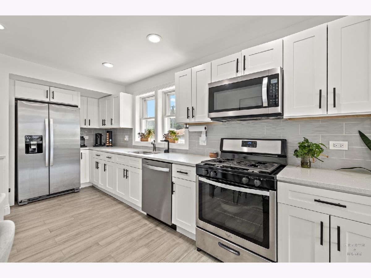 Superbly renovated 4 bedroom home with 2 full bathrooms and an oversized 2.5 car garage. Great bright and open ranch floor plan with high end finishes. Hardwood floors, updated lighting, and newer LVP flooring in remodeled kitchen and finished basement. Gorgeous kitchen is highlighted by stainless steel appliances, new hardware, beautiful tile backsplash, and an efficient eat-in area. One bedroom and bathroom in the basement in addition to a great rec room, fitness area, laundry room, and storage space. Spacious primary bedroom and one bedroom currently being utilized as a home office. Updated bathroom features white marble tile and a glass shower. Nice fenced backyard perfect for cookouts and entertaining. Tons of recent updates. NEW concrete driveway, new roof on house and garage, new attic ventilation, new insulation. High-efficiency HVAC system. Newer windows. Custom shades stay. Enjoy the convenience of easy interstate, Metra and O'hare access, while still enjoying peace and quiet inside your beautiful home, thanks to great soundproofing!