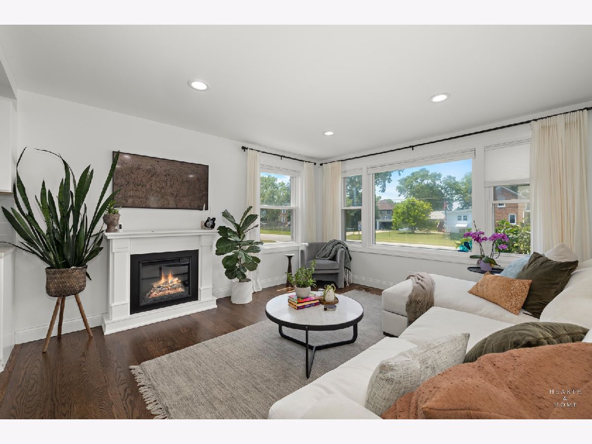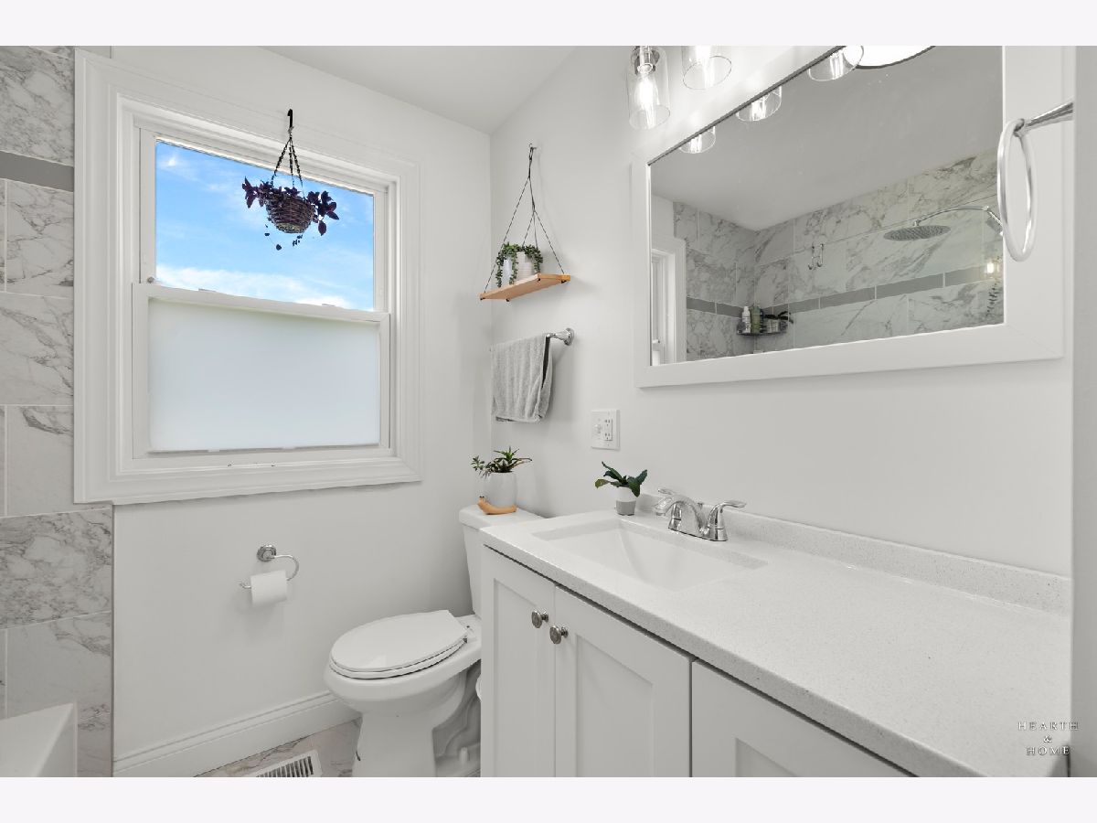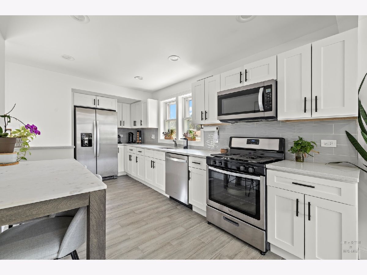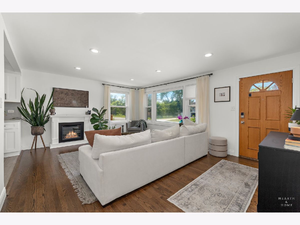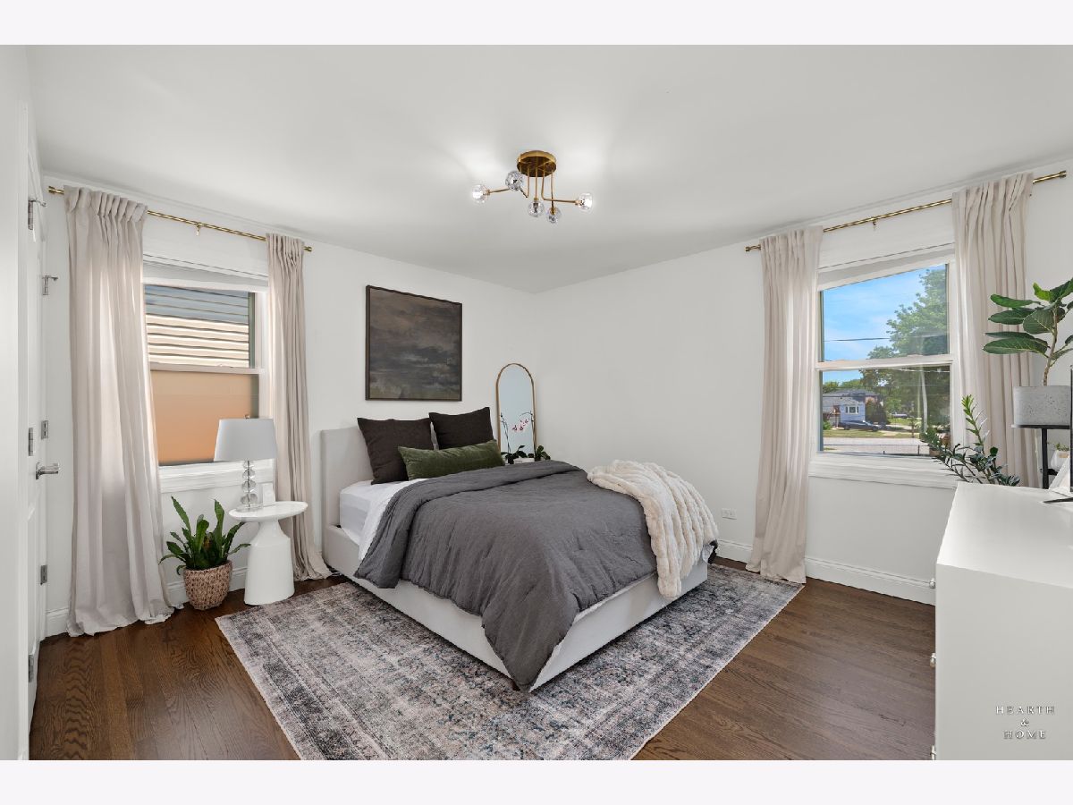 Superbly renovated 4 bedroom home with 2 full bathrooms and an oversized 2.5 car garage. Great bright and open ranch floor plan with high end finishes. Hardwood floors, updated lighting, and newer LVP flooring in remodeled kitchen and finished basement. Gorgeous kitchen is highlighted by stainless steel appliances, new hardware, beautiful tile backsplash, and an efficient eat-in area. One bedroom and bathroom in the basement in addition to a great rec room, fitness area, laundry room, and storage space. Spacious primary bedroom and one bedroom currently being utilized as a home office. Updated bathroom features white marble tile and a glass shower. Nice fenced backyard perfect for cookouts and entertaining. Tons of recent updates. NEW concrete driveway, new roof on house and garage, new attic ventilation, new insulation. High-efficiency HVAC system. Newer windows. Custom shades stay. Enjoy the convenience of easy interstate, Metra and O'hare access, while still enjoying peace and quiet inside your beautiful home, thanks to great soundproofing!