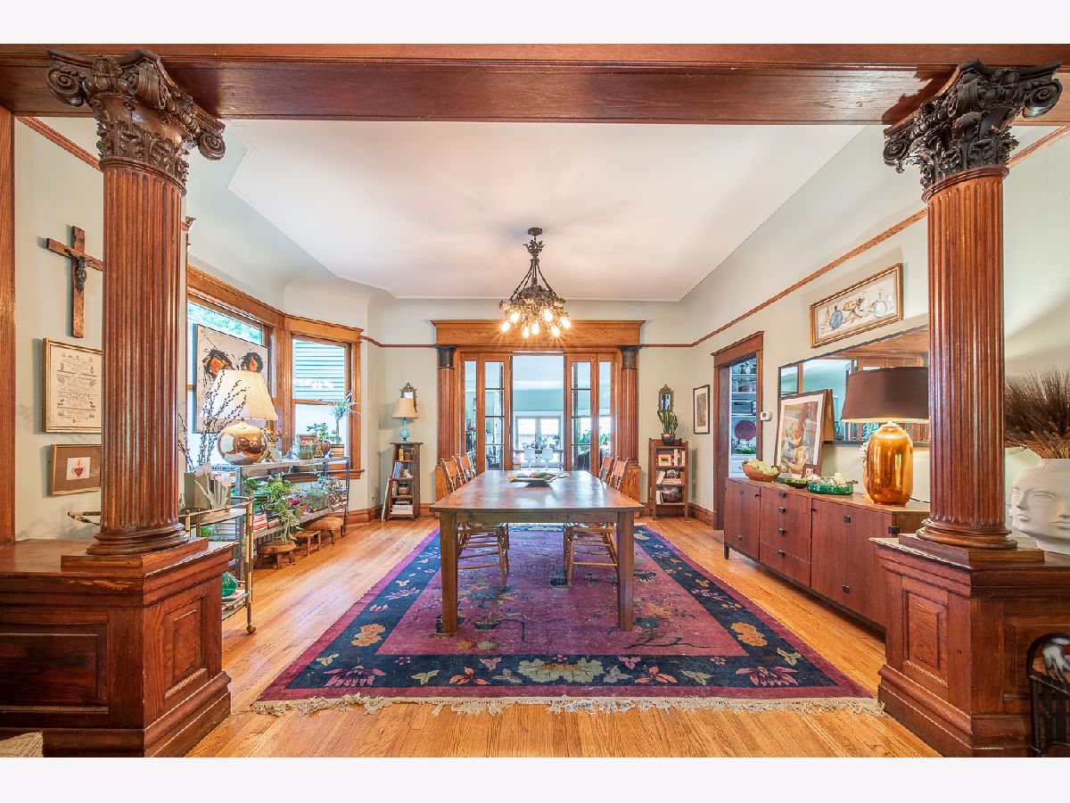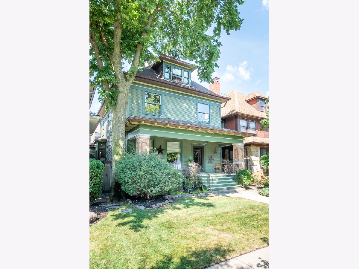 A rare opportunity to live on Historical Dover Street in a beautiful, American foursquare home. Built by the Wrigley Corporation in 1904 this home is loaded with both contemporary and vintage features. Enjoy the views of your extra wide, professionally landscaped lot from the comfort of the inviting front porch. Upon entering the picturesque foyer, you will notice the unparalleled craftsmanship of the builders, evident in the hand-carved columns and breathtaking extra wide staircase. Off of the foyer, the home's living room, sitting room and dining room all flow together, framed by the aforementioned columns creating a timeless aesthetic. The previous owner, a concert pianist, added a fantastic addition which was once used as a private concert hall. It has since been converted into a fabulous first-floor primary suite featuring soaring ceilings, skylights, three sets of french doors and an abundance of natural light. The second floor is host to tall ceilings and 3 bedrooms, one of which is a marvelous guest suite with an adjacent sitting room. The recently updated bathroom has separate vanities and an oversized walk-in shower with a rain shower head. The third floor of the home, once the servant quarters with water services, offers a unique opportunity to add a home office, family room or play space which would overlook the front and back yard. Last but not least, the entire home sits on a large unfinished basement. This home offers a 3 car, detached garage and is truly one of a kind!