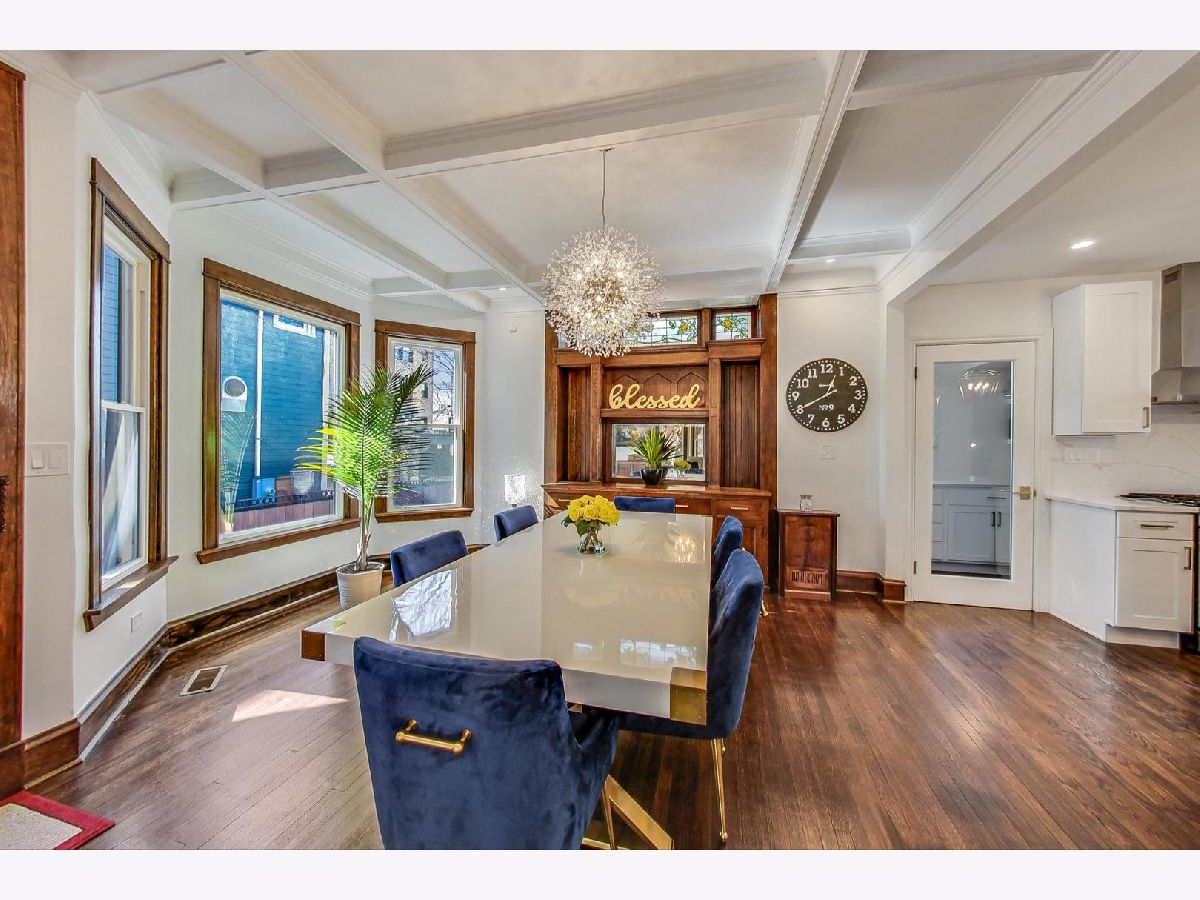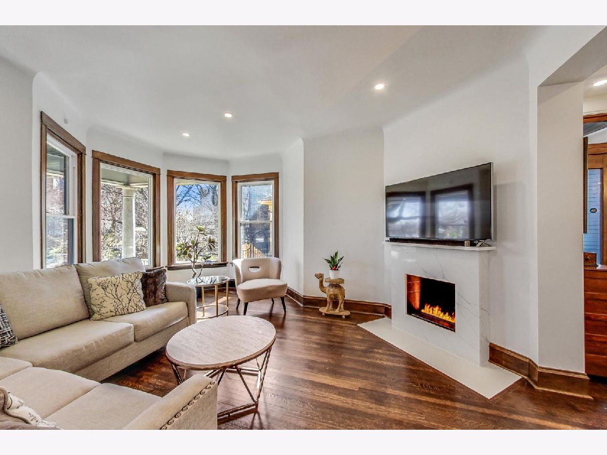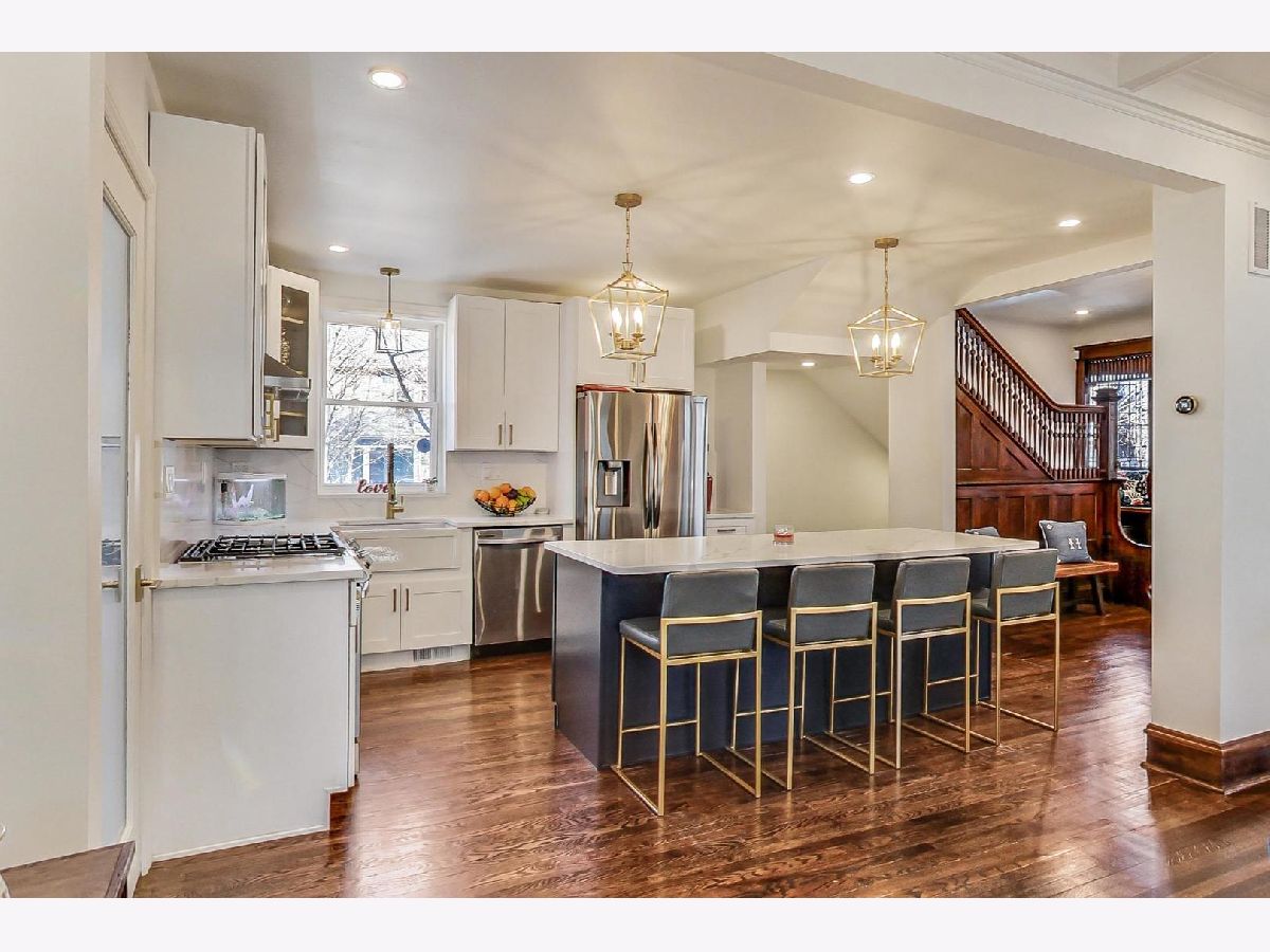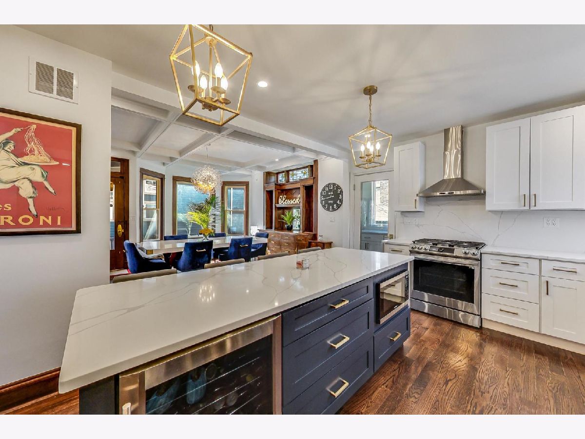 Located in the heart of the desirable Ravenswood/Lincoln Square neighborhood of Chicago, this stunning three-story Victorian home blends traditional charm with newly finished modern updates Completely remodeled in 2022. Offering 5 bedrooms, 3 bathrooms, and 4000 square feet of living space with incredible old world charm mixed with new modern flair! Brand new kitchen boasts new white solid wood Shaker style cabinetry blended with quartz countertops, stainless steel appliances, and an 8-ft island with solid wood blue cabinetry, a built-in microwave and wine cooler (2022), and breakfast bar. The main level offers large open floor plan offering living room with new picture windows, modern electric fireplace with quartz mantle. The perfectly positioned dining area has traditional refinished wood cabinets and coffered ceilings, along with door leading to your outdoor wrap around side porch. Taking you to the second floor is a one of a kind solid oak staircase leading you to the three spacious bedrooms and remodeled bathroom with a double vanity and stand-up shower. The third-floor master suite has an ensuite master bathroom with marble double vanity and large shower, and a walk-in closet. The fully finished walk-out basement provides recreation area, 5th bedroom, full bathroom, laundry room with a new washer/dryer, and extra storage. Recent upgrades include a new roof, electric, dual HVAC system, hot water heater, vinyl siding, gutters, and a newly paved 3-4 car tandem driveway. The home retains its original stained-glass windows and features an attached side and front porch. Situated on a tree-lined street, it's minutes from parks, top restaurants, shopping, and Lincoln Square, with easy access to public transit and I-90/94. A perfect blend of vintage charm and modern convenience-don't miss this one!