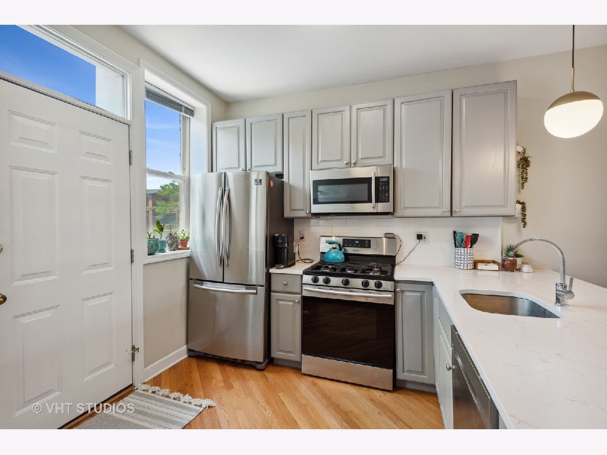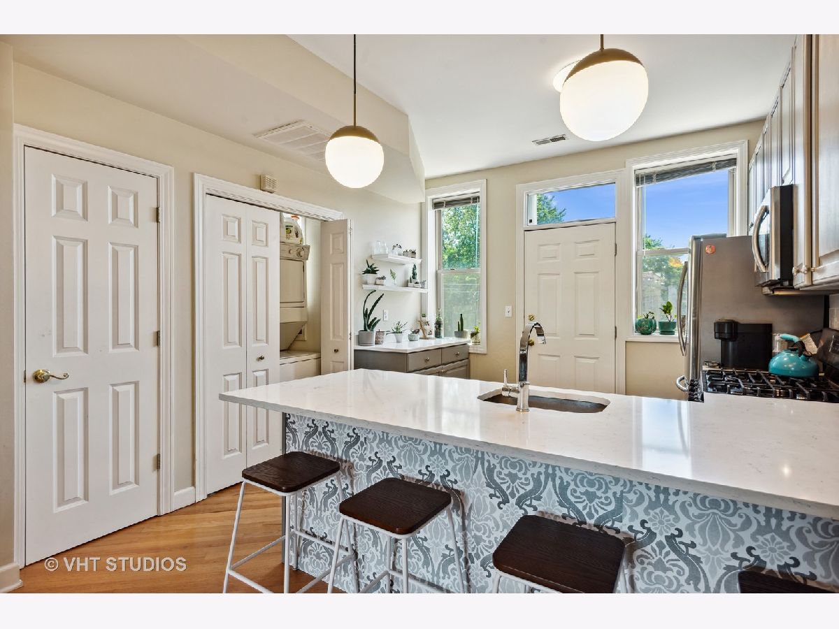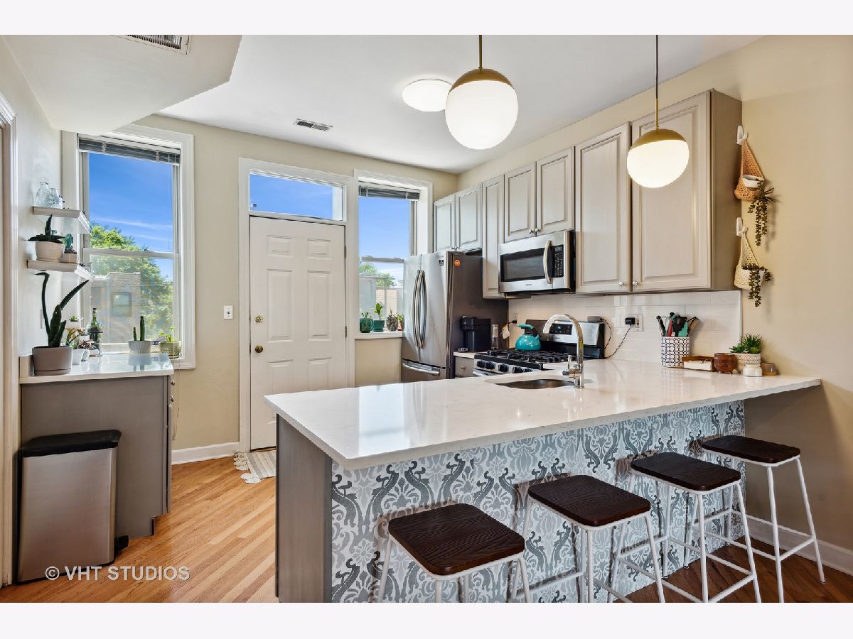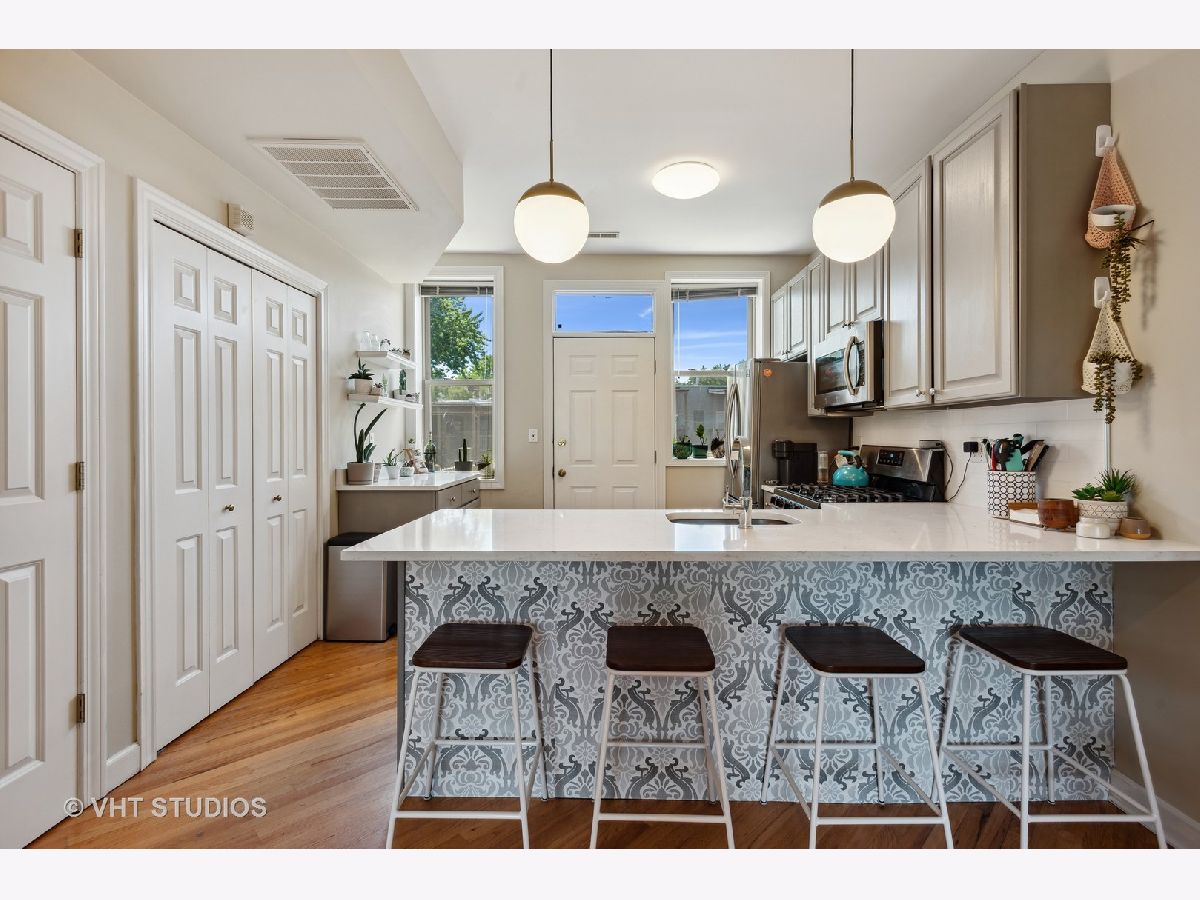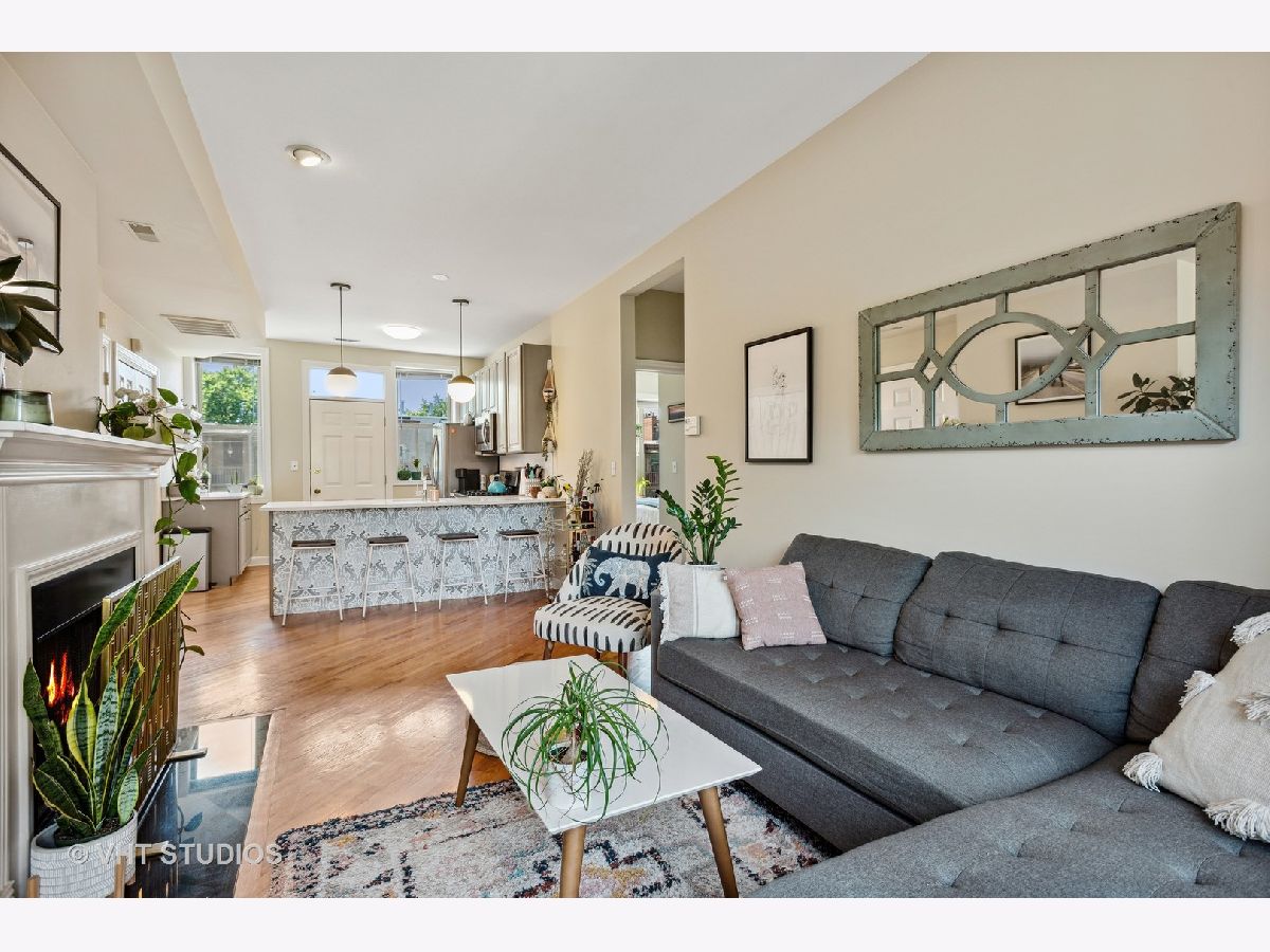Gorgeously updated boho-chic condo in the heart of Uptown! Top floor unit, drenched in sunlight, overlooking the lush and manicured courtyard. Open concept layout for entertaining. Beautifully updated kitchen with tons of cabinet space, newly painted cabinets (2020), and crisp white quartz countertops (2020) including a large breakfast bar and buffet sidebar. Stainless steel appliances (2019) and in-unit laundry. Thoughtfully updated bathroom with new vanity (2020) and medicine cabinet (2020) and wallpapered accent wall (2020). Diagonal hardwood floors add additional charm throughout the living areas. Gas fireplace for you to cozy up to at night. Two generously sized bedrooms with large closets with organizers. Spacious back balcony where you can BBQ, plant herbs, and retreat and relax after a long day. Wonderfully maintained front courtyard for you and your furry friends (pet-friendly!) to relax. Central HVAC. Dedicated deeded exterior gated parking space. Very large storage closet is dedicated to this unit. Bike storage in the basement. Walk to many good restaurants, stores, and the lake. Easy access to Lake Shore Drive. This one is too good to pass up!