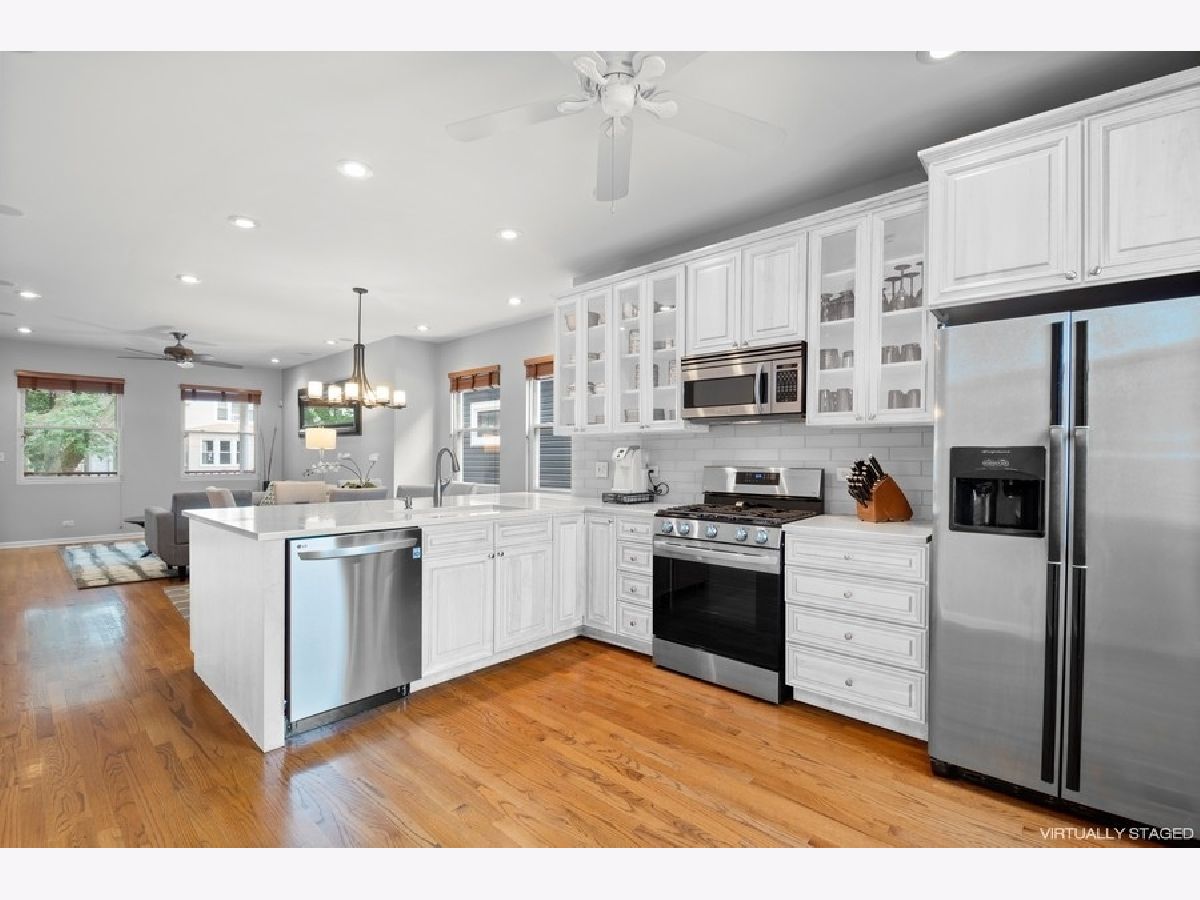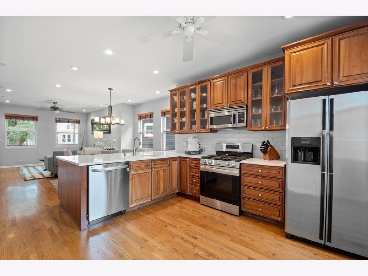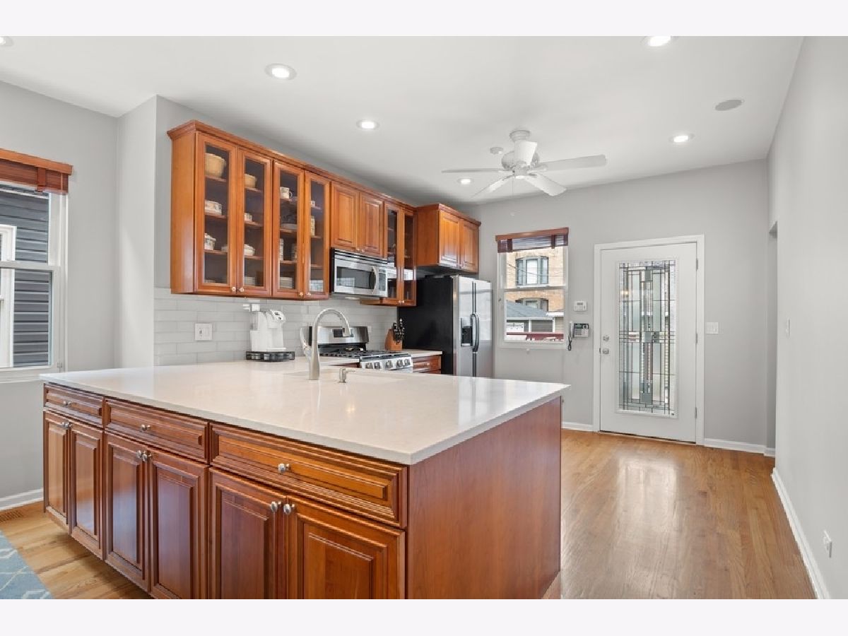Six Corners/Old Irving extra wide single family on an oversized 37.5 x 125 lot! One of the more delightful homes on the block due to its lovely front porch and sizable yard space. Home is bright throughout because of the wider setbacks from the neighboring houses. Excellent floor plan and flow starting with the main floor with its open Great Room that includes a spacious Living Room, Dining Room that accommodates a table of 8, and huge Kitchen with an abundance of cabinets and Quartz countertops; also includes Stainless Steel appliances (oven range and dishwasher new in 2020) and a walk-in pantry! Main floor is split to offer privacy to the back Bedroom and full Bath with its shower/tub combo. The sizable mud room is located in the ideal spot: off of the kitchen where most enter and exit their home. Top floor includes 3 roomy bedrooms and a HUGE bath: check-out the floor plan and 3D tour to see how spacious each room is and the abundance of closet space. Make sure to look at the cool extra spaces like the Primary bedroom with an organized, walk-in closet, the office nook in the front bedroom and note the wider hallway and staircase. Top floor bath offers 2 pedestal sinks, medicine cabinets, extra large linen closet, tub/shower combo with handheld shower head, subway tile surround/wainscoting. Fully finished lower level has it all: large family room with plenty of space to function as a rec room, play room, gym, office and/or workshop. Full bath with tub/shower combo. Oversized laundry room with slop sink. TONS of closet and storage space. Exterior door exits to backyard. Unbeatable outdoor space with not only the delightful front porch, but also a spacious back deck off of the kitchen that leads to a huge backyard fully enclosed with a privacy fence. The yard is low maintenance and includes in-ground sprinkler system. Plenty of parking with the 2.5 car garage PLUS an exterior parking pad that could be used for parking or patio space. Lots of extras in this house: beautiful hardwood floors, dual zoned heating and cooling, recessed lighting, built-in speakers on main floor, tons of closet space throughout, newer backsplash in Kitchen, etc... Highly walkable location: close to redeveloping Six Corners with its fabulous mix of shops and restaurants as well as large scale developments happening now, 2 blocks to Grayland Metra stop, walkable to Blue Line at Montrose or Irving, quick access to 90/94 or Milwaukee Avenue to zip around the City or to the suburbs.
