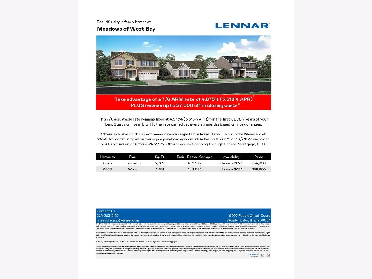 The Townsend model is an elegant two-story home with a 2-car garage, four spacious four bedrooms, 2 bathrooms, a full garden basement, and a fireplace. Ready for occupancy, January 2023. A large foyer opens immediately into the living room, dining room, kitchen, and family room with an open concept design for spending time with loved ones or entertaining guests. Lennar prides itself on building your home with superior quality, so every home is protected by a 10-year structural warranty. Our Everything's Included program in our newly constructed homes includes top-of-the-line features. Our fully appointed kitchens include Aristokraft cabinets, Quarts countertops, and GE appliances. Our homes also feature 9' first-floor ceilings, Decorative Rail, LED surface mounted lighting in the hallways and bedrooms, modern two-panel interior doors and colonist trim, vinyl flooring in the kitchen, foyer, powder room, bathrooms, and laundry room, a garage door opener, 30-year architectural shingles and so much more, all of which are included with your new home at no extra cost. Plus, the Connected Home by Lennar now provides even more convenience and peace of mind for our Customers with the Ring Video Doorbell Pro and Alarm Security Kit. All of our homes are WIFI guaranteed with no dead spots. West Bay is located just west of Wonder Lake, an 816-acre, 3.5-mile-long private lake that features a private gated entry boat launch, a bird island, Lookout Point Park, and walking paths along and throughout the community. * Exterior Photo is only from a similar model * * Taxes are not fully assessed*