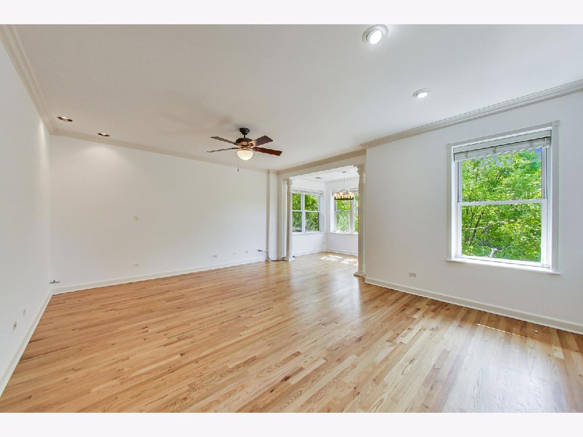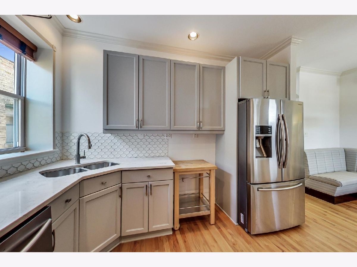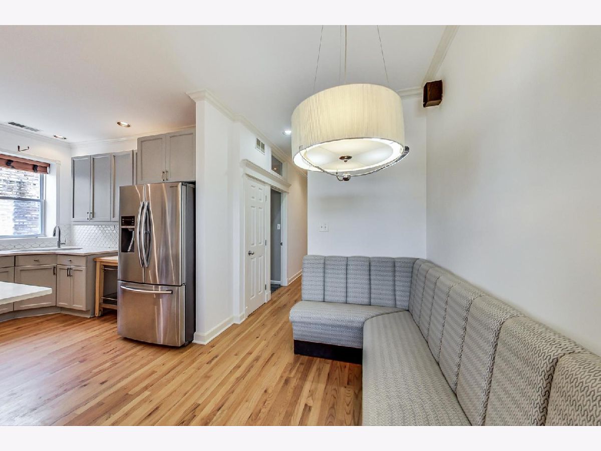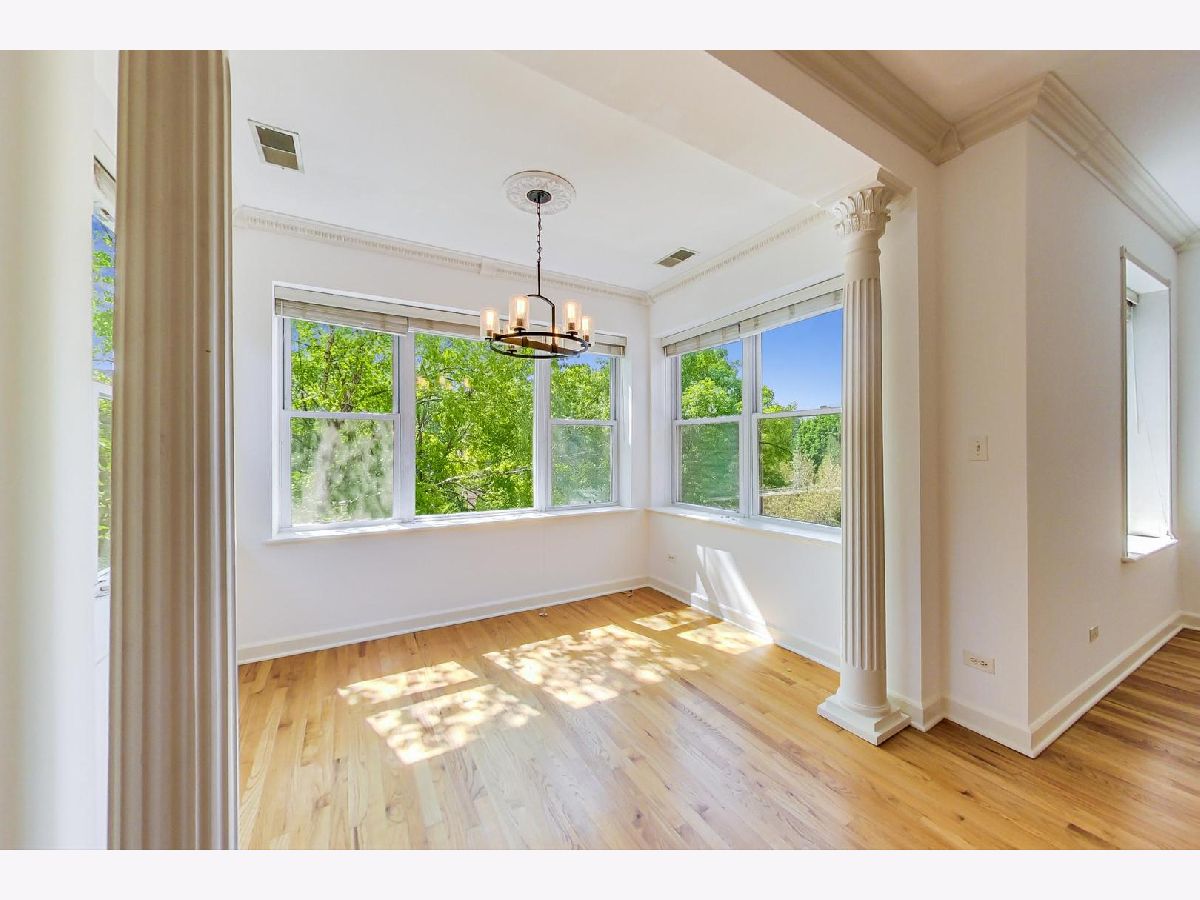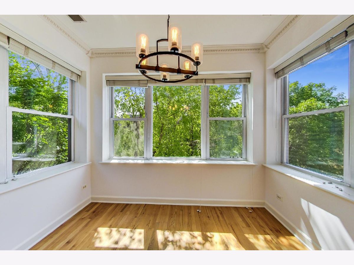 Vintage modern penthouse in Sheridan Park. This 1400 sq foot 2bed/2bth with wrap around windows & 10ft+ ceilings has an extra wide living room with separate West facing sunroom sunroom perfect for a home office. Enormous 150 sq ft rear deck off classic light grey kitchen with upgraded stainless steel appliances, quartz countertops with breakfast bar, unique tile backsplash, plus a built in custom booth. Custom lighting throughout. Other details include: washer/dryer, wood blinds, hardwood floors, recessed lighting and speakers for surround sound in various rooms, thick crown molding and transom windows above the bedroom doorways. Primary bedroom has an en suite bath with separate shower, double sinks, + whirlpool tub. Great closets throughout (1) gated outdoor pkg space & easily accessible storage. Walk Everywhere, a few blocks to the redone Wilson Redline stop, the lake, and Andersonville.