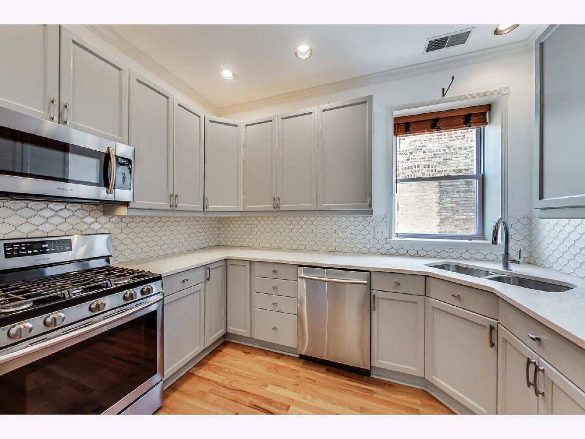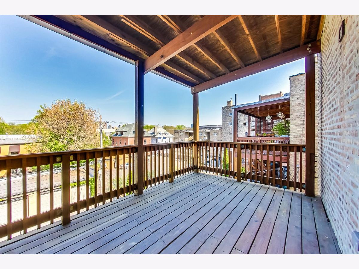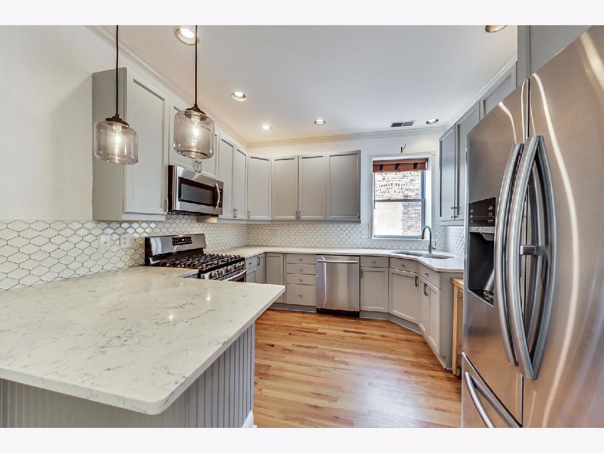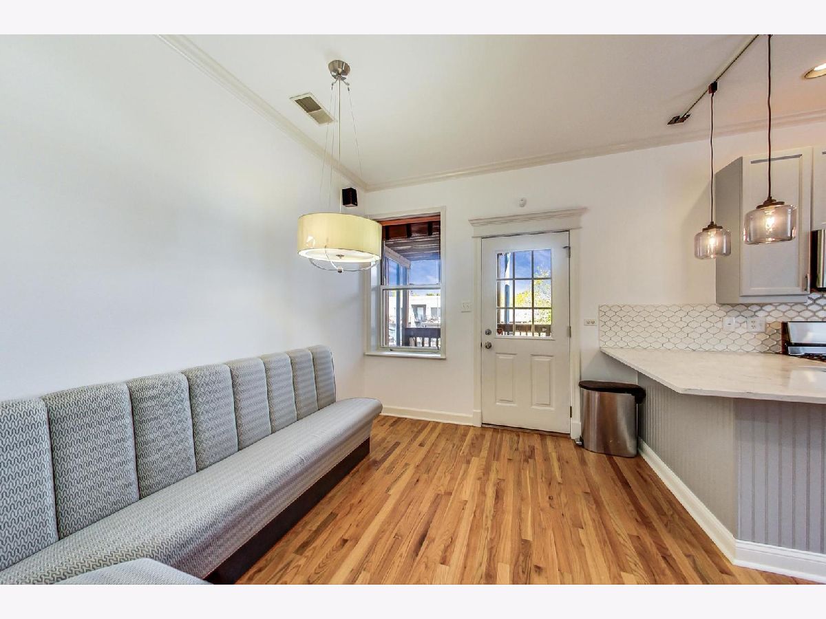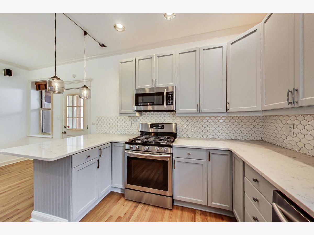 Vintage modern penthouse in Sheridan Park. This 1400 sq foot 2bed/2bth with wrap around windows & 10ft+ ceilings has an extra wide living room with separate West facing sunroom sunroom perfect for a home office. Enormous 150 sq ft rear deck off classic light grey kitchen with upgraded stainless steel appliances, quartz countertops with breakfast bar, unique tile backsplash, plus a built in custom booth. Custom lighting throughout. Other details include: washer/dryer, wood blinds, hardwood floors, recessed lighting and speakers for surround sound in various rooms, thick crown molding and transom windows above the bedroom doorways. Primary bedroom has an en suite bath with separate shower, double sinks, + whirlpool tub. Great closets throughout (1) gated outdoor pkg space & easily accessible storage. Walk Everywhere, a few blocks to the redone Wilson Redline stop, the lake, and Andersonville.
