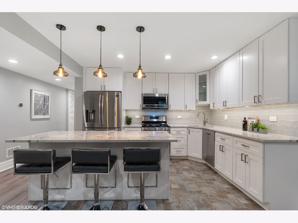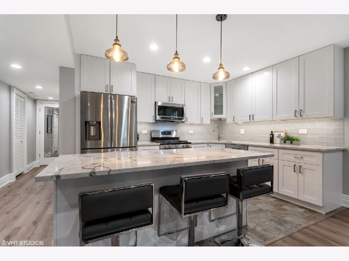 Stunning rehabbed condo on pretty tree-lined Kenmore! This sunny garden unit with a private entrance and outdoor space will impress. Rehabbed in 2019, this unit features all of today's finishes with style and a smart design. Upon entering, the spacious great room greets you with ample living space, real dining space and a beautiful white kitchen with stainless appliances, glass front cabinets, quartz countertops, large center island with storage, pendant and under-cabinet lighting and custom glass tile backsplash. Both bedrooms are graciously sized with great closets, the primary bedroom with a large, organized walk-in. The primary bathroom boasts a dark-wood double sink vanity with oil-rubbed bronze fixtures and a large walk-in glass standing shower complete custom tile work, body sprays and hand shower. The hall bath is finished in clean white tile and coordinating dark wood vanity and fixtures. Both baths have radiant heated floors. This home includes a Nest Thermostat, in-unit washer/dryer and full walk-in pantry closet, great in-unit storage, private front patio, common landscaped backyard and on-site secured parking. The self-managed, pet friendly building is a vintage rehab with charm and character throughout. All this in an amazing Uptown location walking distance to the El, the lakefront, shopping, dining and entertainment including some of the city's best music venues.