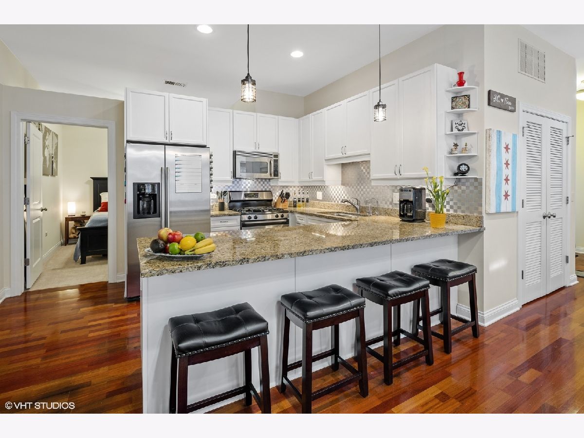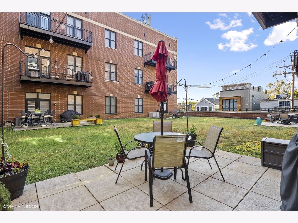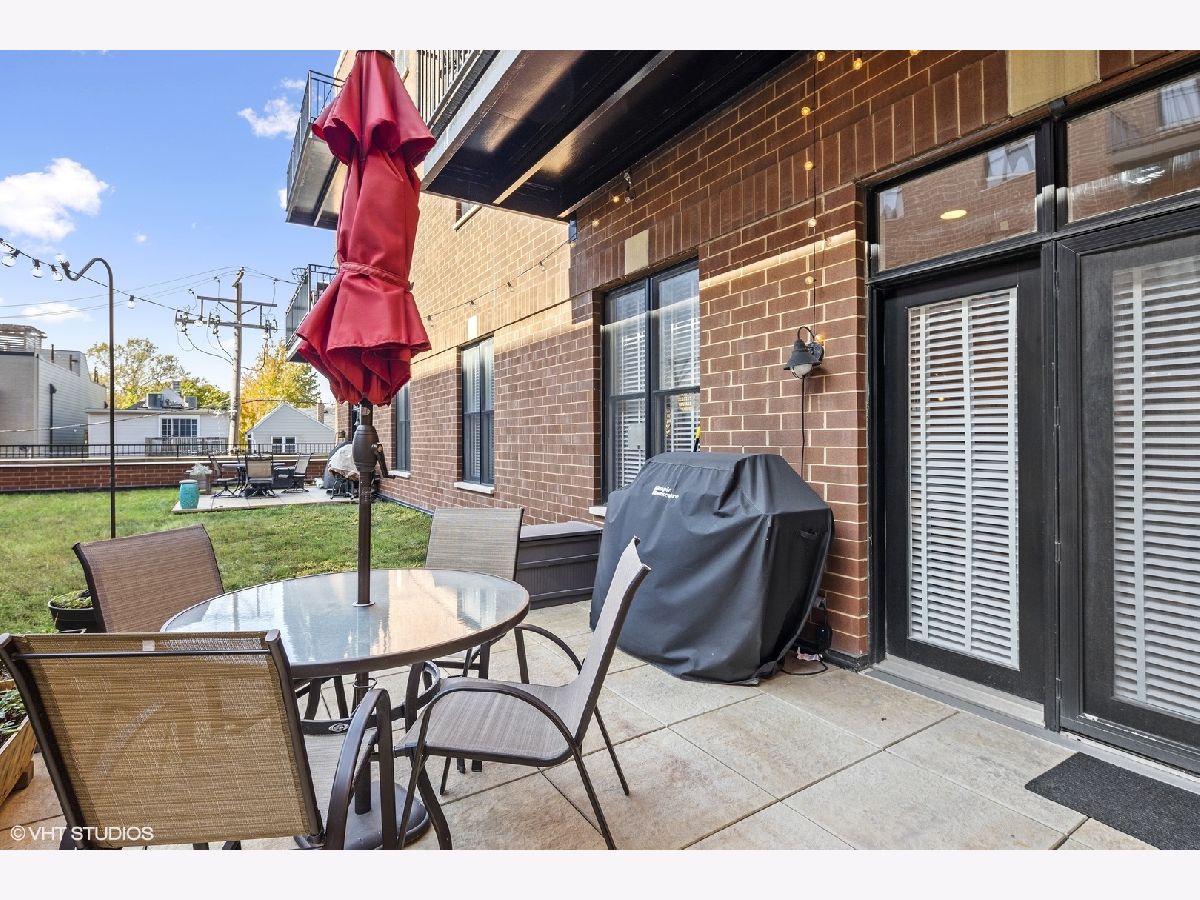 Boasting a sophisticated design, spacious layout, and incredible outdoor space, this 3 Bedroom 2 Bath home is perfectly located in the heart of Lincoln Square/Ravenswood neighborhood. Largest tier in the building, features nearly 10 ft. ceilings and is wired for sound with built-in powered speakers in 4 rooms. The updated kitchen with crisp white cabinetry, granite counter tops, stainless steel appliances, a three-stage water filtration system, stainless backsplash and breakfast bar that seats four, opens to a 23' dining/living room area. Living room opens to 200sqft private stone patio on a lush green roof, ideal for entertaining and perfect to ride out the pandemic!! A large master bedroom suite with walk through closet, full bath with double sink, whirlpool tub and separate shower. 2 additional large bedrooms, one with French doors, which makes perfect work-at-home office, and full bath. Need two offices? No problem: 3rd BR serves as guest room but also has walk in closet converted to little office with shelving. Unit has all other features buyers are seeking: quaint entry foyer, in unit washer/dryer, 2 deeded heated garage parking spaces included in the price (a 50k value) & assigned additional storage. Common rooftop deck has a wonderful skyline view. Beautifully maintained 2 elevator building. Ideal location with CVS on lower level, steps to Metra, Brown Line, parks, Marianos, plus unique shops and all the best restaurants and cafes on North Damen & just minutes to Lincoln Ave A must see!
