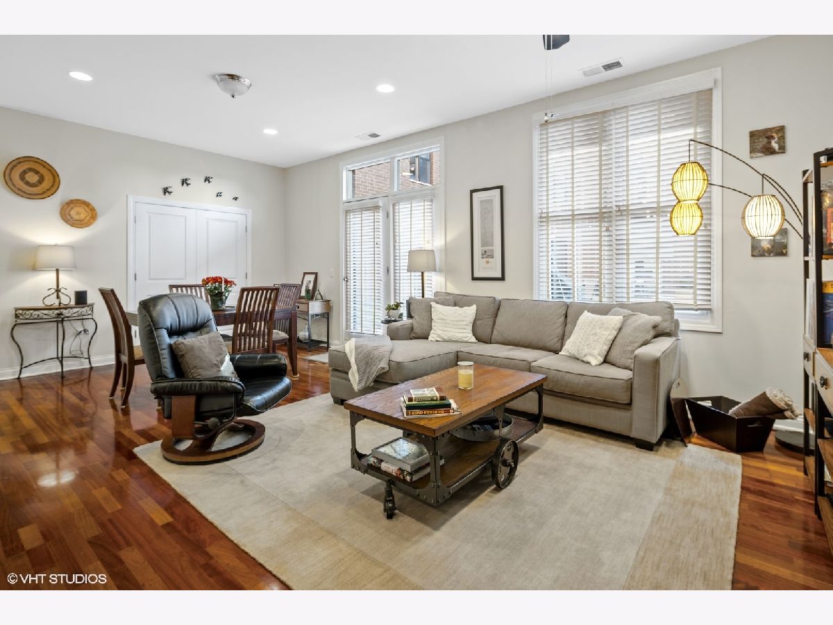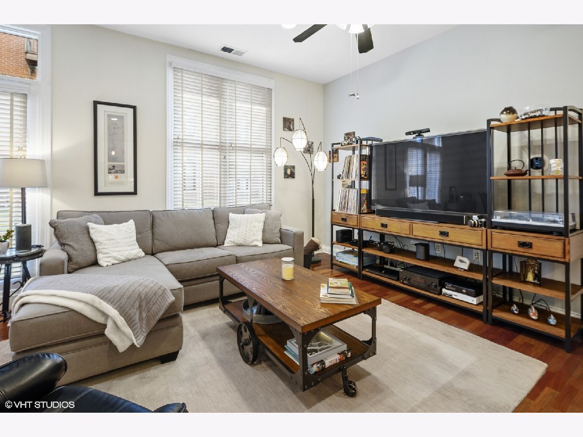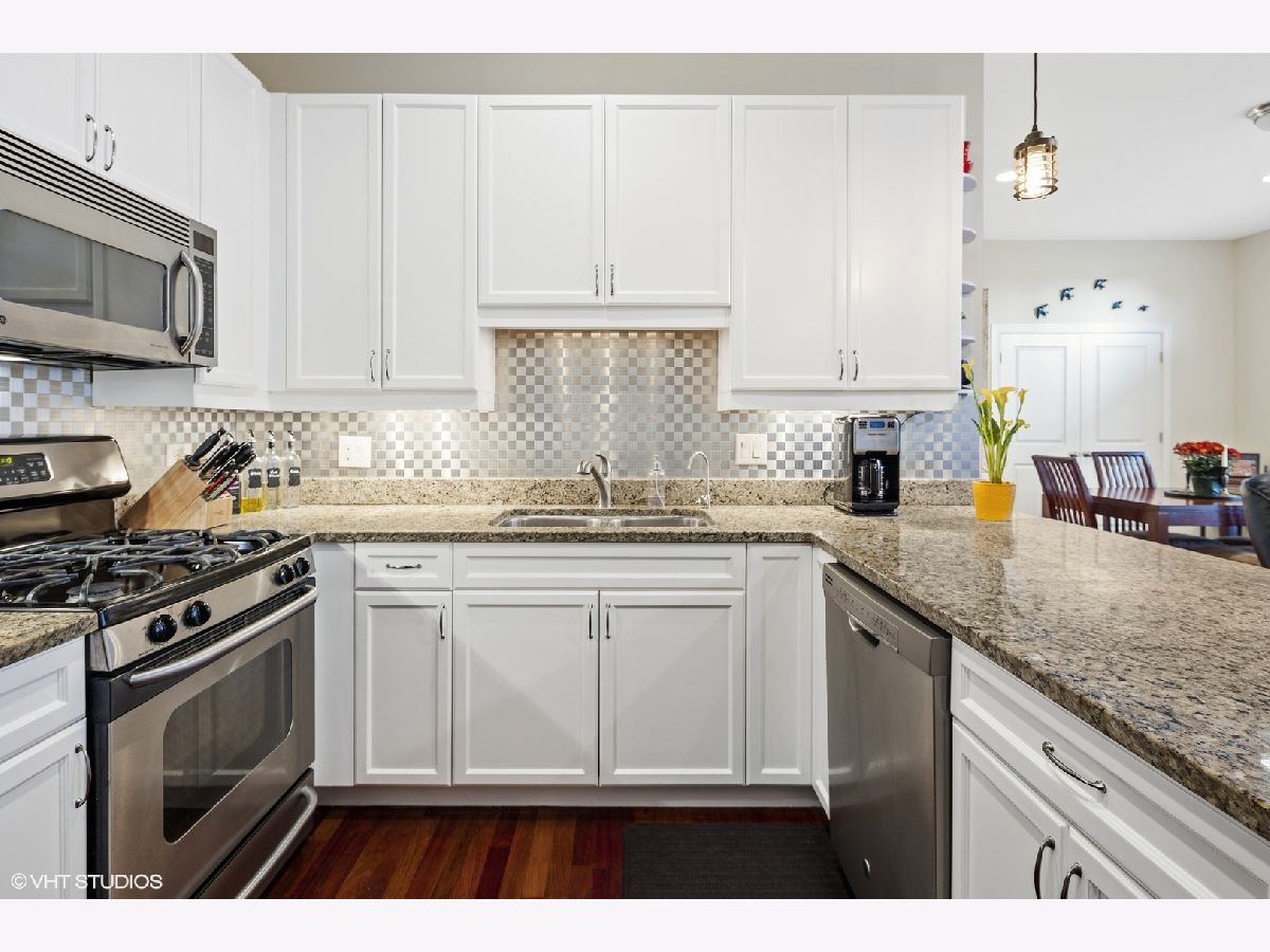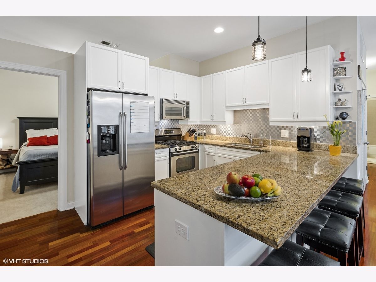 Boasting a sophisticated design, spacious layout, and incredible outdoor space, this 3 Bedroom 2 Bath home is perfectly located in the heart of Lincoln Square/Ravenswood neighborhood. Largest tier in the building, features nearly 10 ft. ceilings and is wired for sound with built-in powered speakers in 4 rooms. The updated kitchen with crisp white cabinetry, granite counter tops, stainless steel appliances, a three-stage water filtration system, stainless backsplash and breakfast bar that seats four, opens to a 23' dining/living room area. Living room opens to 200sqft private stone patio on a lush green roof, ideal for entertaining and perfect to ride out the pandemic!! A large master bedroom suite with walk through closet, full bath with double sink, whirlpool tub and separate shower. 2 additional large bedrooms, one with French doors, which makes perfect work-at-home office, and full bath. Need two offices? No problem: 3rd BR serves as guest room but also has walk in closet converted to little office with shelving. Unit has all other features buyers are seeking: quaint entry foyer, in unit washer/dryer, 2 deeded heated garage parking spaces included in the price (a 50k value) & assigned additional storage. Common rooftop deck has a wonderful skyline view. Beautifully maintained 2 elevator building. Ideal location with CVS on lower level, steps to Metra, Brown Line, parks, Marianos, plus unique shops and all the best restaurants and cafes on North Damen & just minutes to Lincoln Ave A must see!