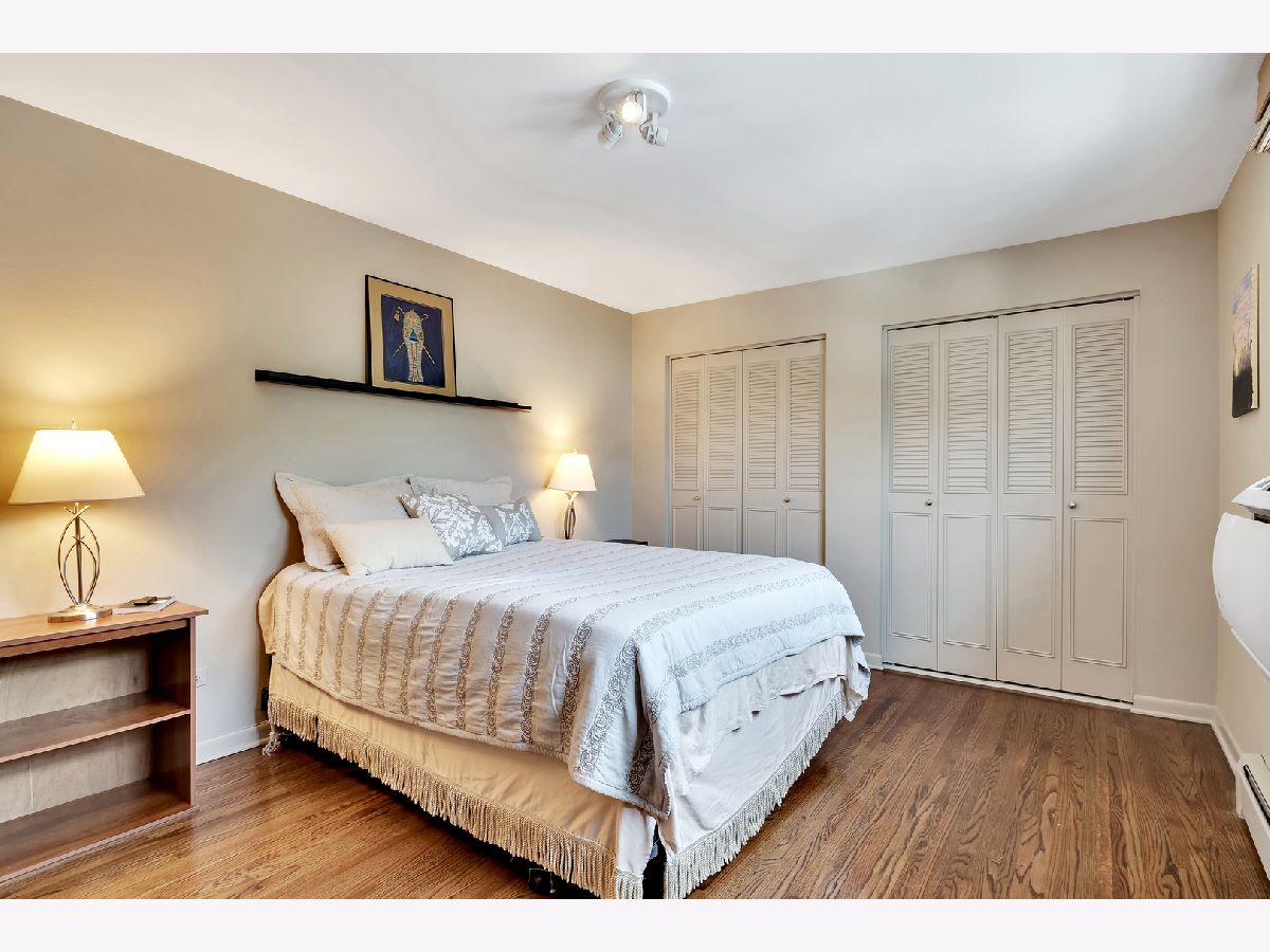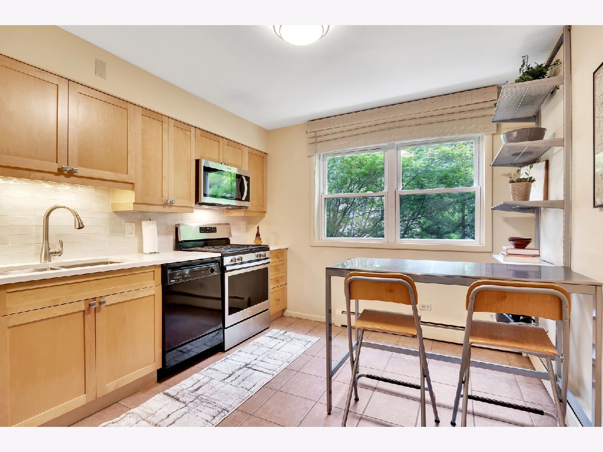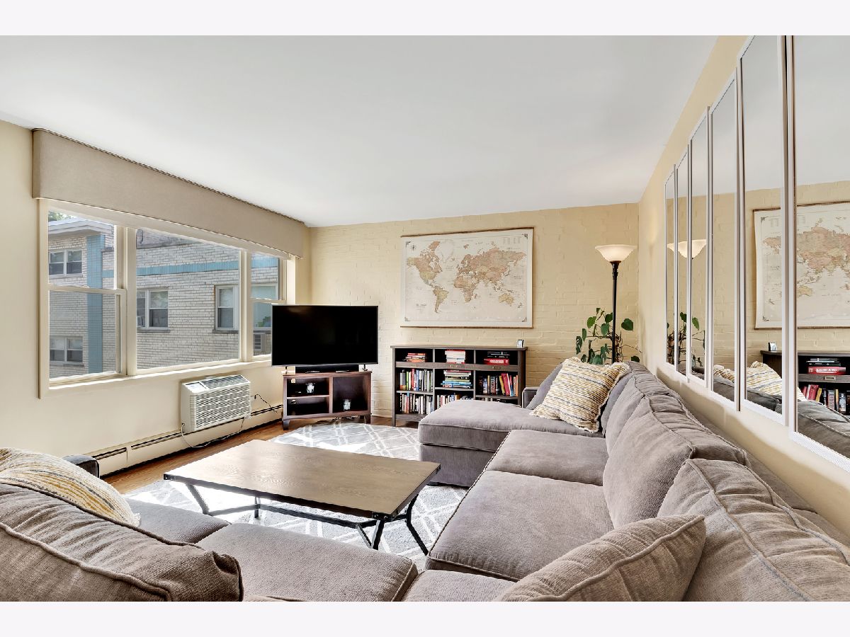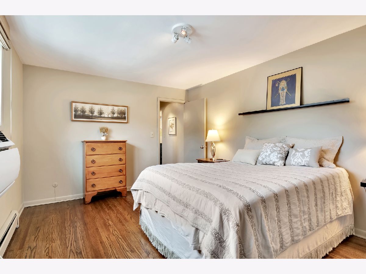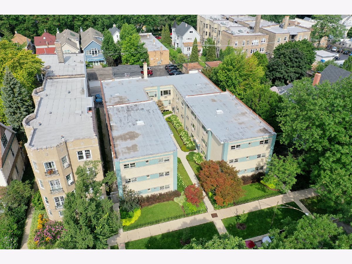 Spacious and sunny 2nd level top floor East Ravenswood two bedroom condo with unobstructed views of beautifully landscaped surroundings. Gleaming hardwood floors throughout Living Room, Dining Room and Bedrooms. Accent brick wall in the Living Room. Large eat-in Kitchen with new quartz counter tops/ back splash tiles and Bathroom with stylish interior finishes. Both Bedrooms possess a full wall of closets with closet organizing systems. Meticulously maintained Mid-Century building. Fantastic location, two blocks to Mariano's, the Ravenswood Metra and LA Fitness. Short walk to all the restaurants and shops that Lincoln Square and Andersonville have to offer. Monthly assessment includes, heat, cooking gas, water. Coin laundry, storage locker and bike space in basement. Easy street parking or on-site space for $50/month. Up to two pets total allowed with no weight limitation.