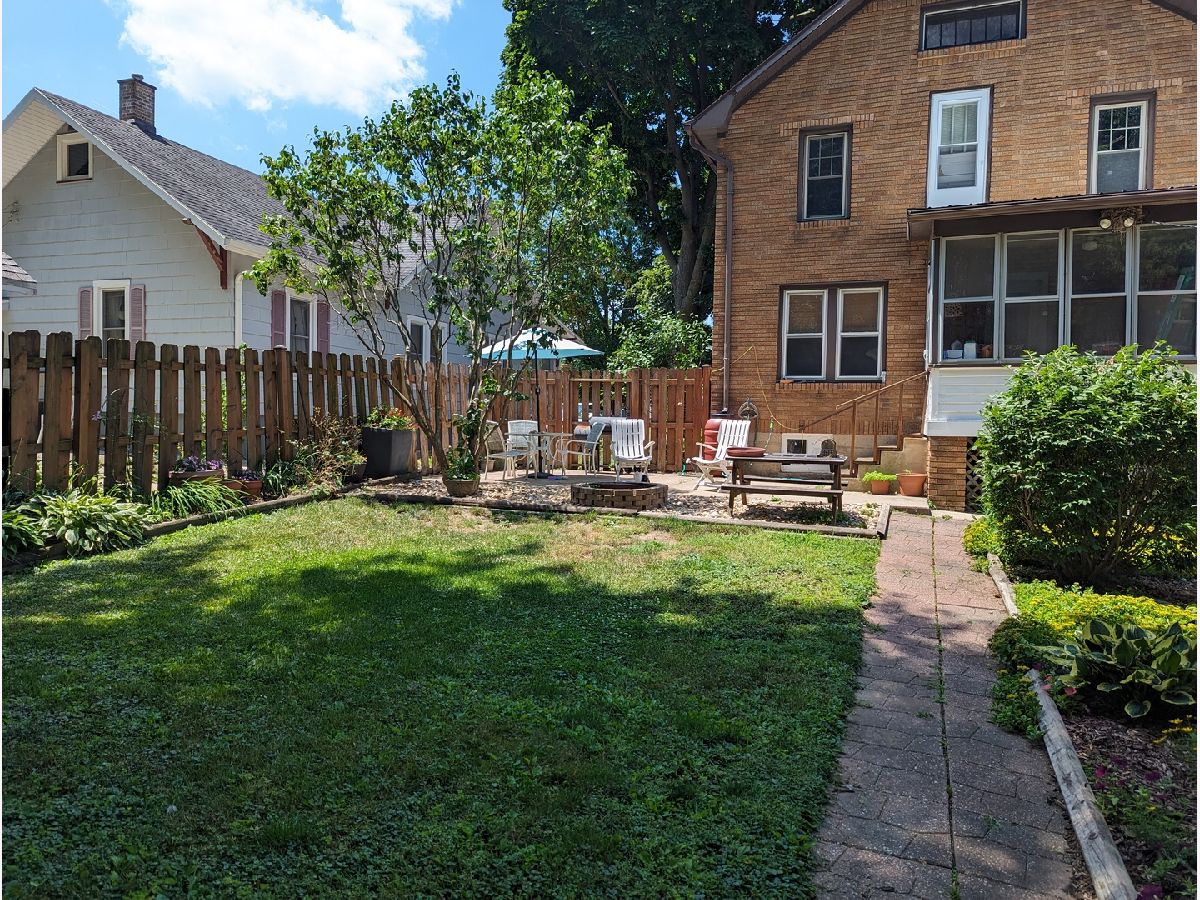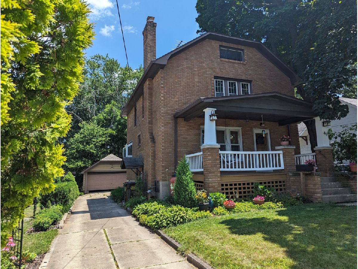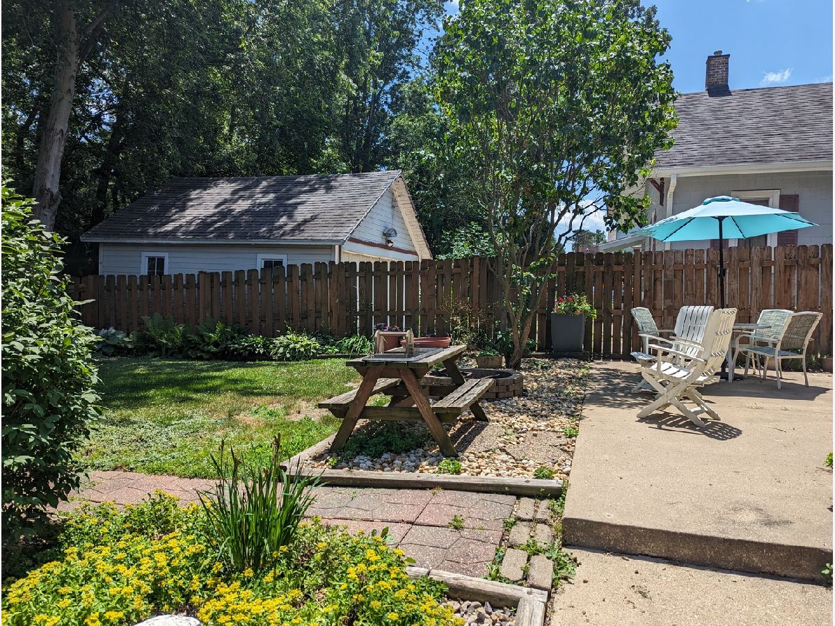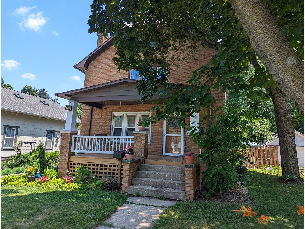 This charming 2-story brick home boasts unique custom built-ins throughout, adding character and warmth to the space. Welcoming front porch, with swing, lead you in to an open living room with wood fireplace, built in desk and bench that opens to dining room. Kitchen features a garden window and back porch offering great views of the yard. Woodwork has been restored to natural beauty. Newer windows on the main floor. Upstairs you will find roomy full bath, walk up attic, and 2 bedrooms. Within the main bedroom is a bonus room that could be a nursery or office. Basement offers large workshop and bonus stool. Fully fenced backyard perfect for gardening and relaxing. 2 car detached garage. Home Warranty Inc included. Freezer and shelves in basement stay. Swing on front porch stays. Patio Furniture included. Water Heater 2023. Water Softener 2021.