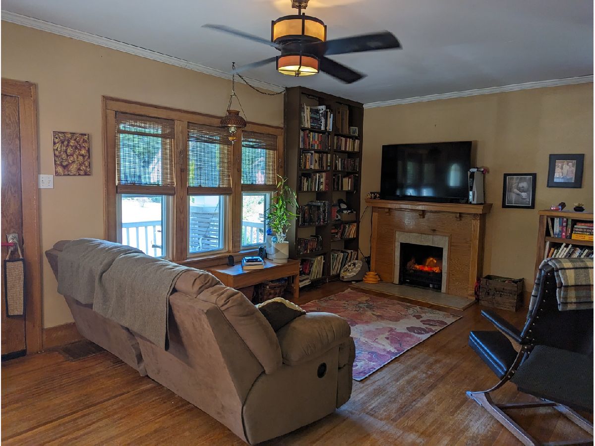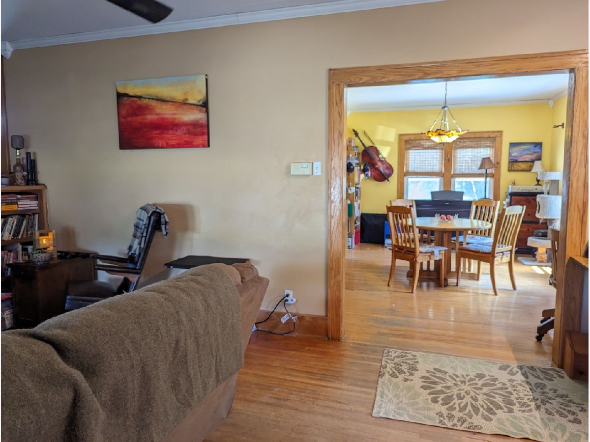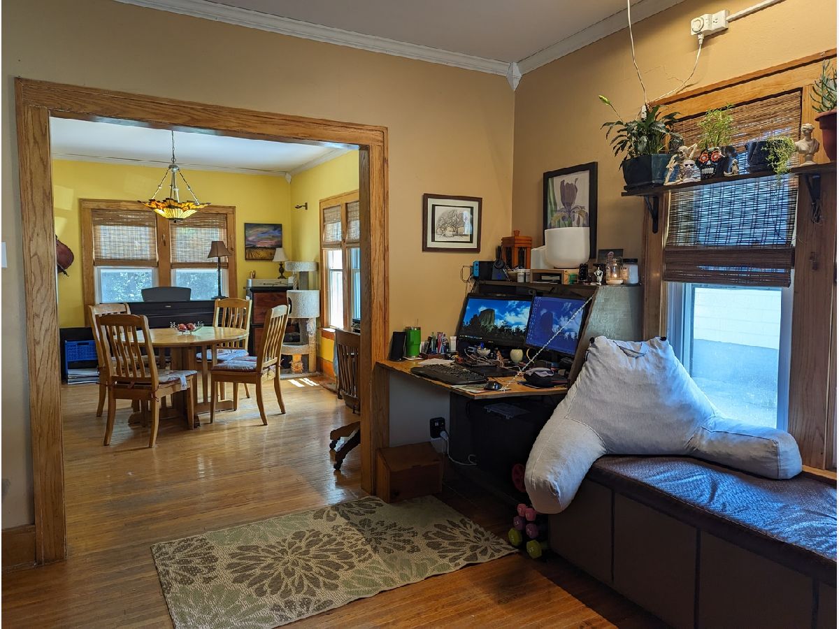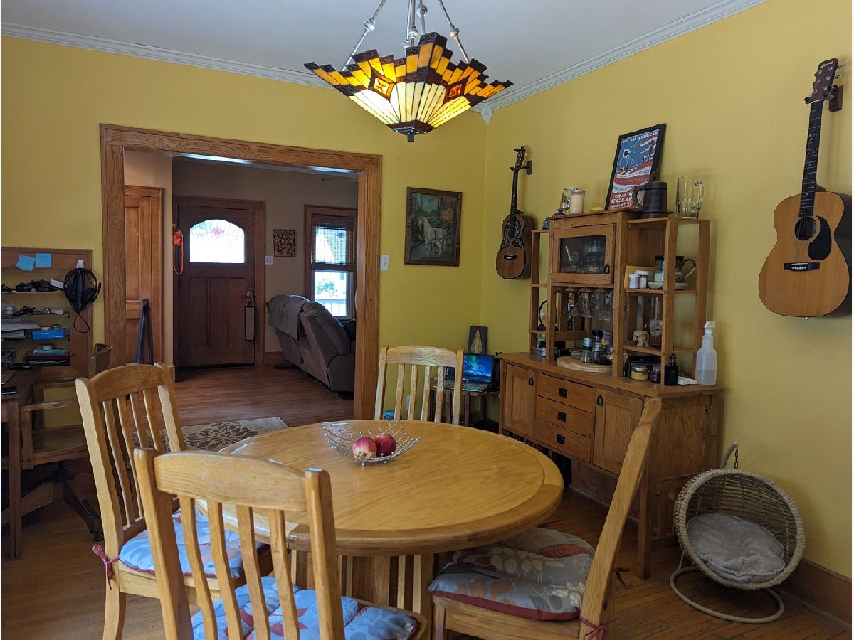 This charming 2-story brick home boasts unique custom built-ins throughout, adding character and warmth to the space. Welcoming front porch, with swing, lead you in to an open living room with wood fireplace, built in desk and bench that opens to dining room. Kitchen features a garden window and back porch offering great views of the yard. Woodwork has been restored to natural beauty. Newer windows on the main floor. Upstairs you will find roomy full bath, walk up attic, and 2 bedrooms. Within the main bedroom is a bonus room that could be a nursery or office. Basement offers large workshop and bonus stool. Fully fenced backyard perfect for gardening and relaxing. 2 car detached garage. Home Warranty Inc included. Freezer and shelves in basement stay. Swing on front porch stays. Patio Furniture included. Water Heater 2023. Water Softener 2021.