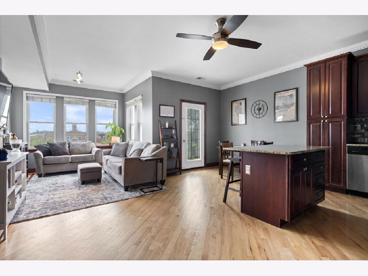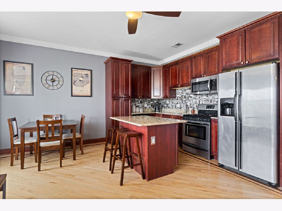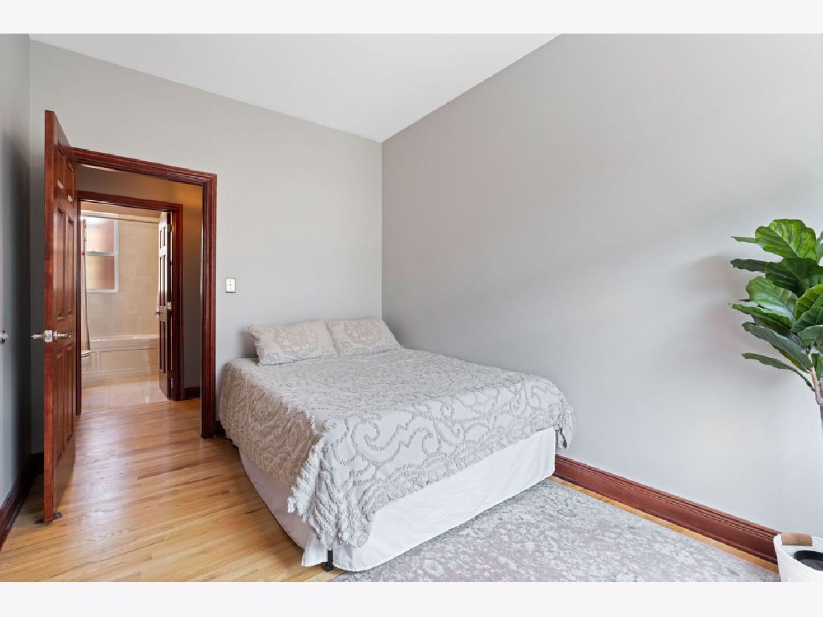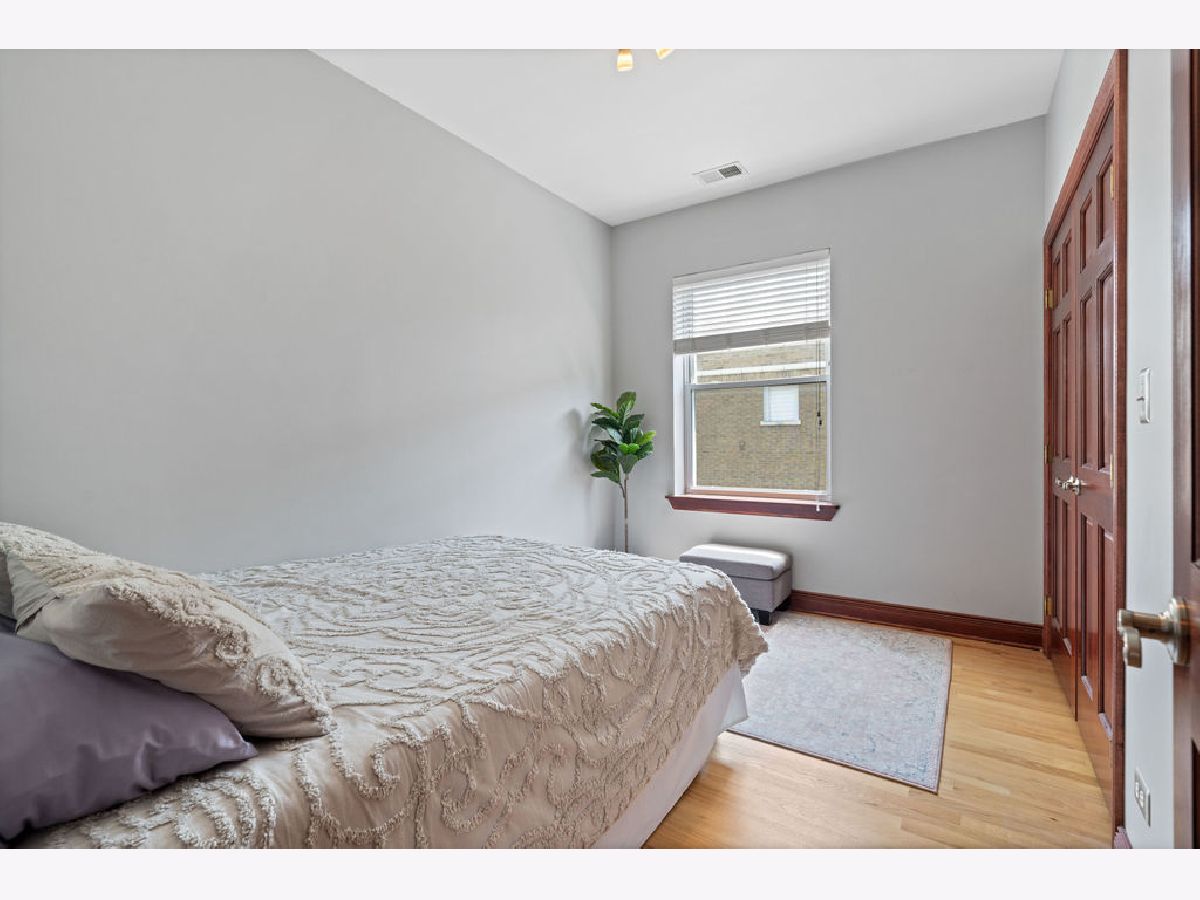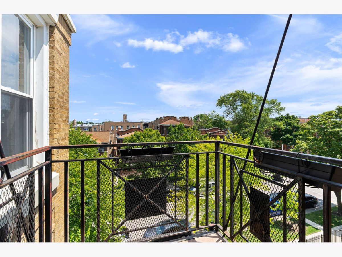 Welcome home to this beautifully maintained top-floor, end-unit in a charming classic Chicago courtyard building, just steps from the Brown Line Kimball station. This exquisite unit features diagonal oak flooring with elegant cherry inlays, refinished in 2015, complemented by solid core doors throughout and classic dentil molding. As you enter, you'll be greeted by an open kitchen that's perfect for entertaining, boasting granite countertops, 42" cherry cabinets, a large eat-at island, tile backsplash, and stainless-steel appliances. Natural light floods the space, leading to a sun-filled balcony (rebuilt in 2019), ideal for morning coffee or evening relaxation. The luxurious marble bath features a soothing jacuzzi tub, making it a perfect retreat. This unit has seen recent mechanical improvements, including a tankless water heater (2018), furnace (2017), and AC (2023) with a Nest thermostat, along with an in-unit washer/dryer for added ease and convenience. Storage won't be an issue here, with abundant closet space with organizers and a large walk-in storage room. Enjoy building amenities that include a bike room, wiring for high-speed gigabit internet, and security cameras. As if this home doesn't have enough to offer, you are located on a one-way street, conveniently near to Northeastern Illinois University, North Park University, and several picturesque parks along the North Branch. Don't miss your chance to own this stunning home!