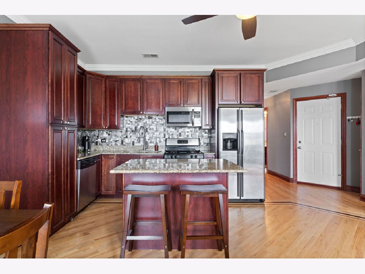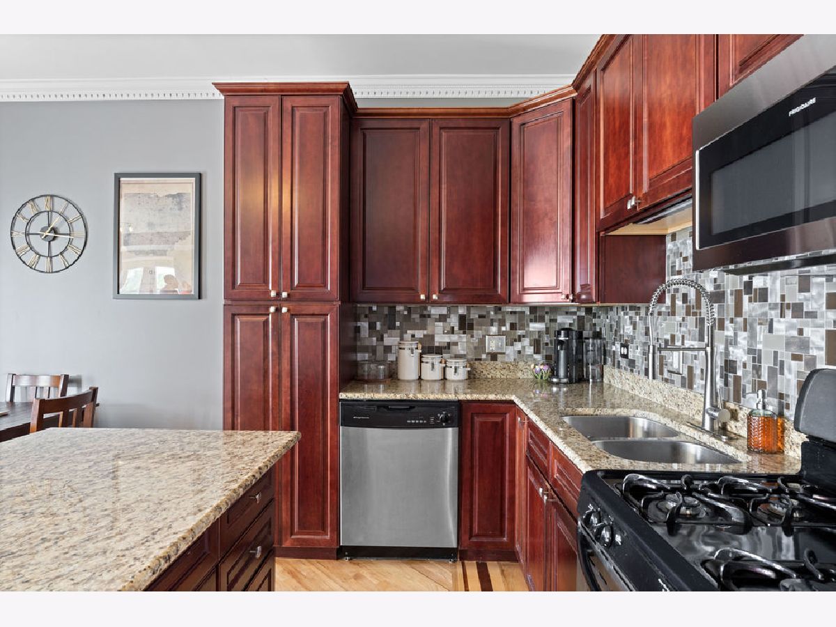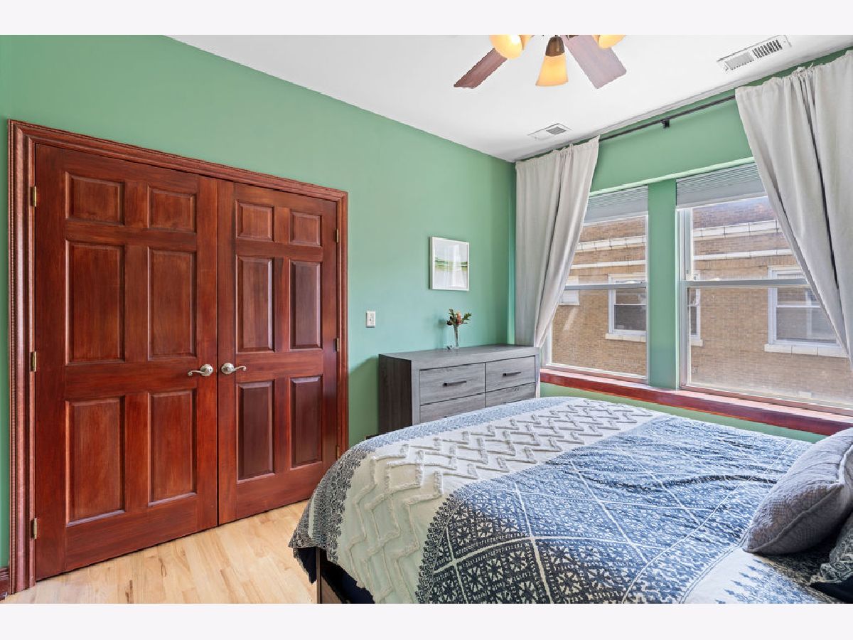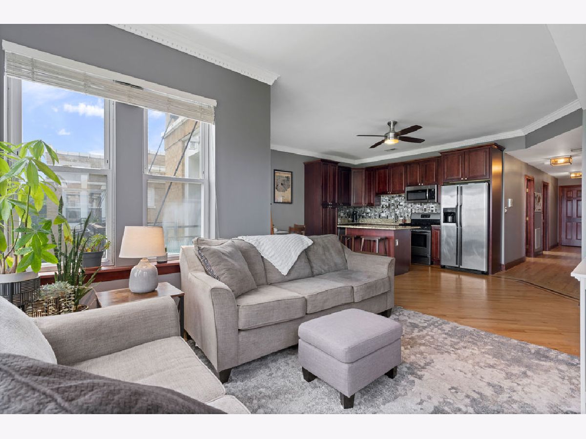 Welcome home to this beautifully maintained top-floor, end-unit in a charming classic Chicago courtyard building, just steps from the Brown Line Kimball station. This exquisite unit features diagonal oak flooring with elegant cherry inlays, refinished in 2015, complemented by solid core doors throughout and classic dentil molding. As you enter, you'll be greeted by an open kitchen that's perfect for entertaining, boasting granite countertops, 42" cherry cabinets, a large eat-at island, tile backsplash, and stainless-steel appliances. Natural light floods the space, leading to a sun-filled balcony (rebuilt in 2019), ideal for morning coffee or evening relaxation. The luxurious marble bath features a soothing jacuzzi tub, making it a perfect retreat. This unit has seen recent mechanical improvements, including a tankless water heater (2018), furnace (2017), and AC (2023) with a Nest thermostat, along with an in-unit washer/dryer for added ease and convenience. Storage won't be an issue here, with abundant closet space with organizers and a large walk-in storage room. Enjoy building amenities that include a bike room, wiring for high-speed gigabit internet, and security cameras. As if this home doesn't have enough to offer, you are located on a one-way street, conveniently near to Northeastern Illinois University, North Park University, and several picturesque parks along the North Branch. Don't miss your chance to own this stunning home!