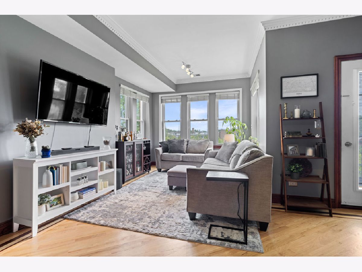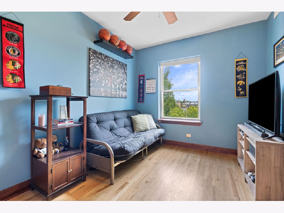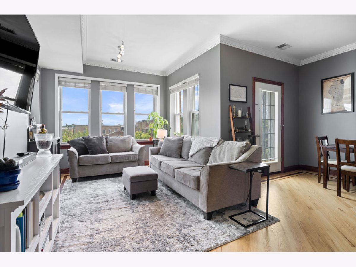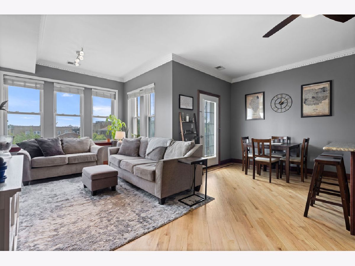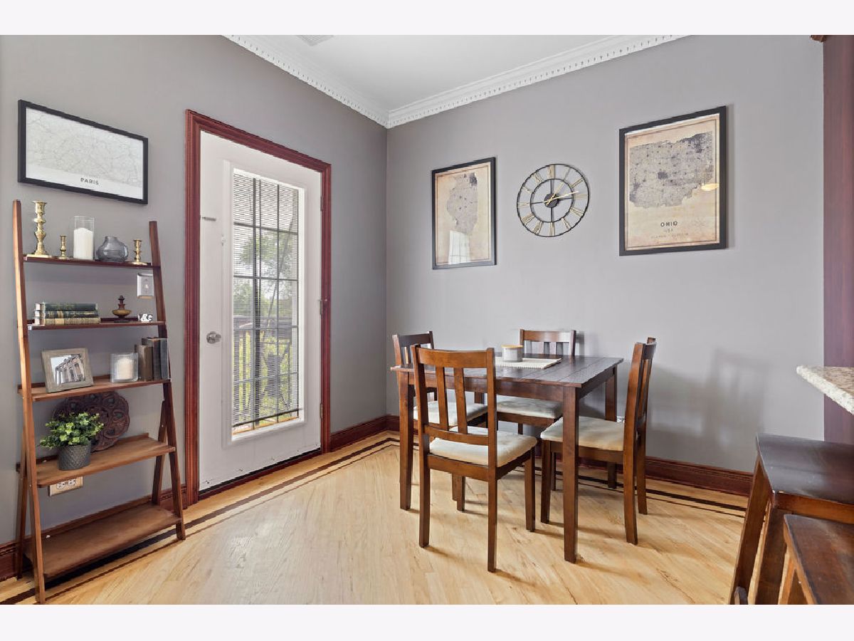 Welcome home to this beautifully maintained top-floor, end-unit in a charming classic Chicago courtyard building, just steps from the Brown Line Kimball station. This exquisite unit features diagonal oak flooring with elegant cherry inlays, refinished in 2015, complemented by solid core doors throughout and classic dentil molding. As you enter, you'll be greeted by an open kitchen that's perfect for entertaining, boasting granite countertops, 42" cherry cabinets, a large eat-at island, tile backsplash, and stainless-steel appliances. Natural light floods the space, leading to a sun-filled balcony (rebuilt in 2019), ideal for morning coffee or evening relaxation. The luxurious marble bath features a soothing jacuzzi tub, making it a perfect retreat. This unit has seen recent mechanical improvements, including a tankless water heater (2018), furnace (2017), and AC (2023) with a Nest thermostat, along with an in-unit washer/dryer for added ease and convenience. Storage won't be an issue here, with abundant closet space with organizers and a large walk-in storage room. Enjoy building amenities that include a bike room, wiring for high-speed gigabit internet, and security cameras. As if this home doesn't have enough to offer, you are located on a one-way street, conveniently near to Northeastern Illinois University, North Park University, and several picturesque parks along the North Branch. Don't miss your chance to own this stunning home!