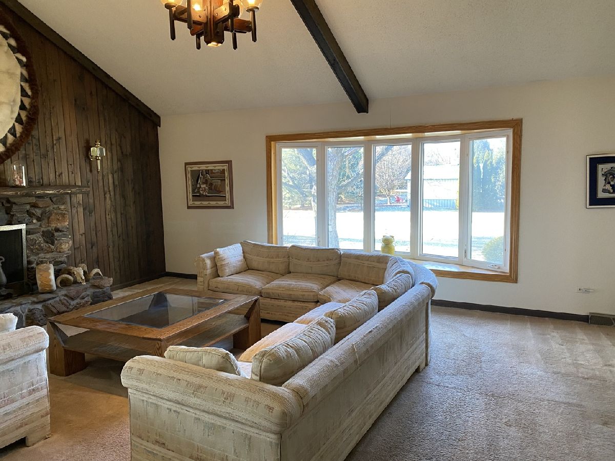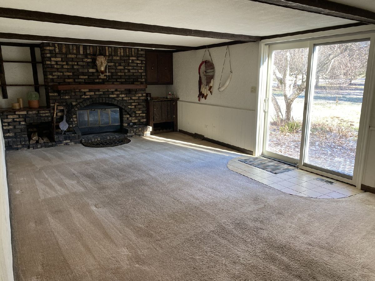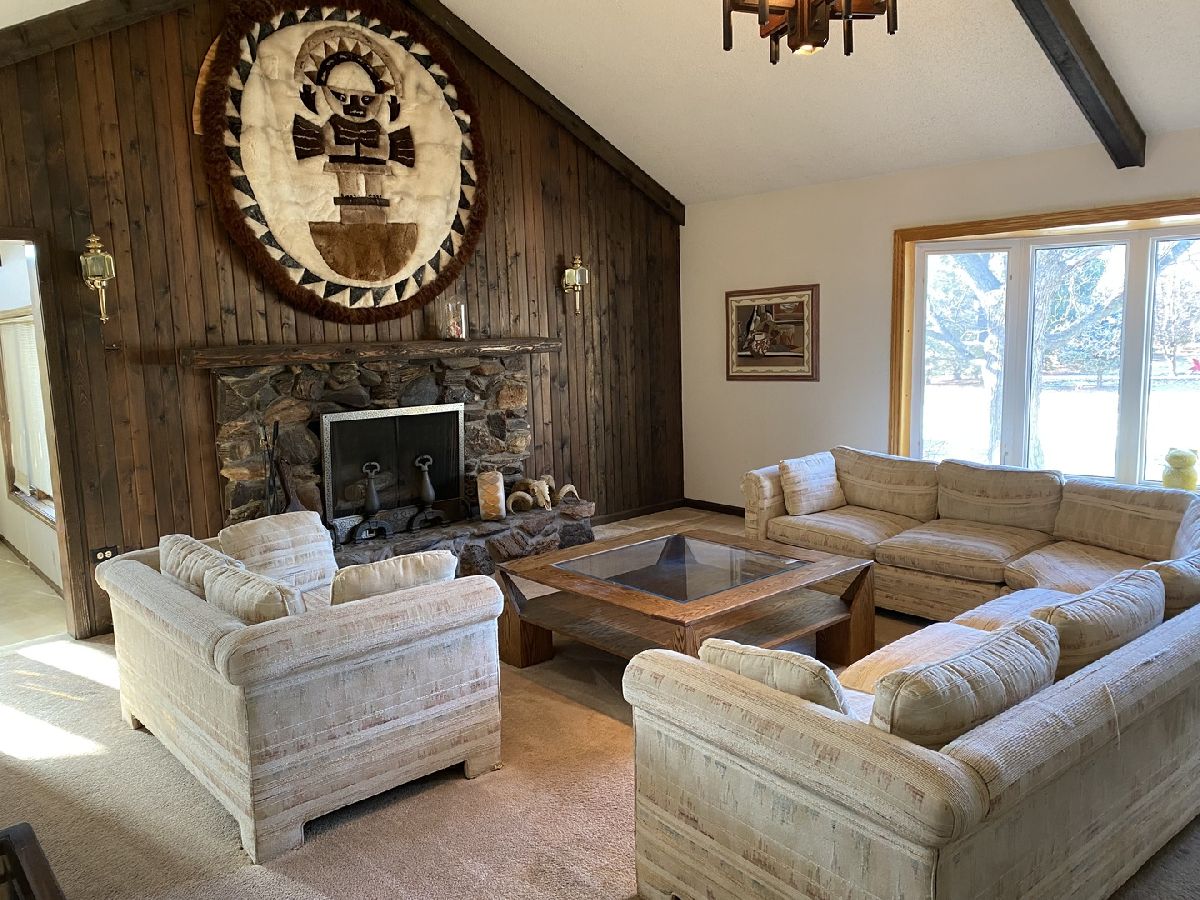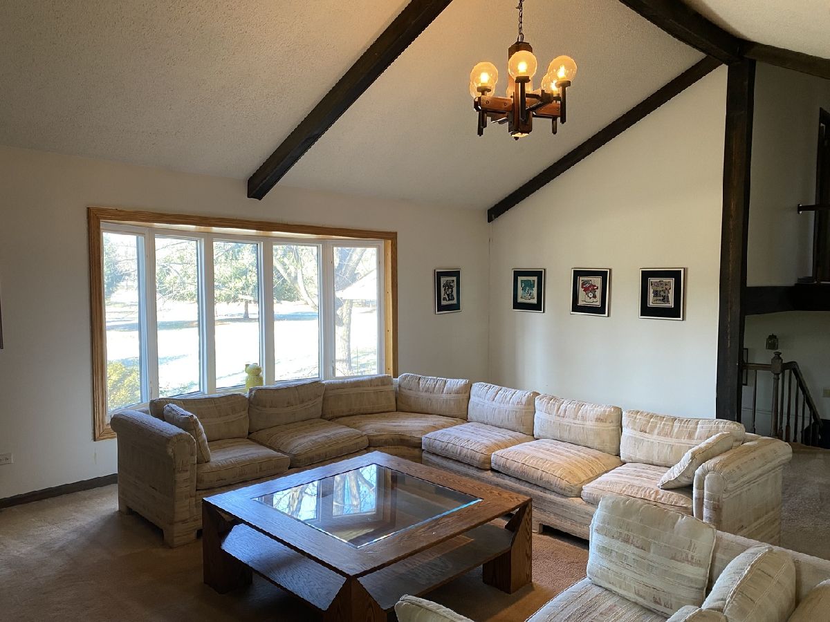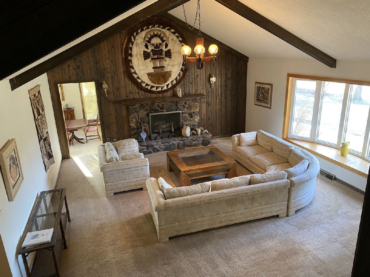 Nestled in a serene, private country setting, this multi-level home offers the perfect blend of tranquility and convenience with access to St. Charles schools. Situated on a spacious 1-acre corner lot adorned with mature trees, this property boasts unique features and endless possibilities. 4 bedrooms and 2.5 baths. Living room with fireplace, with stunning beamed, vaulted ceilings and a large bowed window that floods the space with natural light. Sunken dinning room with beamed vaulted ceiling and sliding glass door to deck. Kitchen with pantry closet and desk area opens to sunken den with pine tongue and grove walls, vaulted beamed ceiling and built in counter top, shelves and cabinet space. Family room with masonry fireplace with wood storage, shelves, cabinet and built ins. Sliding glass door to patio. Two cozy fireplaces to enjoy during cooler months. A basement perfect for storage and/or workshop. A layout with potential for customization to fit your family's needs. This home needs remodeling and TLC but has incredible potential to become your dream home. With its spacious lot, charming features, and great location, it's perfect for creating lifelong memories. Living room and dining room furniture included.