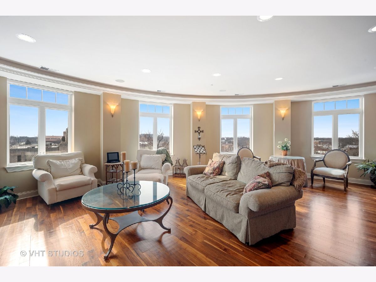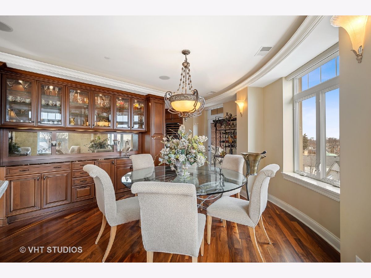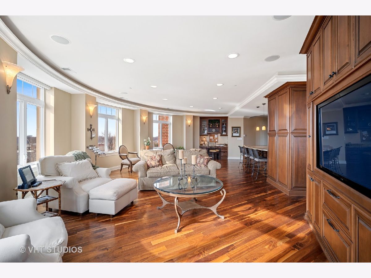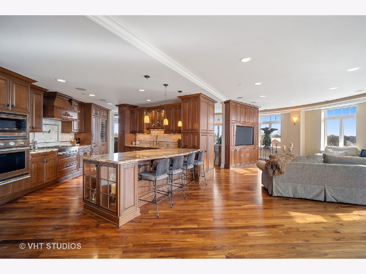 Luxury 4th floor penthouse at the Uptown Residences of Park Ridge. Amazing views of Uptown Park Ridge and the Chicago skyline. Custom kitchen with granite counters, Wolf & Subzero appliances, overlooking the expansive living room perfect for entertaining. Wrap around windows fill the space with natural light. Separate dining room with wet bar. A beautiful wood paneled study featuring a fireplace, built-ins and coffered ceiling. Master suite with 2 walk-in closets and a spa like master bath. The second bedroom also features an en-suite bath. Large laundry room with additional storage. Private balcony, custom electronic window treatments, built-in speakers throughout the condo, central vac, and 2 heated indoor garage parking spaces.