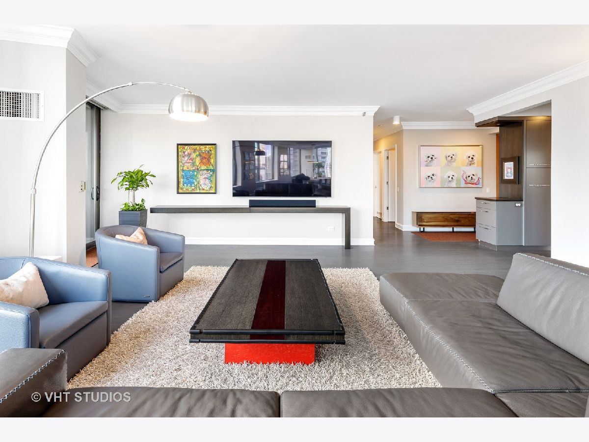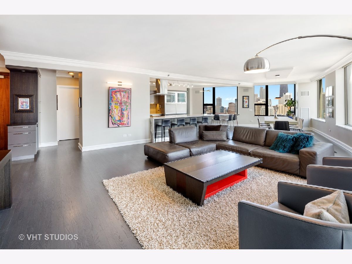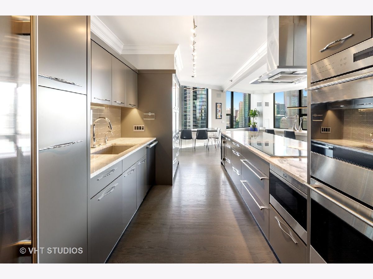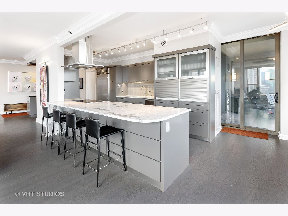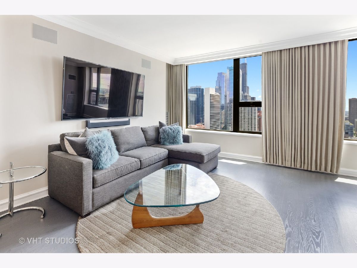 Amazing gut-rehab of the best floor plan at 501 North Clinton!! Welcome to unit 3003. This sprawling three-bedroom three-bath unit will simply take your breath away as it's totally unobstructed views east and south capture the majesty of Chicago from sunrise to sunset. Enter and be welcomed by a mind-blowing 43-foot-long wall of windows and equally long room encompassing a huge great room and dining room ~ perfect for entertaining. This total renovation includes oak hardwood flooring throughout, 7 inch two-stage crown molding, custom window treatments with Lutron automation and Control 4 home automation. The kitchen has been opened-up allowing for a seamless connection it to the entire living room and dining room area. Kitchen features Woodface brand custom cabinets Wolfe, Miele and Subzero appliances, stone counters, extensive custom cabinetry with multiple appliance garages and an array custom lighting. A custom-made table has been fabricated to create an awesome window-side eat-in area... that perfectly frames the John Hancock in your view. Retire to the main suite and again you will be amazed! This 23-foot-long room features a formal lounge area with plenty of room for couch and coffee table; also includes TV and in-wall speakers, custom blinds and enormous his and her closets with custom built-ins. The lavish main bath awaits you with Woodface custom cabinetry, 12" x 24" porcelain flooring and tub/shower surrounds, a jet bath tub with custom designed tub deck, and natural stone countertops with vessel sinks. The second bedroom features custom closets, mounted TV, and sliding door direct access to an east-facing deck. Its en-suite bathroom includes porcelain tile flooring and shower surround, custom cabinetry and natural stone countertops. Bedroom three features phenomenal southern views and custom-made furniture outfitting it perfectly as an office or bedroom. Other features of this home include custom lighting for featured wall art, solar blinds, black out blinds and draperies (in select rooms), generous entry closet and storage, linen closet, laundry room with high-end Maytag side-by-side washer and dryer. Round it all out with one-car garage parking (second space additional $40,000) and rarely available second storage room ($15,000). [Of note, the parking and storage units are all on the same level and just steps from each other] The Kinzie Park community offers 24 hour security gate and door staff, free guest parking, oversized pool deck, fully equipped fitness center, hospitality room, bike storage, dry cleaners, on-site management/maintenance, picturesque tree-lined grounds, private dog park, and access to the Riverwalk. In addition, this home is located steps to the hottest restaurants in town along famed Fulton and Randolph street, East Bank Club, 6-minute walk to the Loop, and easy access to all highways! This is quite possibly the perfect River North condo.