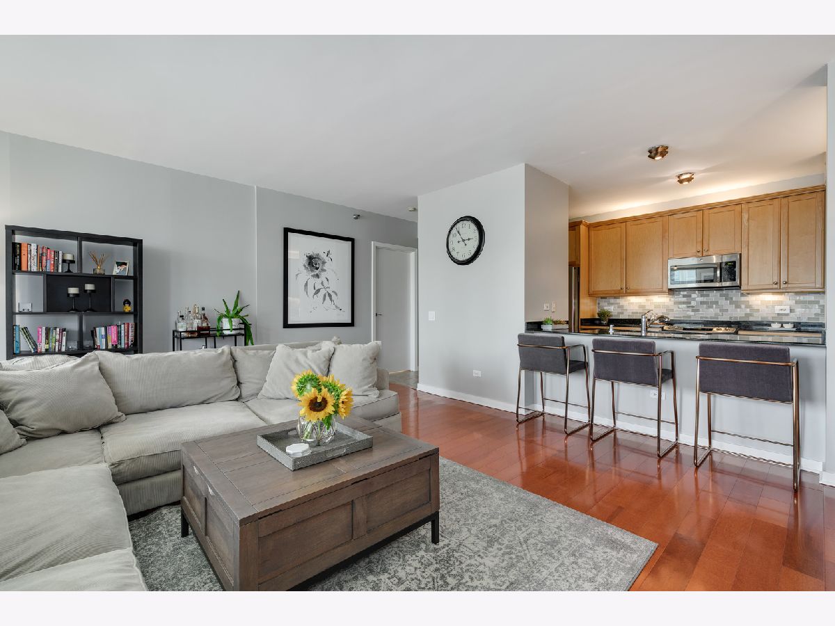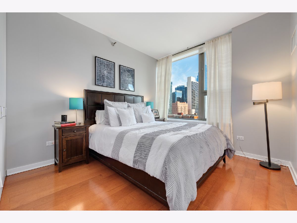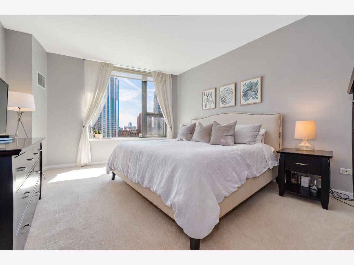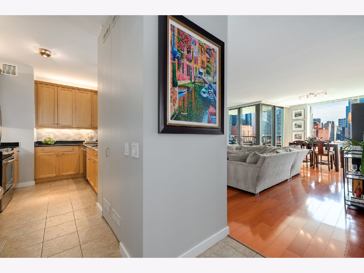 Southern skyline views from floor to ceiling windows allow for an abundance of natural light in this beautifully renovated 2 bedroom home in gated Kinzie Park Tower. The kitchen has been opened up, allowing for a seamless connection to the bright and open living and dining rooms with gorgeous hardwood floors. The kitchen features newer stainless steel appliances, abundant storage, and bar seating. A desired southern facing balcony off the living/dining area is perfect for grilling and al fresco dining while taking in the stunning views of the Loop and city skyline. The primary bedroom features a walk-in closet and remodeled ensuite bath with new double vanity. The graciously sized second bedroom also boasts southern exposure, and the second full bathroom has also been remodeled, including a new vanity. Additional improvements include a new washer/dryer, wallpaper in the entryway, and fresh paint. 1 storage unit is included (on the same level as garage and just steps from each other.) The Kinzie Park community offers 24 hour security gate and door staff, free guest parking, oversized pool deck, fully equipped fitness center, hospitality room, bike storage, dry cleaners, on-site management/maintenance, picturesque tree-lined grounds, private dog park, and access to the Riverwalk. In addition, this home is located steps to the hottest restaurants in town along famed Fulton and Randolph street, East Bank Club, 6-minute walk to the Loop, and easy access to all highways! 1 garage space available for additional $35K. ***Enter at 400 N Clinton to check in at security gate house and obtain a free guest parking pass.