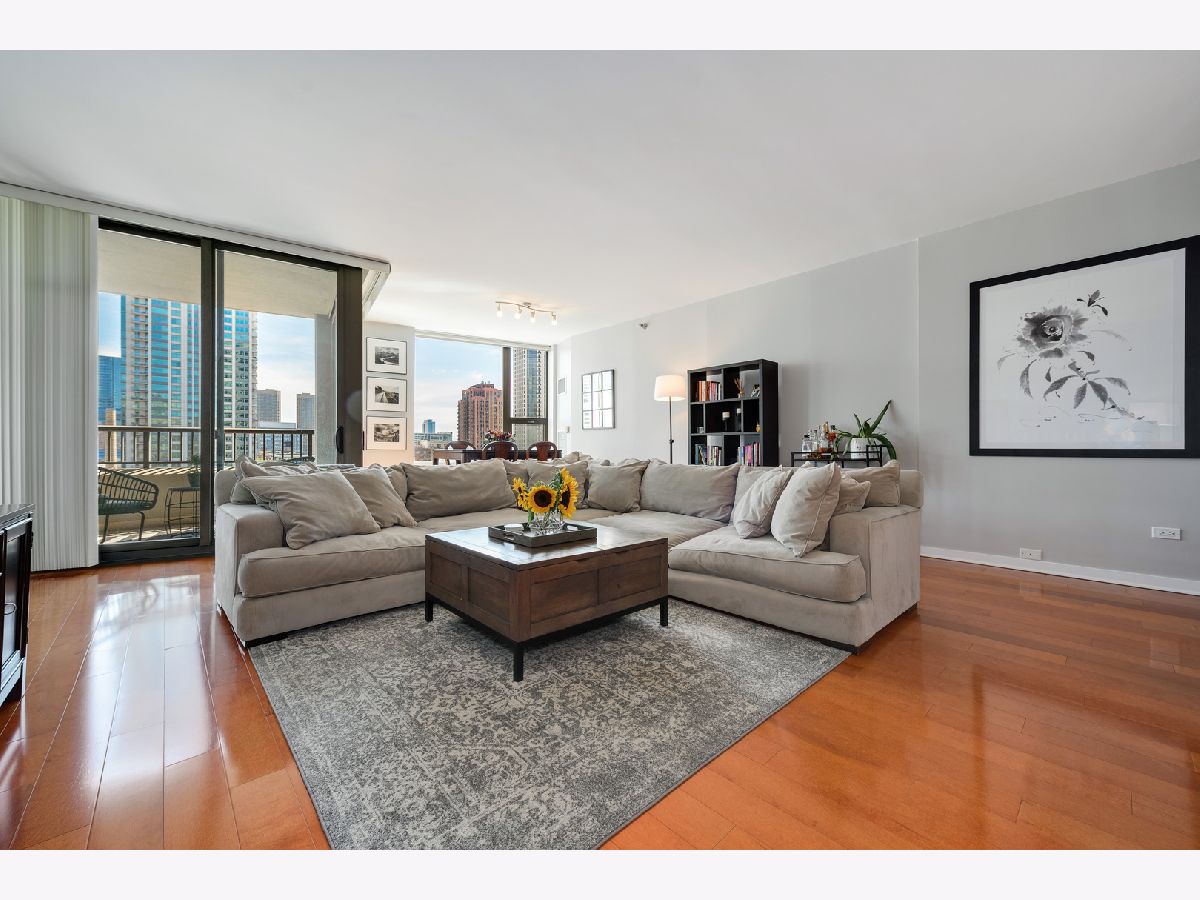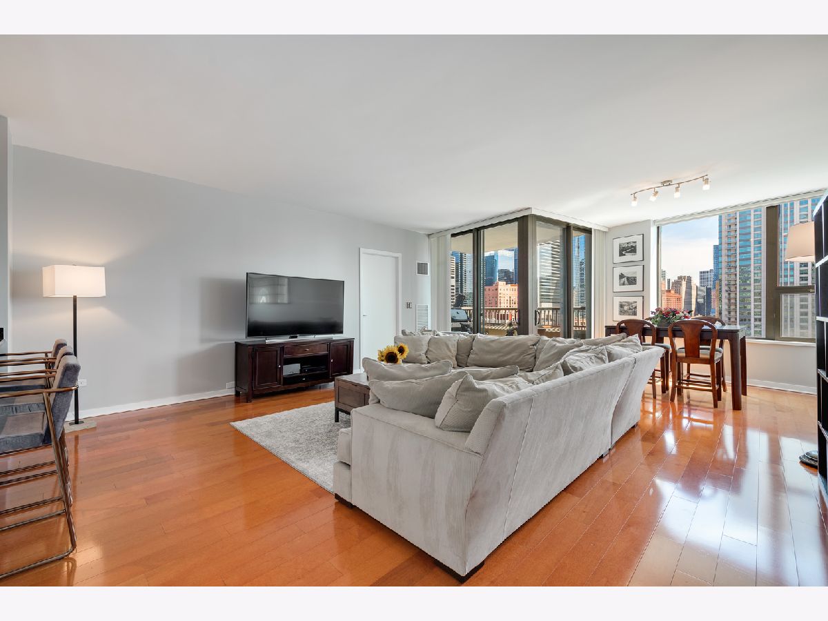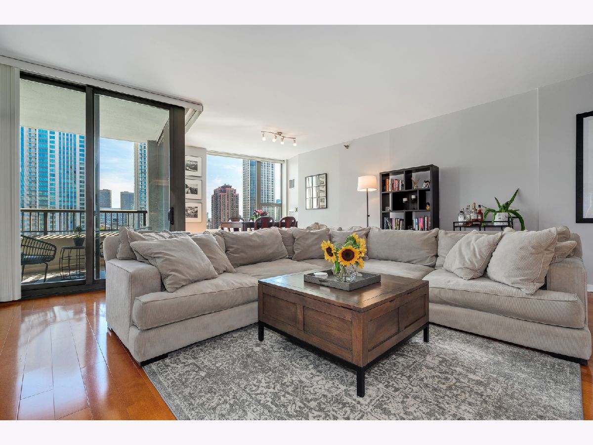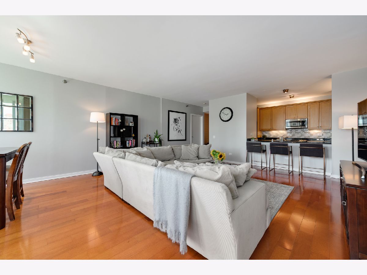 Southern skyline views from floor to ceiling windows allow for an abundance of natural light in this beautifully renovated 2 bedroom home in gated Kinzie Park Tower. The kitchen has been opened up, allowing for a seamless connection to the bright and open living and dining rooms with gorgeous hardwood floors. The kitchen features newer stainless steel appliances, abundant storage, and bar seating. A desired southern facing balcony off the living/dining area is perfect for grilling and al fresco dining while taking in the stunning views of the Loop and city skyline. The primary bedroom features a walk-in closet and remodeled ensuite bath with new double vanity. The graciously sized second bedroom also boasts southern exposure, and the second full bathroom has also been remodeled, including a new vanity. Additional improvements include a new washer/dryer, wallpaper in the entryway, and fresh paint. 1 storage unit is included (on the same level as garage and just steps from each other.) The Kinzie Park community offers 24 hour security gate and door staff, free guest parking, oversized pool deck, fully equipped fitness center, hospitality room, bike storage, dry cleaners, on-site management/maintenance, picturesque tree-lined grounds, private dog park, and access to the Riverwalk. In addition, this home is located steps to the hottest restaurants in town along famed Fulton and Randolph street, East Bank Club, 6-minute walk to the Loop, and easy access to all highways! 1 garage space available for additional $35K. ***Enter at 400 N Clinton to check in at security gate house and obtain a free guest parking pass.