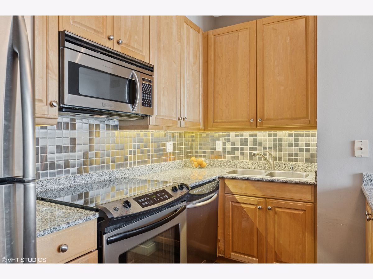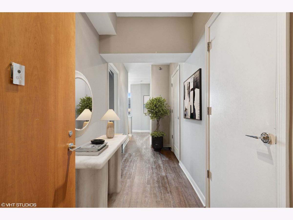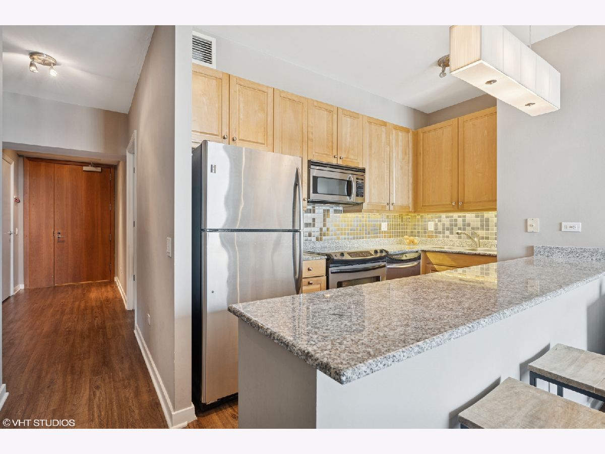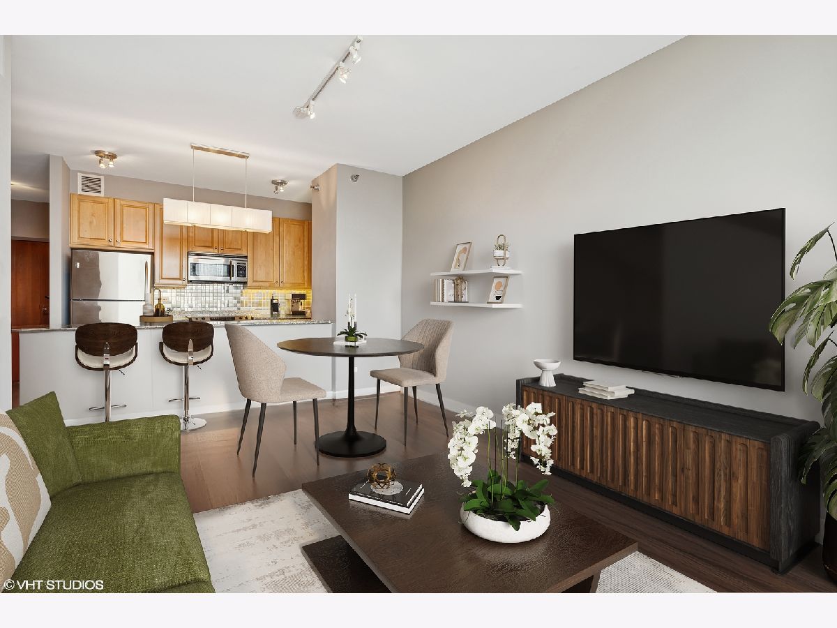 Welcome to this beautifully updated 1-bedroom home in the highly sought-after Kinzie Park Tower gated community, offering river views and an unbeatable location. Featuring newer luxury vinyl flooring throughout, you'll be greeted by a spacious foyer with ample hall storage, providing a warm and inviting first impression. The kitchen boasts 42 inch cabinetry, granite countertops, stainless steel appliances, and a large peninsula with a breakfast bar. The expansive living room boasts northeast views of the river, filling the space with natural light, and has ample room for a dining space. The bedroom is a generous soft loft space, with a massive walk-in closet, custom built out for optimal organization and storage. Step outside to your private balcony-ideal for grilling and enjoying the outdoors. In-unit laundry room with additional storage included. Kinzie Tower is a premier luxury building with unrivaled amenities including fitness center, outdoor pool and sundeck with grills, dry cleaners, 24 hr door staff, private river access, free guest parking and a lovely social room for hosting. Just steps from the Blue line, Jewel Osco, East Bank Club, restaurants and shopping in both River West and West Loop, the location can't be beat! Full size storage locker is included and a heated garage parking space available for 30k.