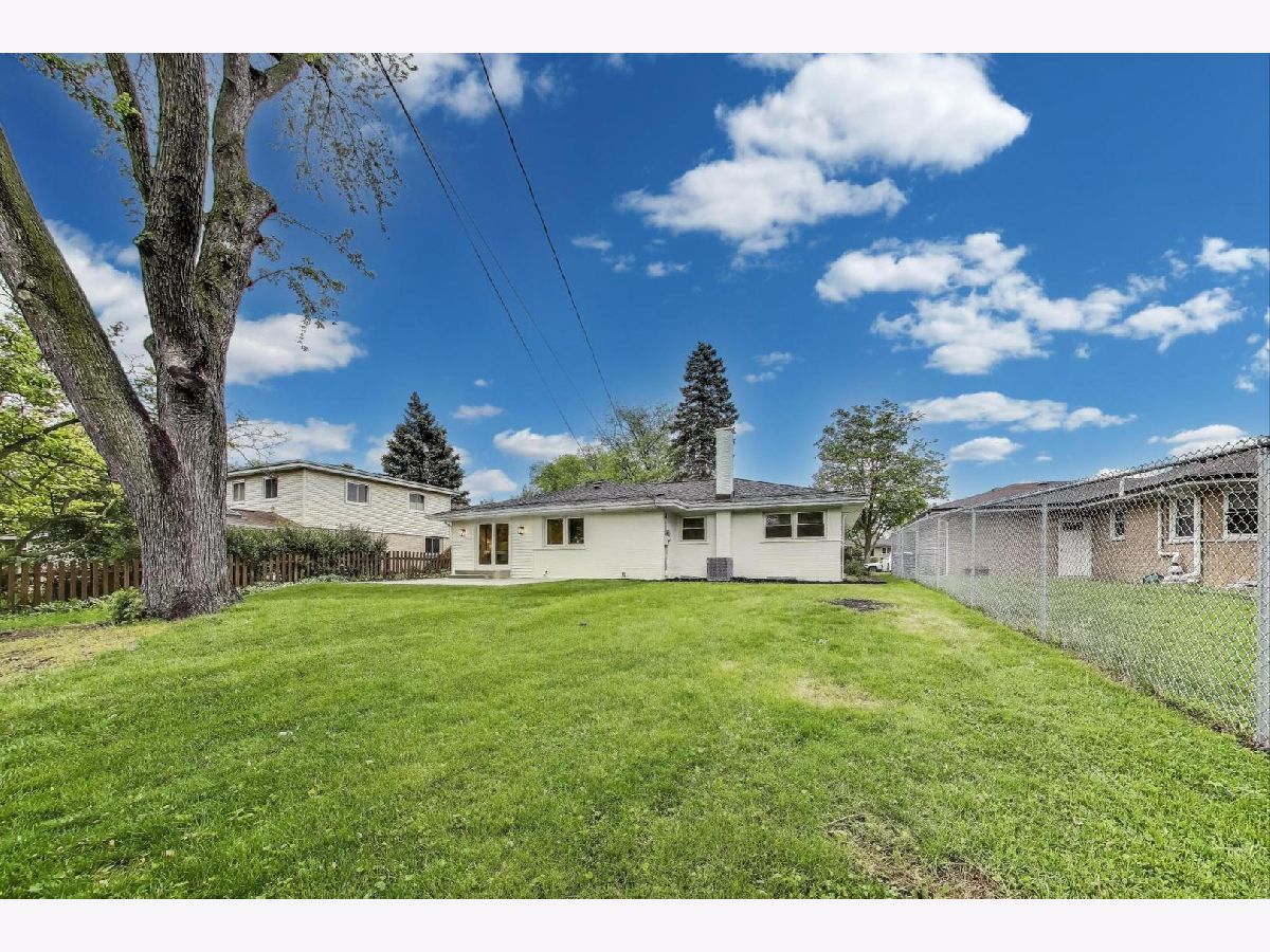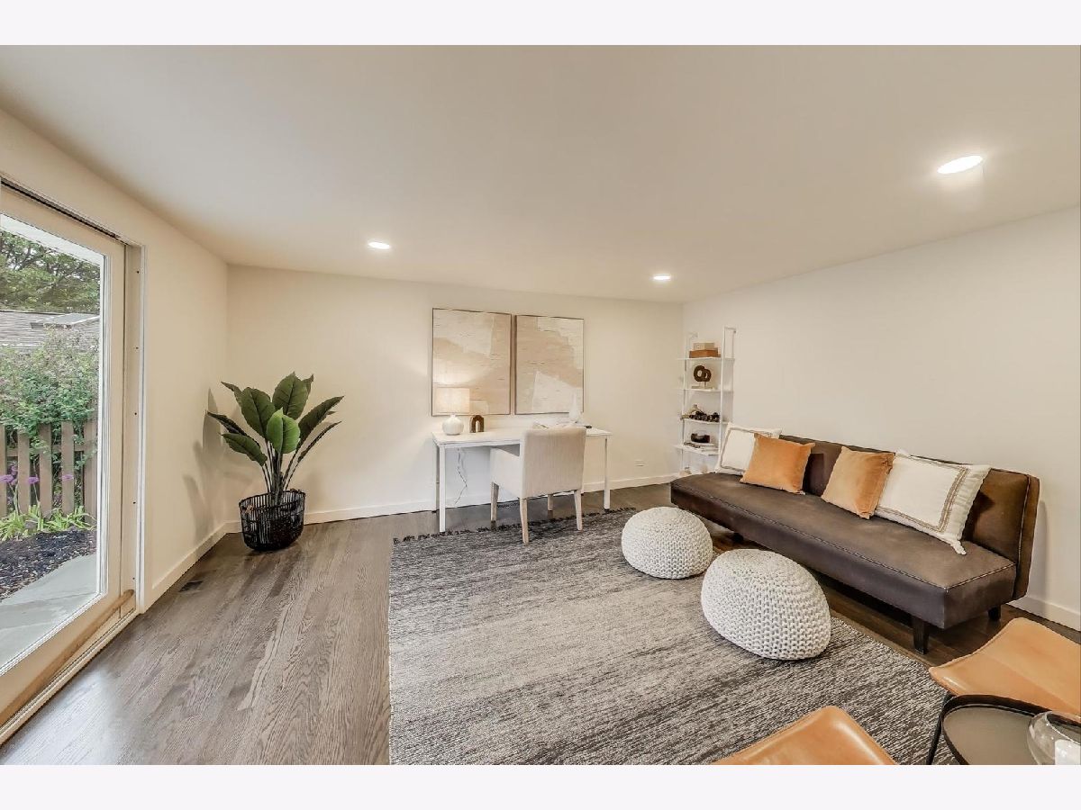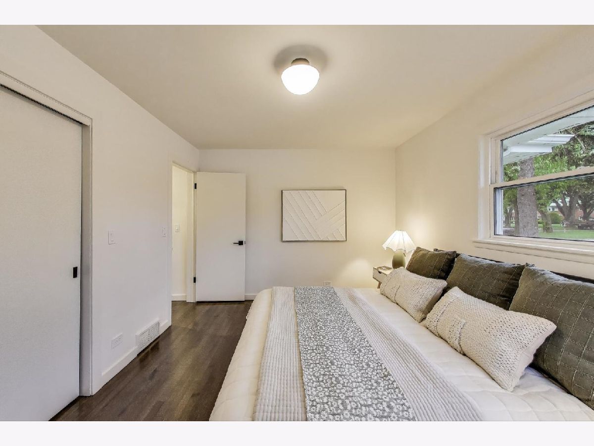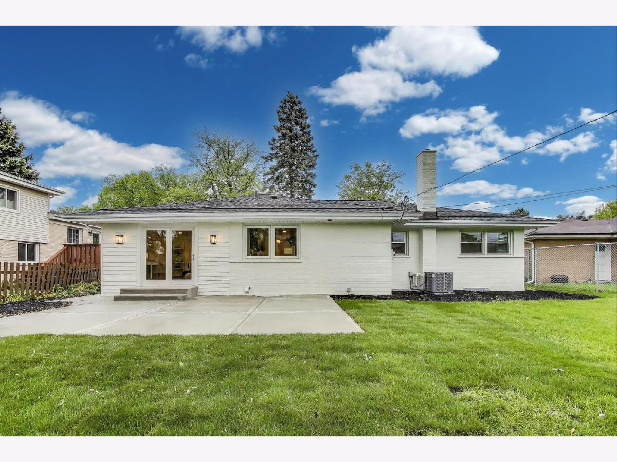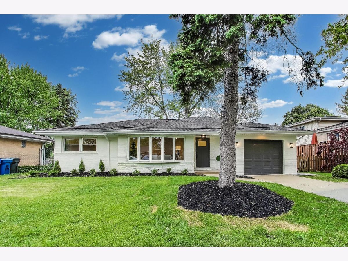 Welcome to this fully renovated and stylish 4-bedroom, 1.1-bathroom brick ranch, ideally located in one of Mount Prospect's most desirable neighborhoods. Situated within the top-rated District 57 school system and just steps from the soon-to-be revitalized Lions Park (2025-2027), this home offers both modern elegance and unbeatable convenience. Step inside to discover a bright and spacious open-concept living and dining area-perfect for entertaining. Rich walnut-stained hardwood floors span the main level and stairway to the lower level, complemented by fresh custom paint by Benjamin Moore throughout. The stunning kitchen features 42" shaker-style cabinets with abundant storage, a pantry, honed soapstone countertops, and premium KitchenAid Professional Series stainless steel appliances. A 3-person counter sits beside expansive west-facing windows that flood the space with natural light and overlook the new concrete patio and large, landscaped backyard. A versatile family room or home office, located on the main floor, adjacent to the kitchen, opens directly to the patio through sliding glass doors-ideal for indoor/outdoor living. Three generous main-floor bedrooms offer ample closet space. The beautifully remodeled full bathroom showcases oversized green ceramic tiled shower walls, marble hexagon flooring, a stylish walnut double vanity with quartz countertops, and matte black lighting/mirror and plumbing fixtures. The powder room, adjacent to the kitchen, is equally refined with black marble hexagon tile flooring, a chic vanity with honed soapstone countertop, and bold, color-saturated walls, ceiling, and trim. A newly added mudroom includes a built-in bench with cubbies above and below, a large coat closet, and direct access to the attached one-car garage with excellent storage options. Downstairs, you'll find an expansive finished basement that includes oversized marble-look tiled laundry room with high-efficiency side-by-side washer/dryer, quartz folding counter, stainless steel utility sink, and ample cabinetry; a massive recreation room, ideal for media, games, or a home gym; a spacious fourth bedroom; a large storage area and separate utility/HVAC room with potential to add a second full bathroom (then would be two full bath, one 1/2 bath). Step outside through the rear sliding doors to enjoy the newly poured concrete patio, mature trees, and perennial plantings that enhance the private backyard retreat. Gorgeous matte black lighting fixtures throughout. Additional updates include: all-new electrical wiring, new water supply and drain lines, new PVC sewer line from the house to the city main, newer roof, newer windows, and gutter guards, new furnace, new a/c and new water heater. Newly Landscaped front beds with boxwoods and black mulch. Located in a quiet neighborhood close to schools, parks, public pools, shopping centers, and dining options, this home combines modern upgrades with timeless comfort. Don't miss the opportunity to make this beautifully upgraded home your own-schedule your private showing today!